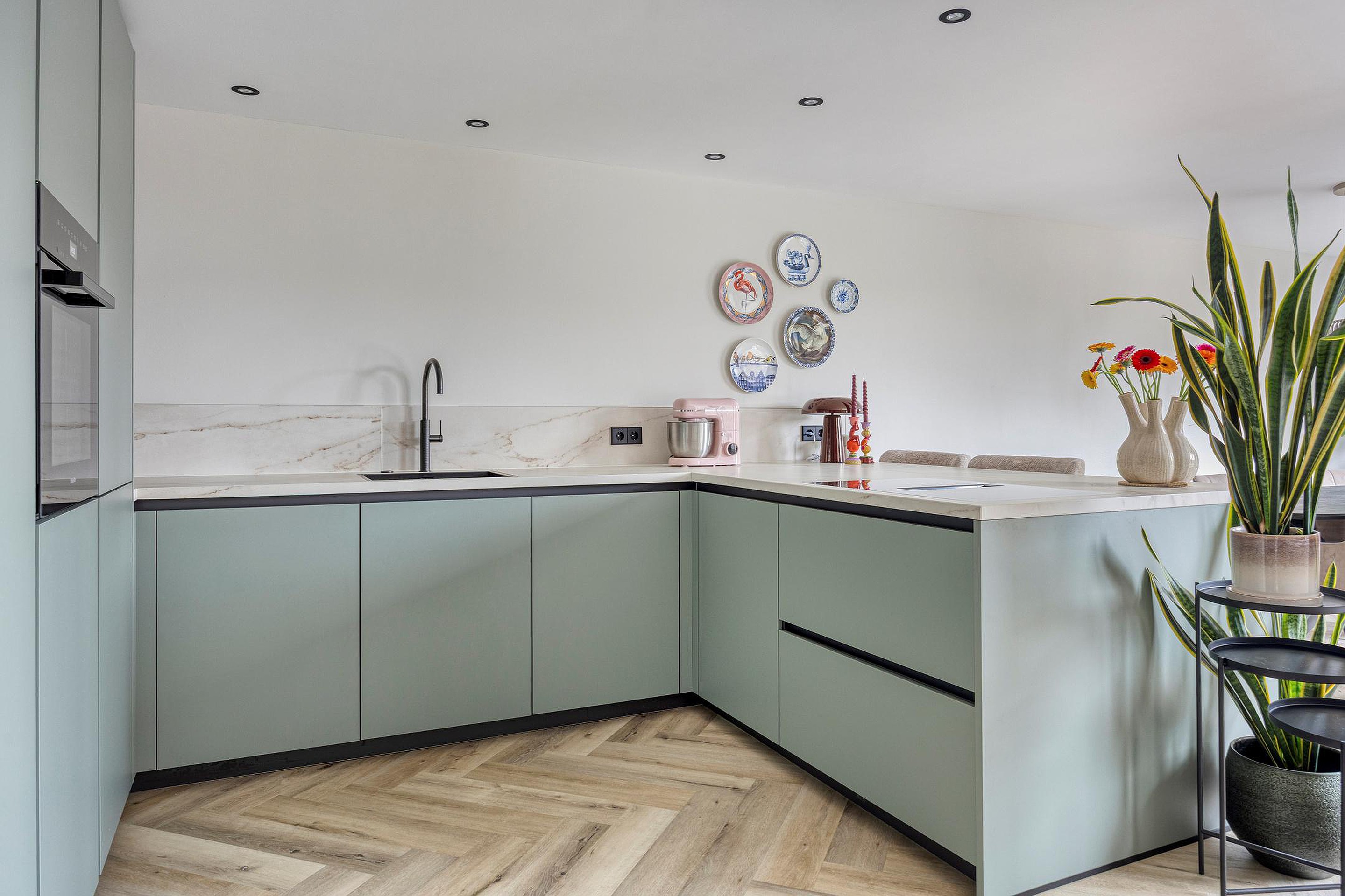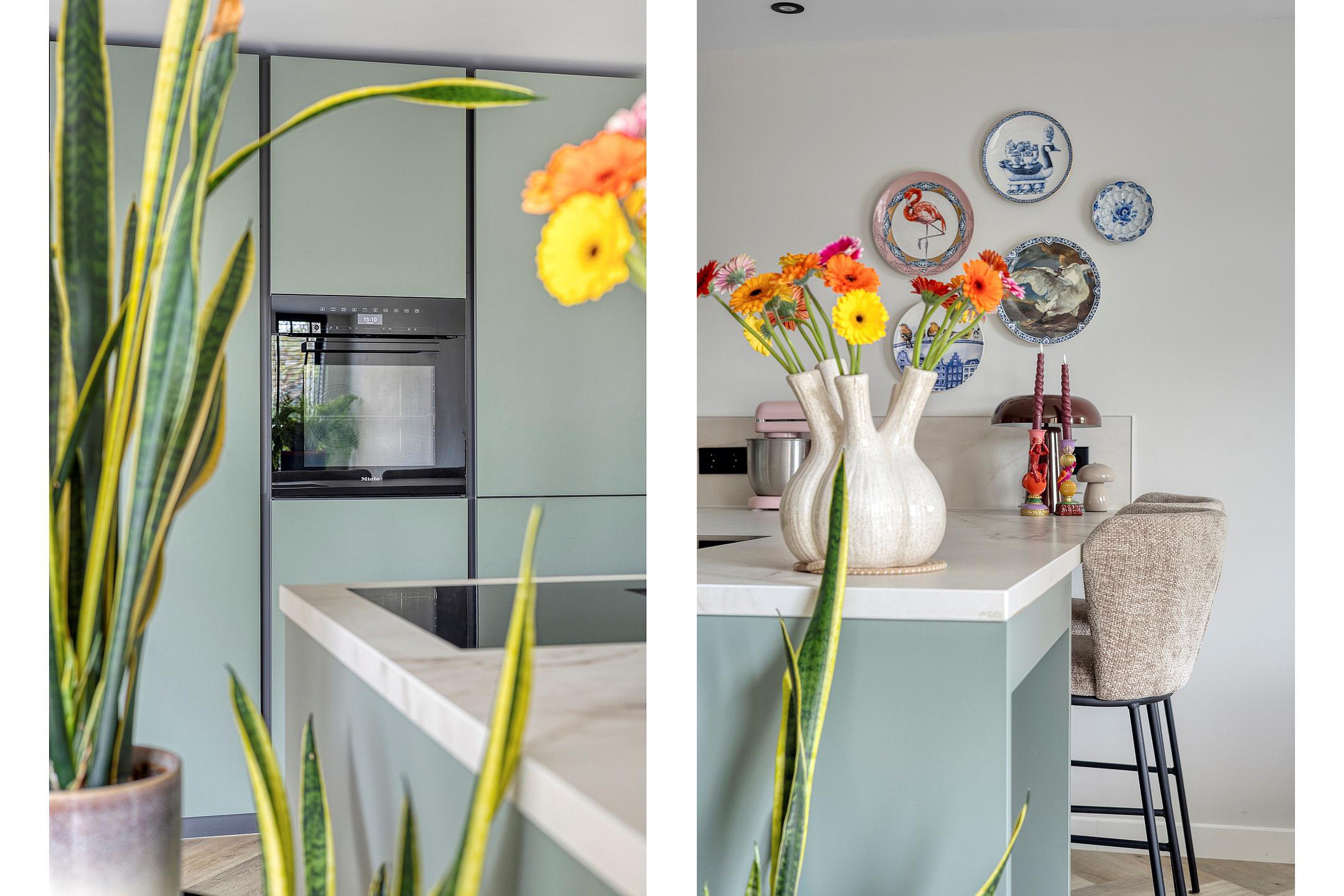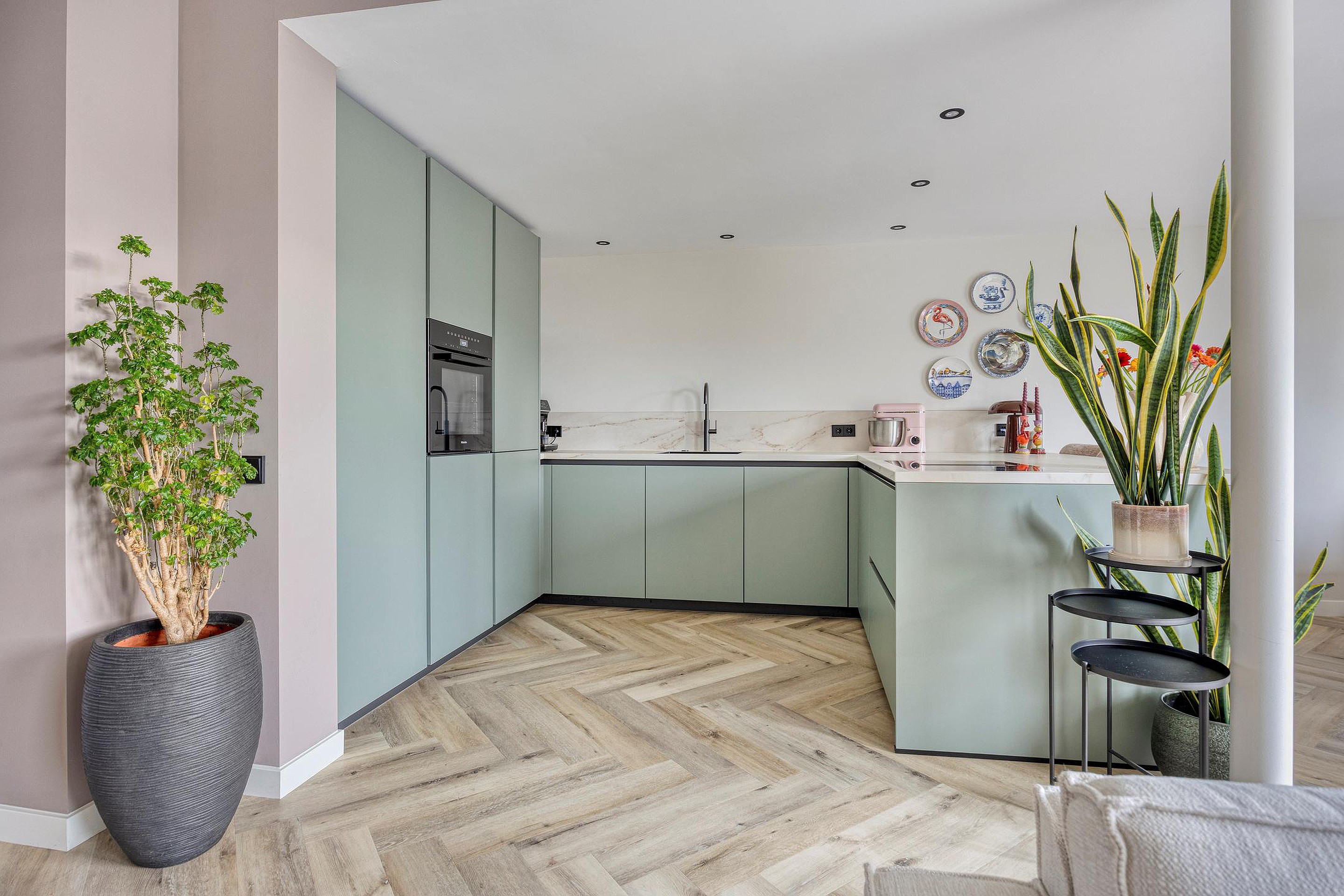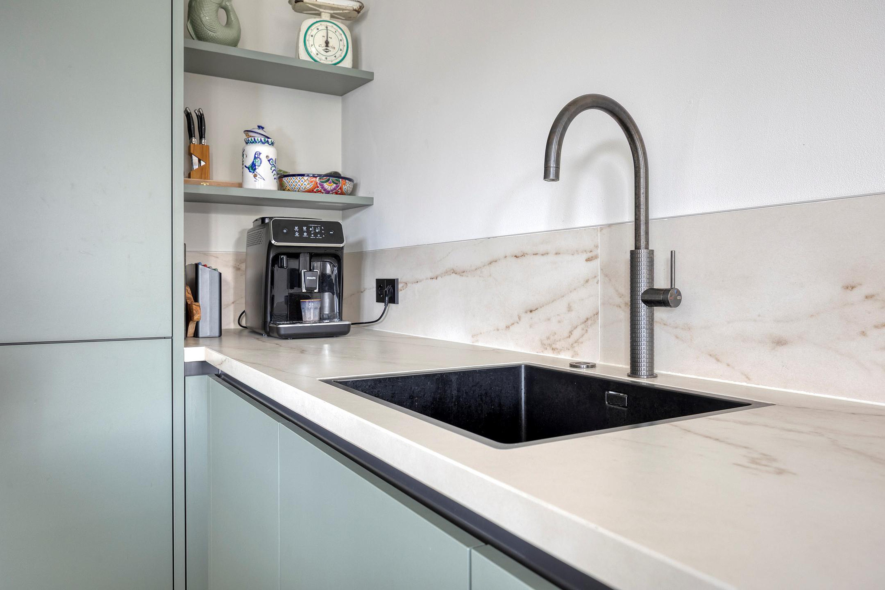 De luxe open keuken vormt het hart van de woning. Deze is uitgerust met een baropstelling, koelkast, oven, vaatwasser, een vierpits inductiekookplaat met geïntegreerde afzuiging en een kokend waterkraan. De eetruimte sluit prachtig aan op de keuken en wordt dankzij de brede schuifpui verbonden met de zonnige achtertuin.