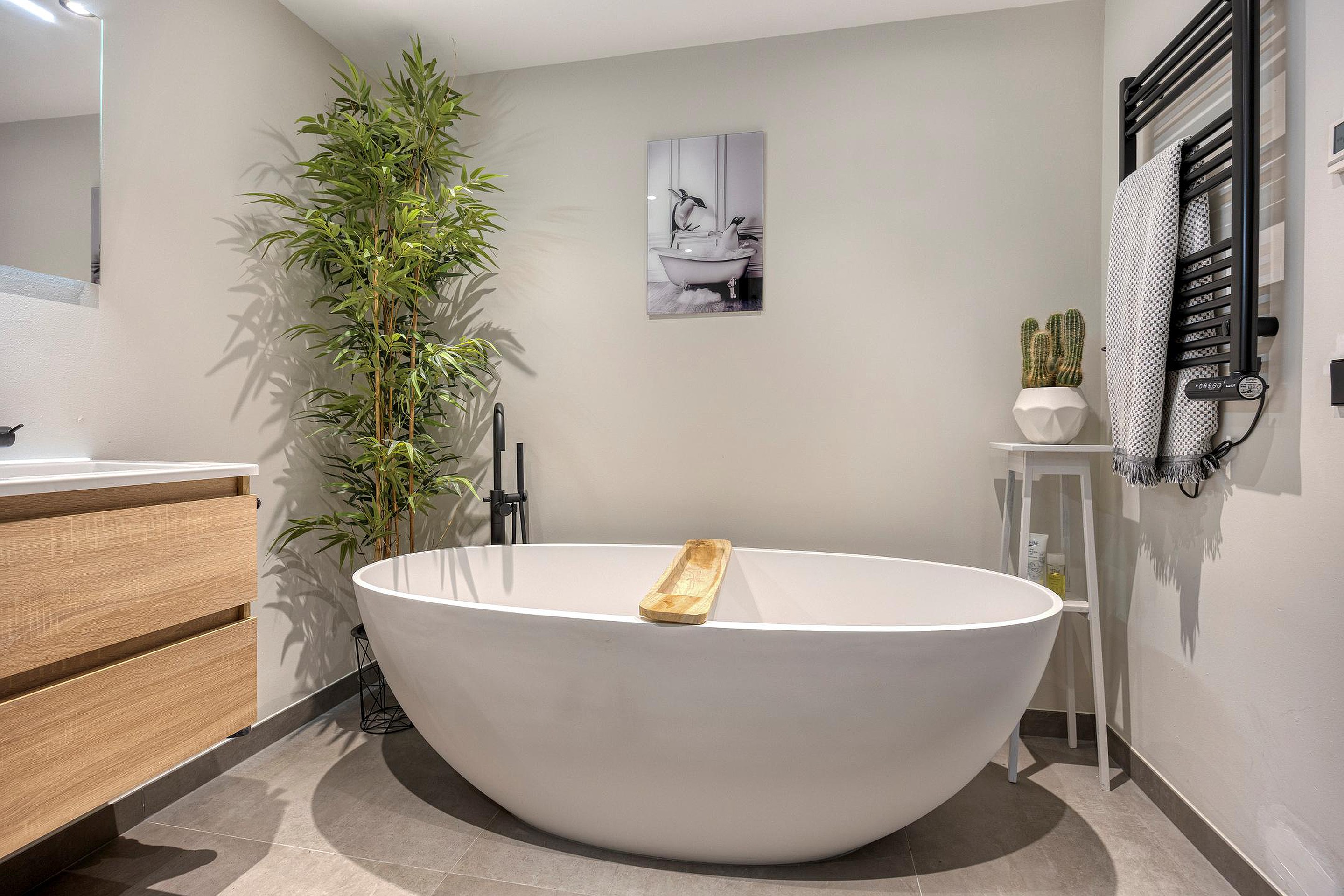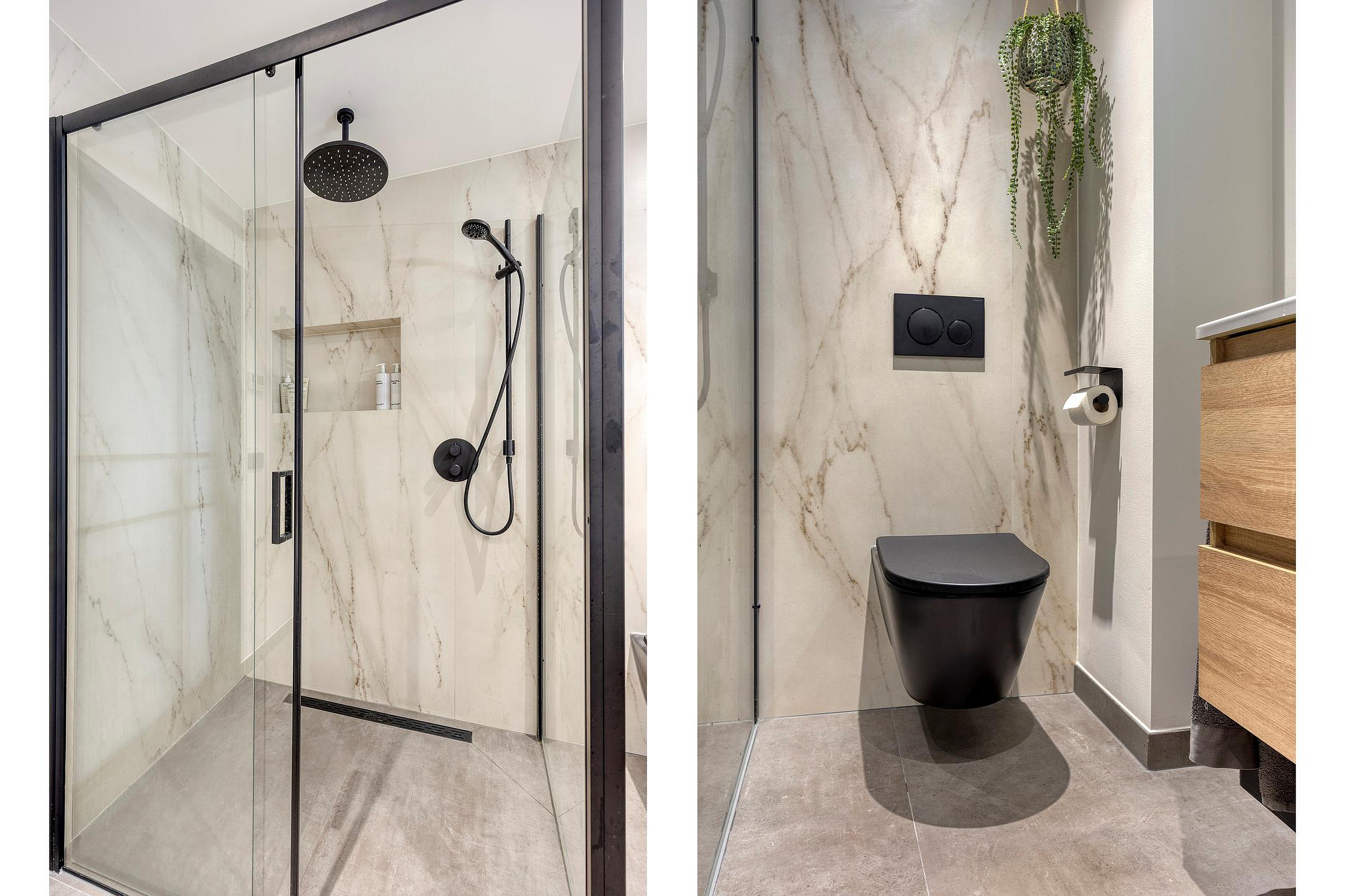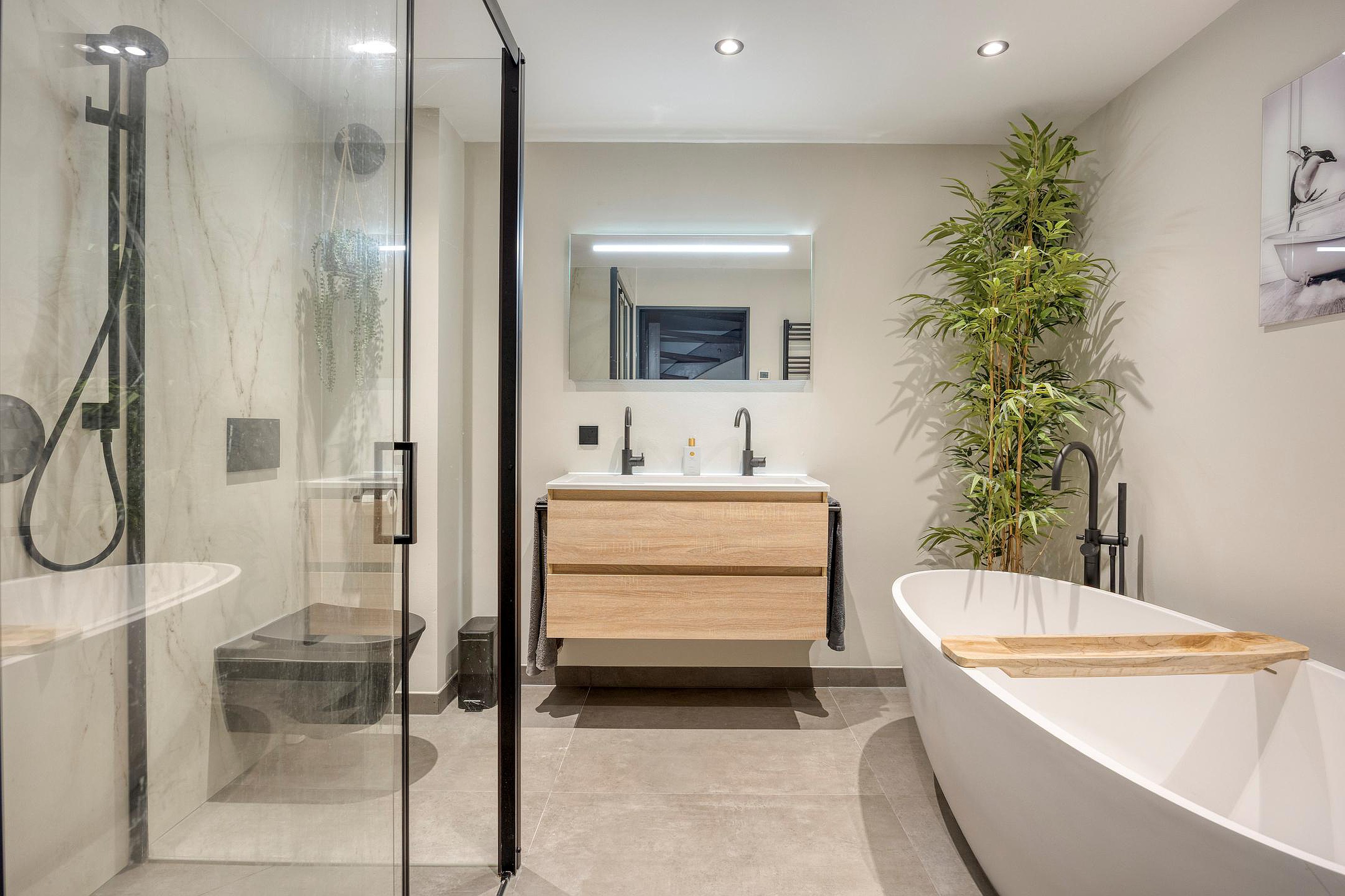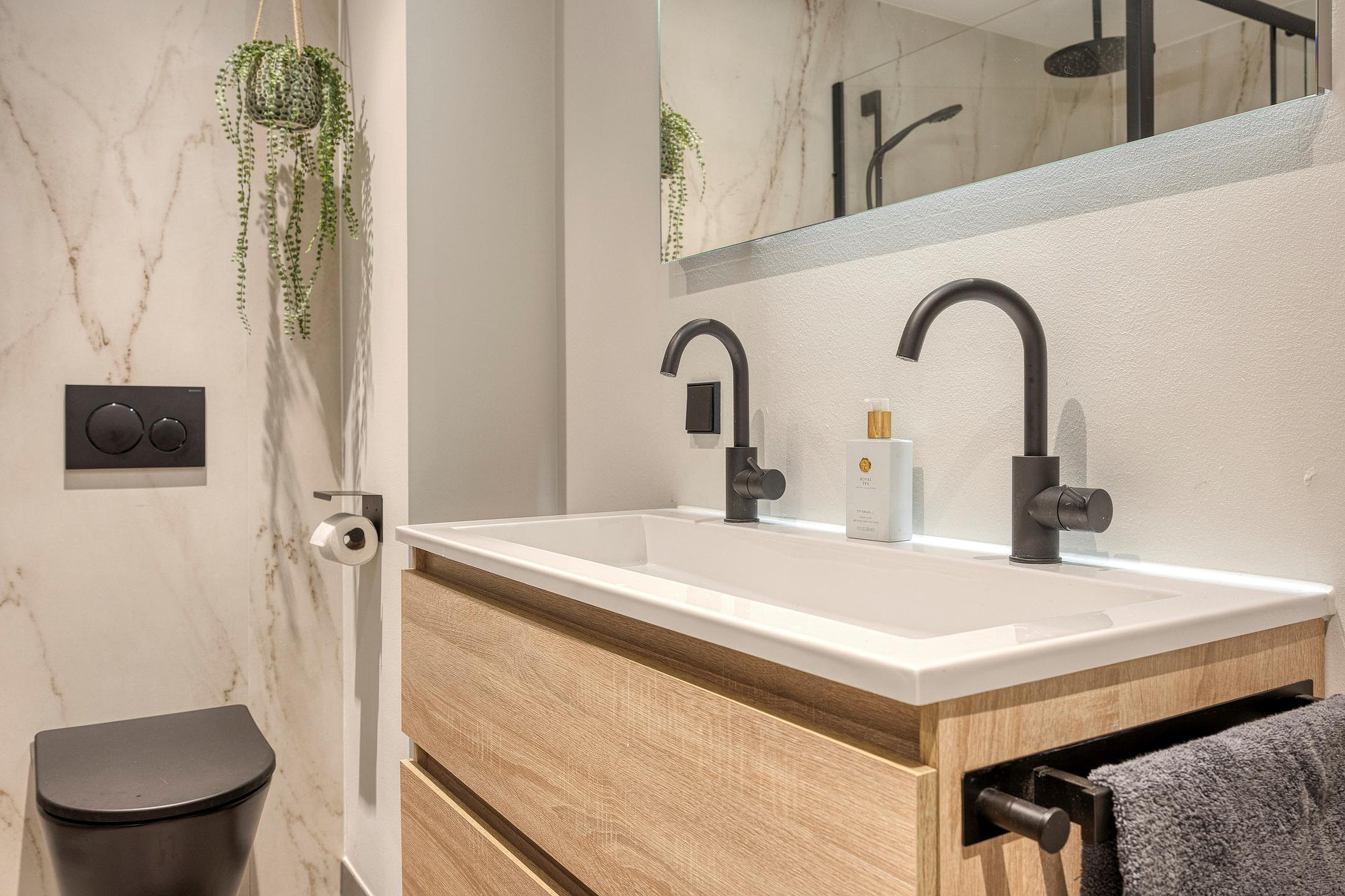 De luxe vergrote badkamer is bereikbaar via een schuifdeur en geeft toegang tot een stijlvolle ruimte met inloopdouche, toilet, modern wastafelmeubel met dubbele kraan, losstaand bad en wederom vloerverwarming voor optimaal comfort.
