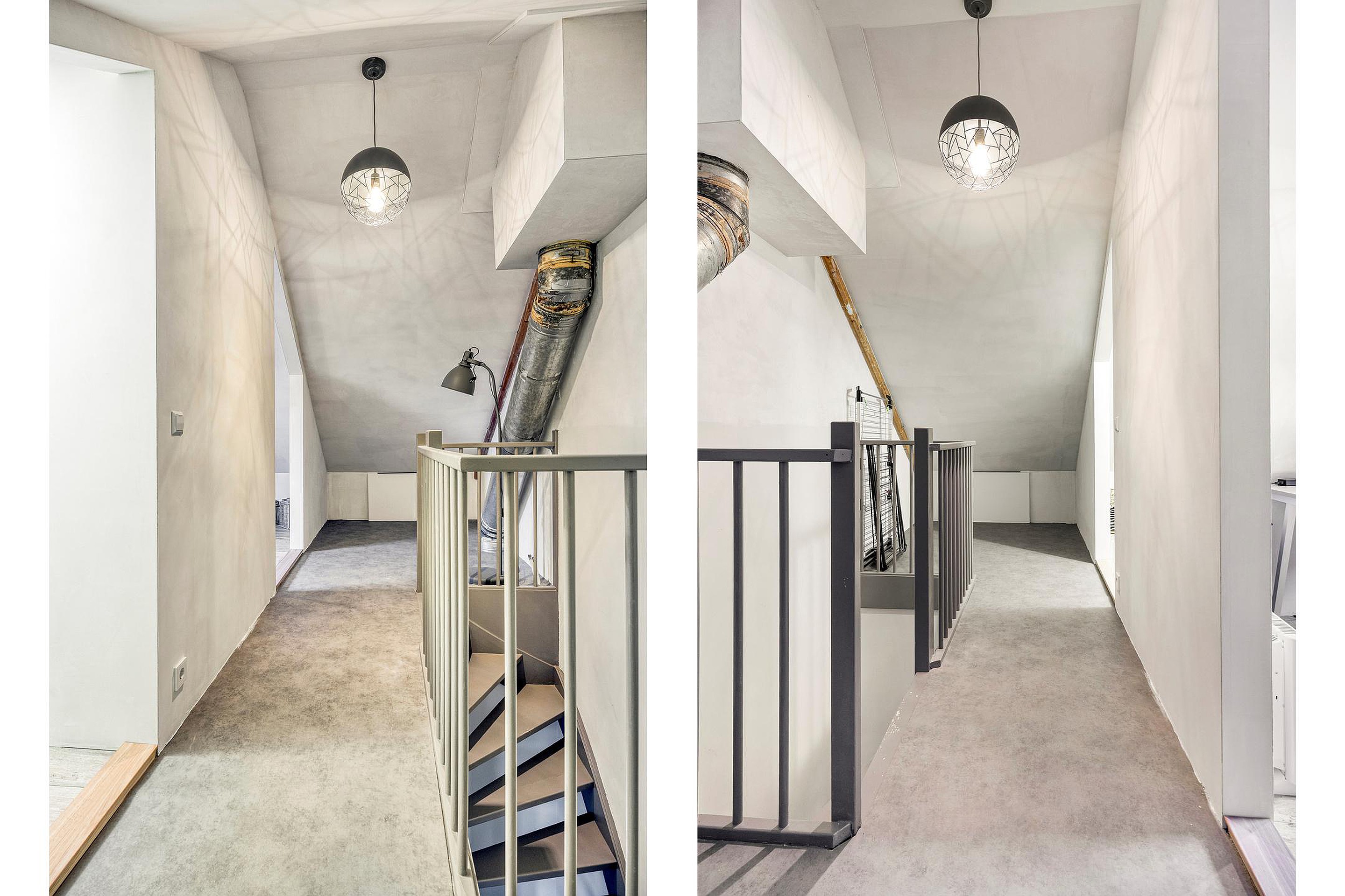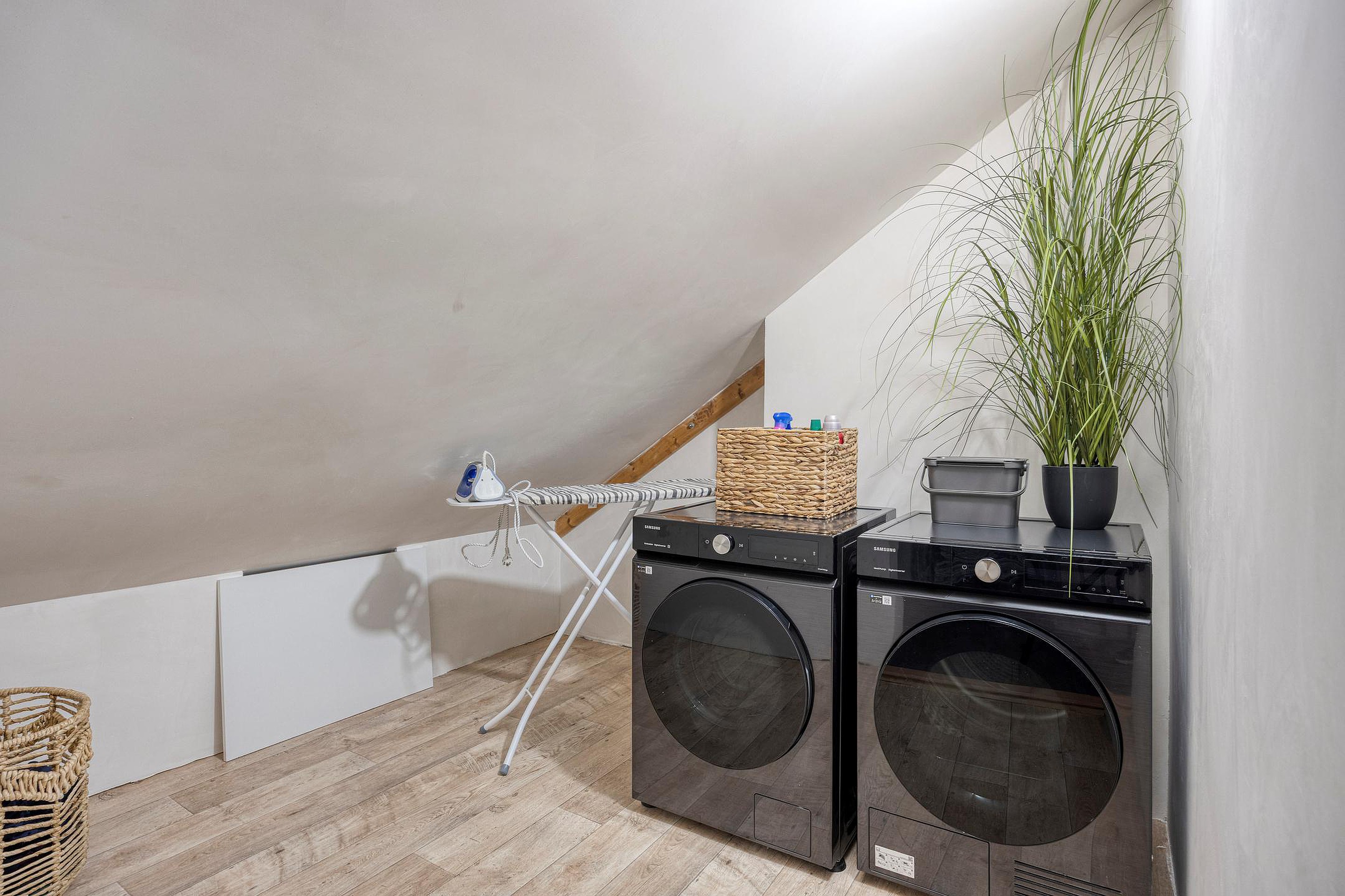 Tweede verdieping De tweede verdieping biedt een ruime overloop met een aparte wasruimte en een derde slaapkamer, eveneens volledig gestuukt en keurig afgewerkt. Deze verdieping zou vergroot kunnen worden door het plaatsen van een dakkapel.