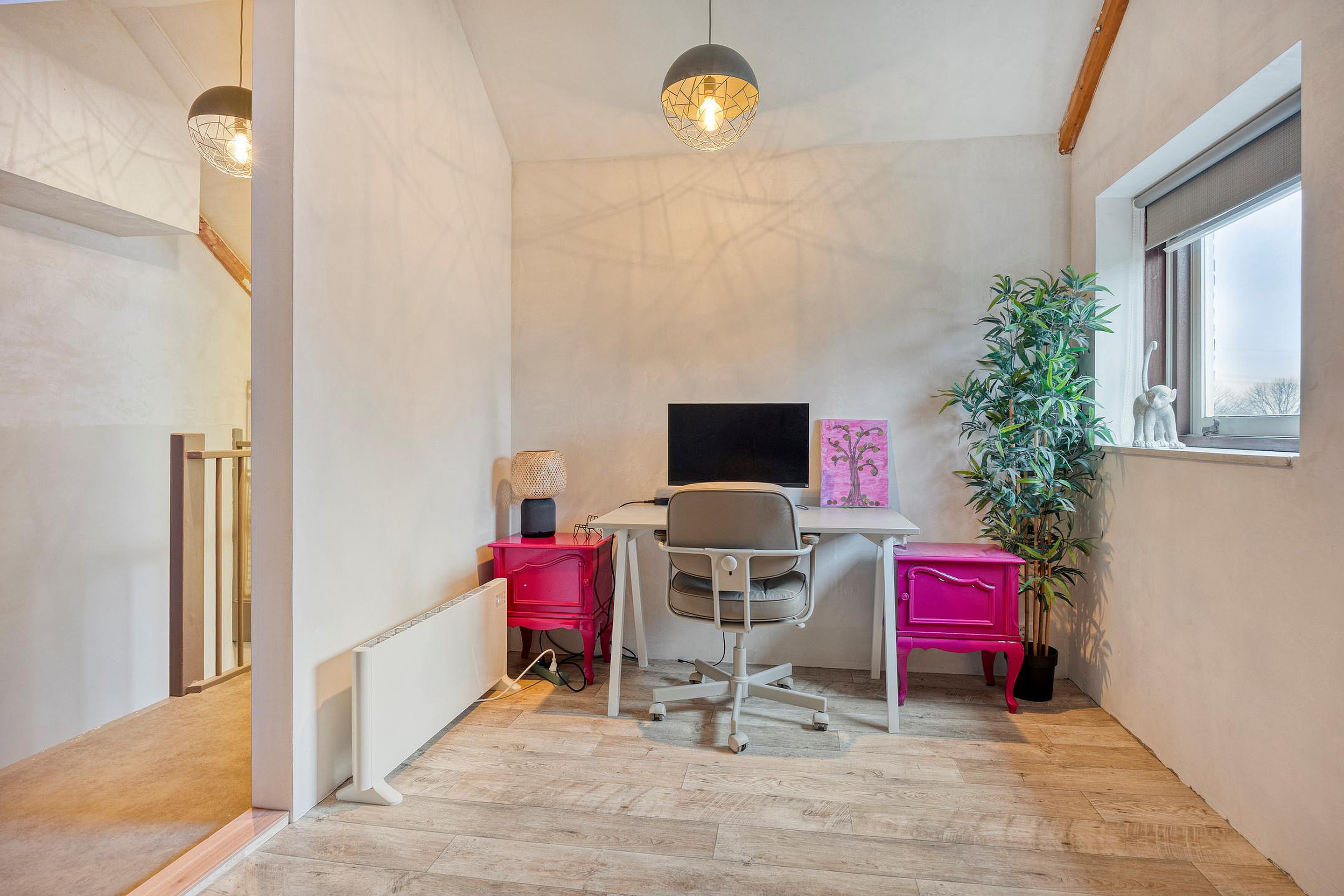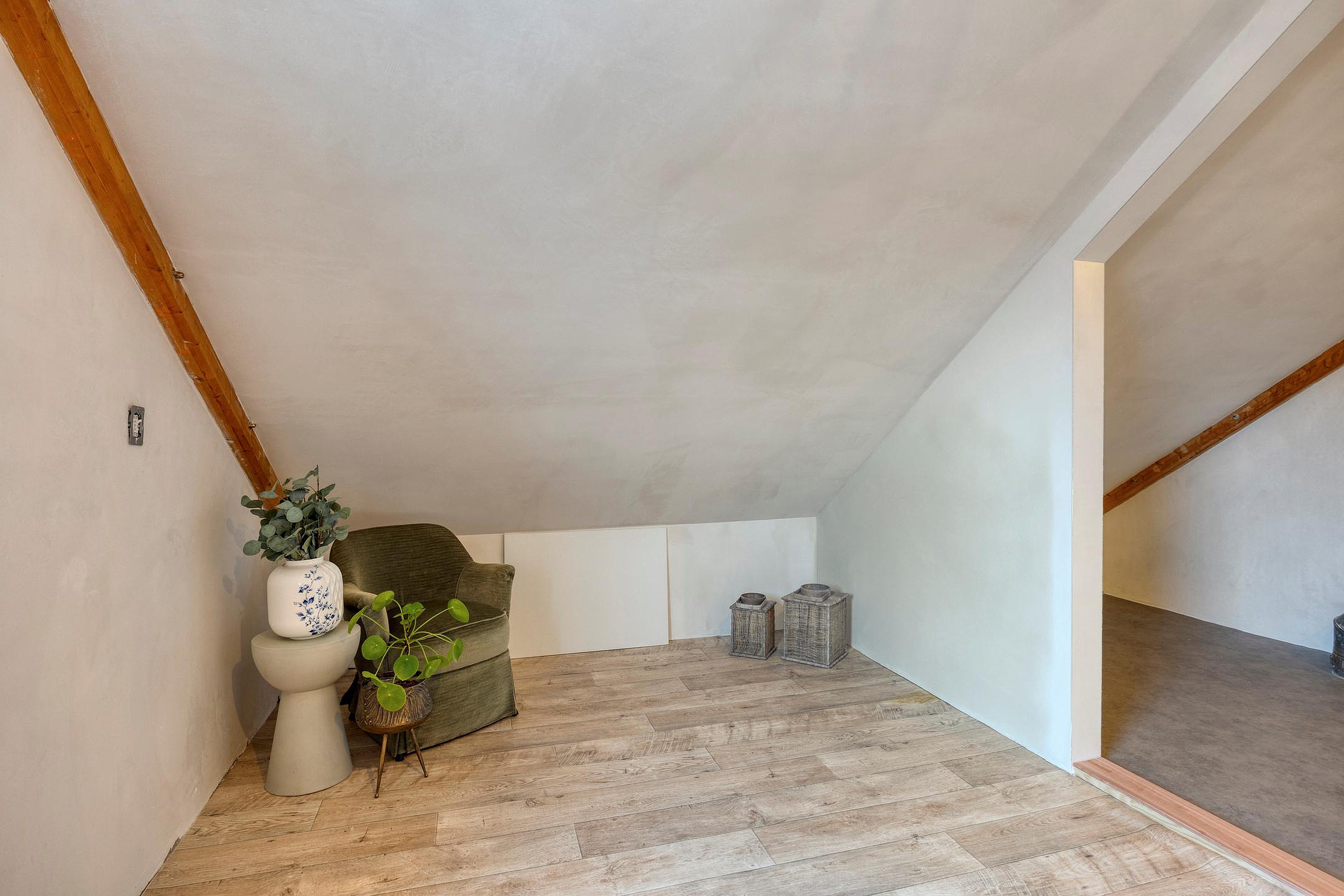 De lichte, strak gestuukte woonkamer is uitgerust met een fraaie pvc-vloer met vloerverwarming en beschikt nog over de originele aansluiting voor een open haard. De trapkast biedt praktische opbergruimte. Vanuit de woonkamer leidt een stijlvolle stalen deur naar de voormalige garage, waarvan een gedeelte is omgetoverd tot een functionele bijkeuken met keukenblok en grote vriezer.