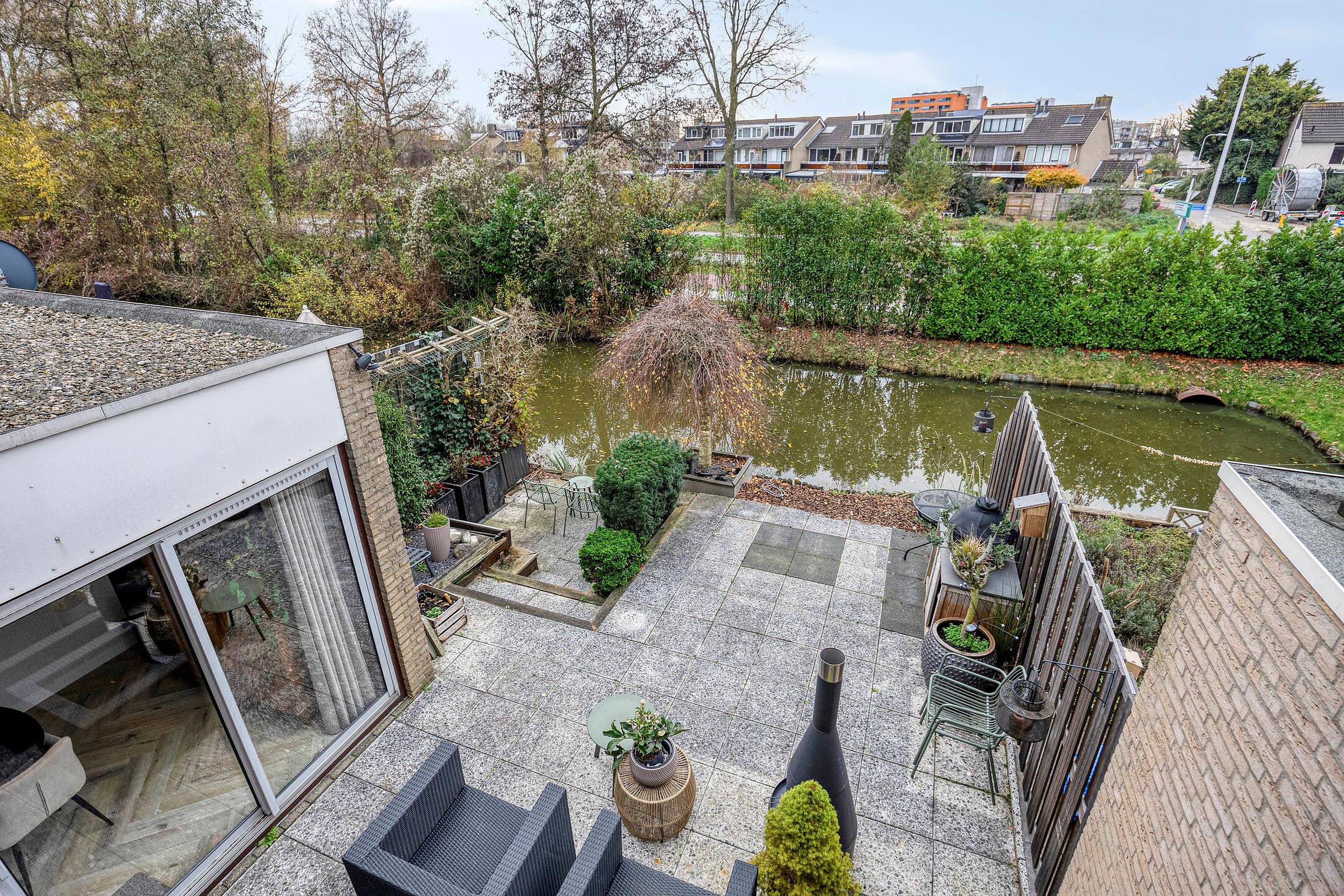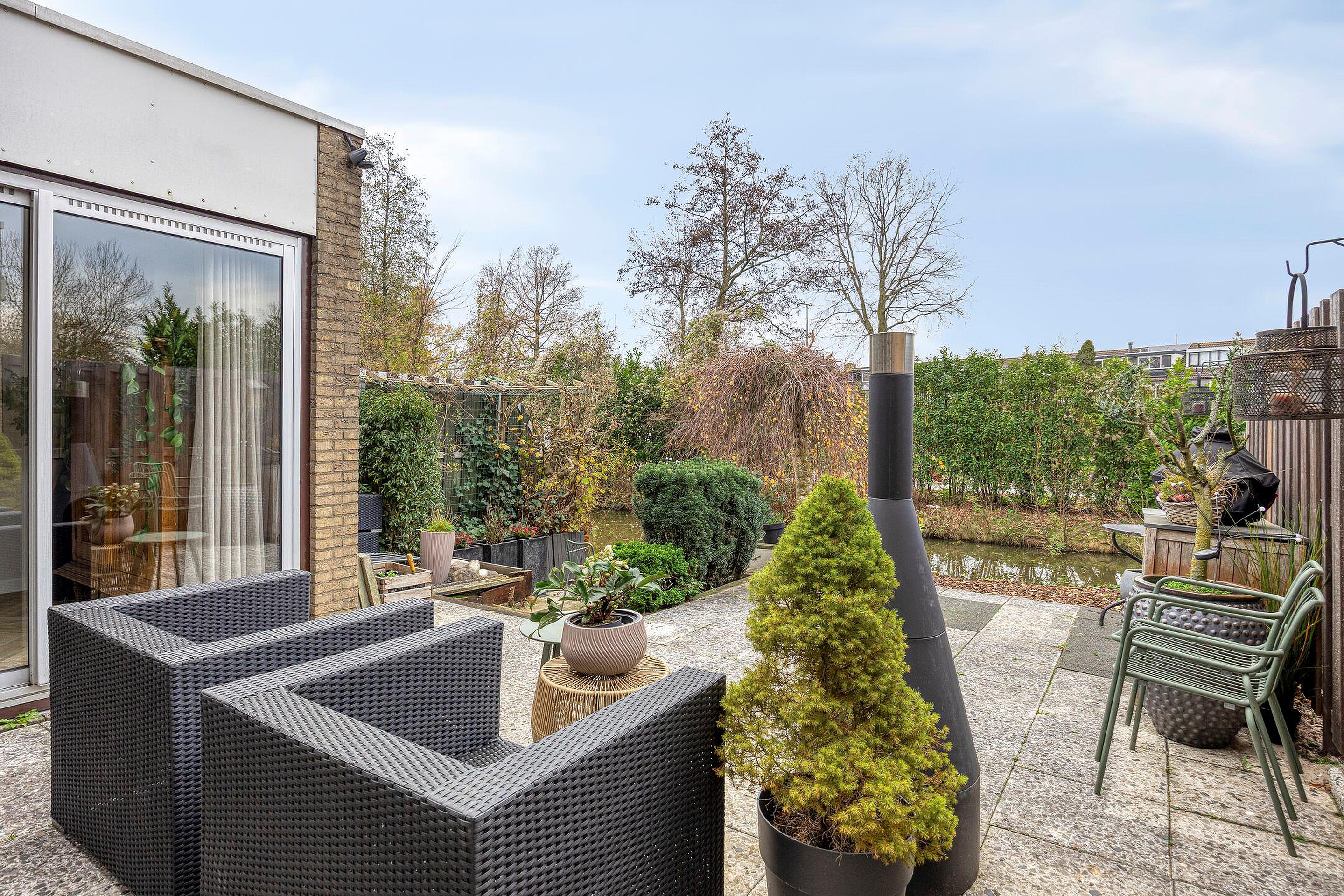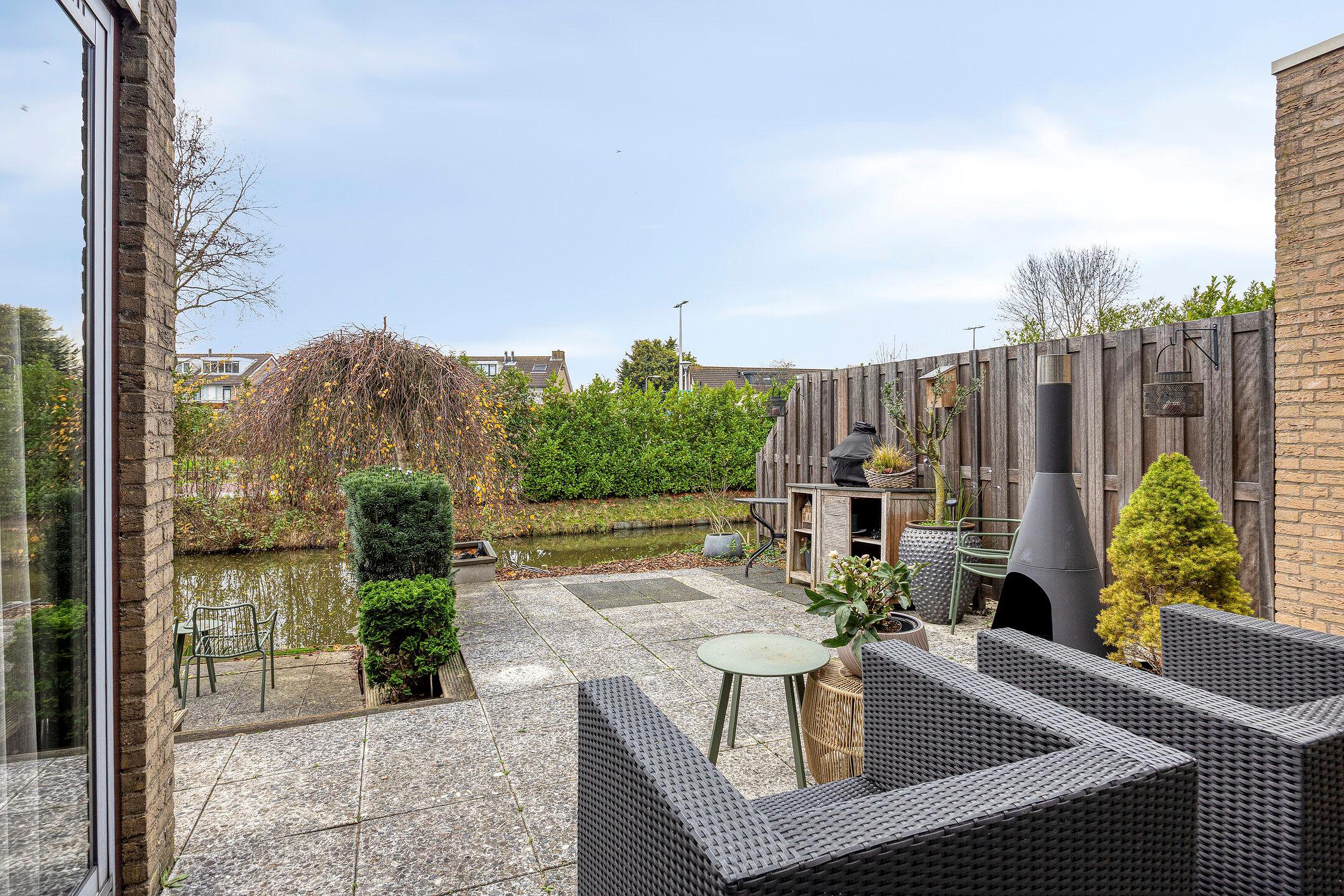 De achtertuin, gelegen op het zuidwesten is bereikbaar via de schuifpui vanuit de woonkamer en de schuifpui vanuit het eetgedeelte. De tuin ligt direct aan het water, biedt rust, privacy en volop zon, met verschillende terrassen waarvan een aan het water.