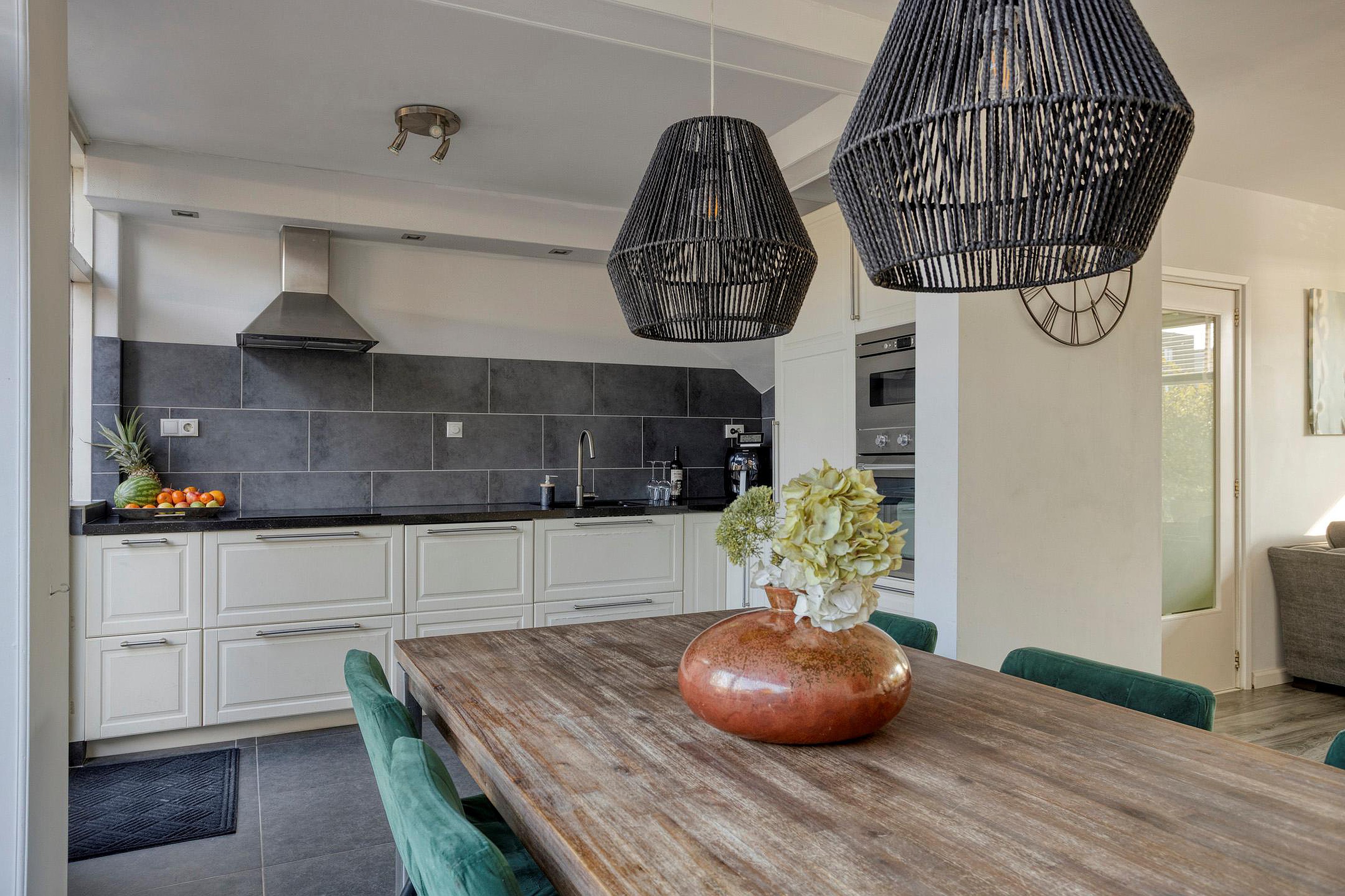 Keuken, gelegen aan de achterzijde, voorzien van een tegelvloer en een keukenblok in L-vormige opstelling met een fraai graniet werkblad. Verder is de open keuken uitgerust met een inductiekookplaat met rvs-afzuigkap, koel-vriescombinatie, vaatwasser, oven en een magnetron.