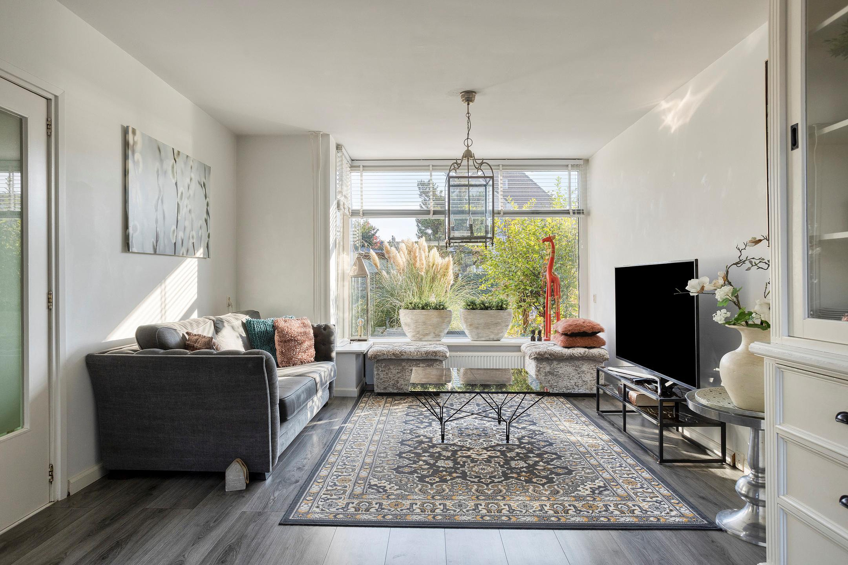 De doorzon woonkamer met erker aan de voorzijde is ruim en licht. Vanuit de woonkamer is er toegang tot de keuken.