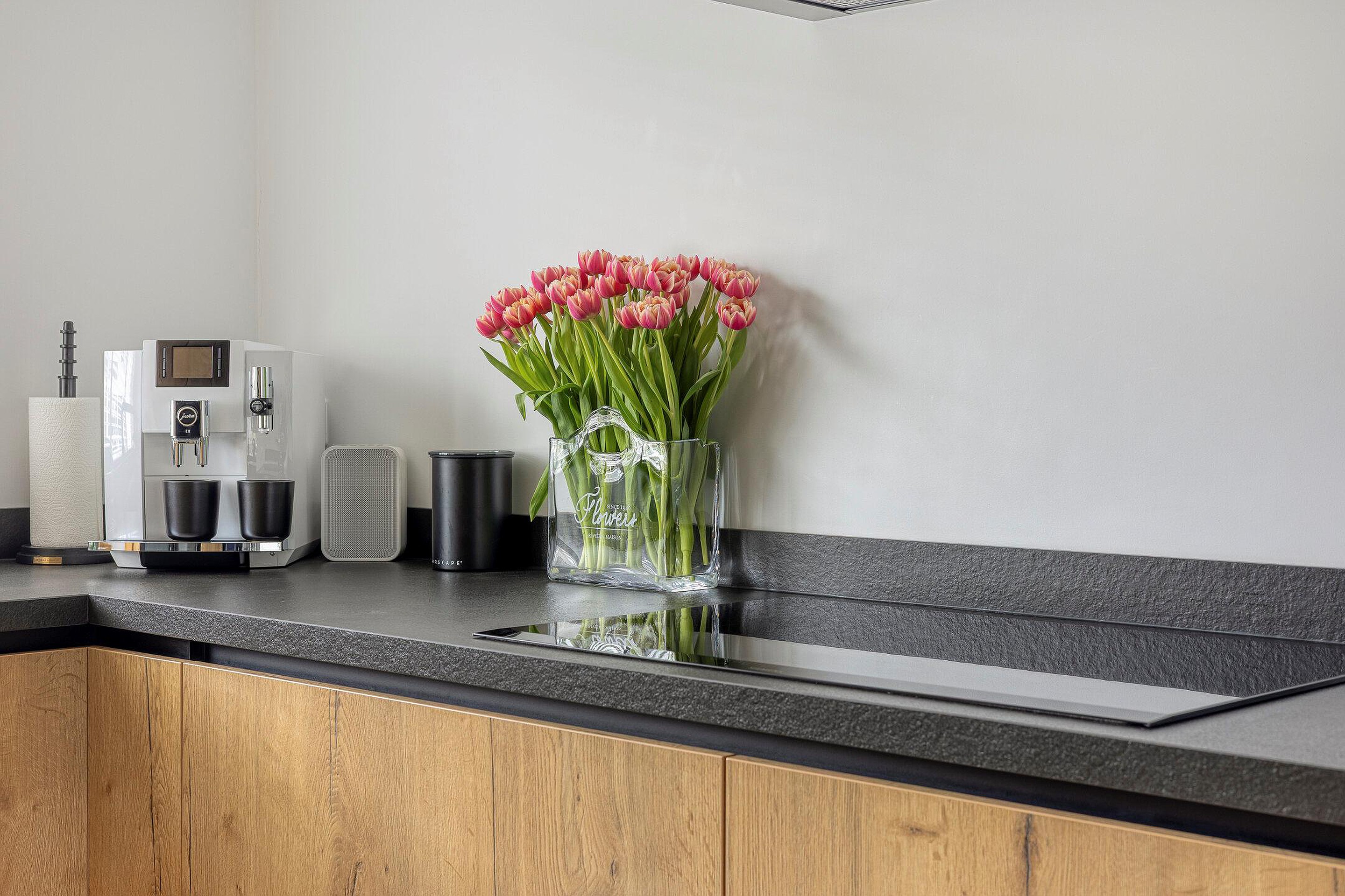 U-vormige opstelling. De keuken is uitgerust met divers hoogwaardig Siemens apparatuur: een inductiekookplaat met afzuigkap, combimagnetron, stoomoven, vaatwasser, koel-vriescombinatie (merk: Liebherr) en een Quooker (koud/warm/kokend water). Daarnaast biedt de keuken diverse grote lades en veel kastruimte; ideaal!