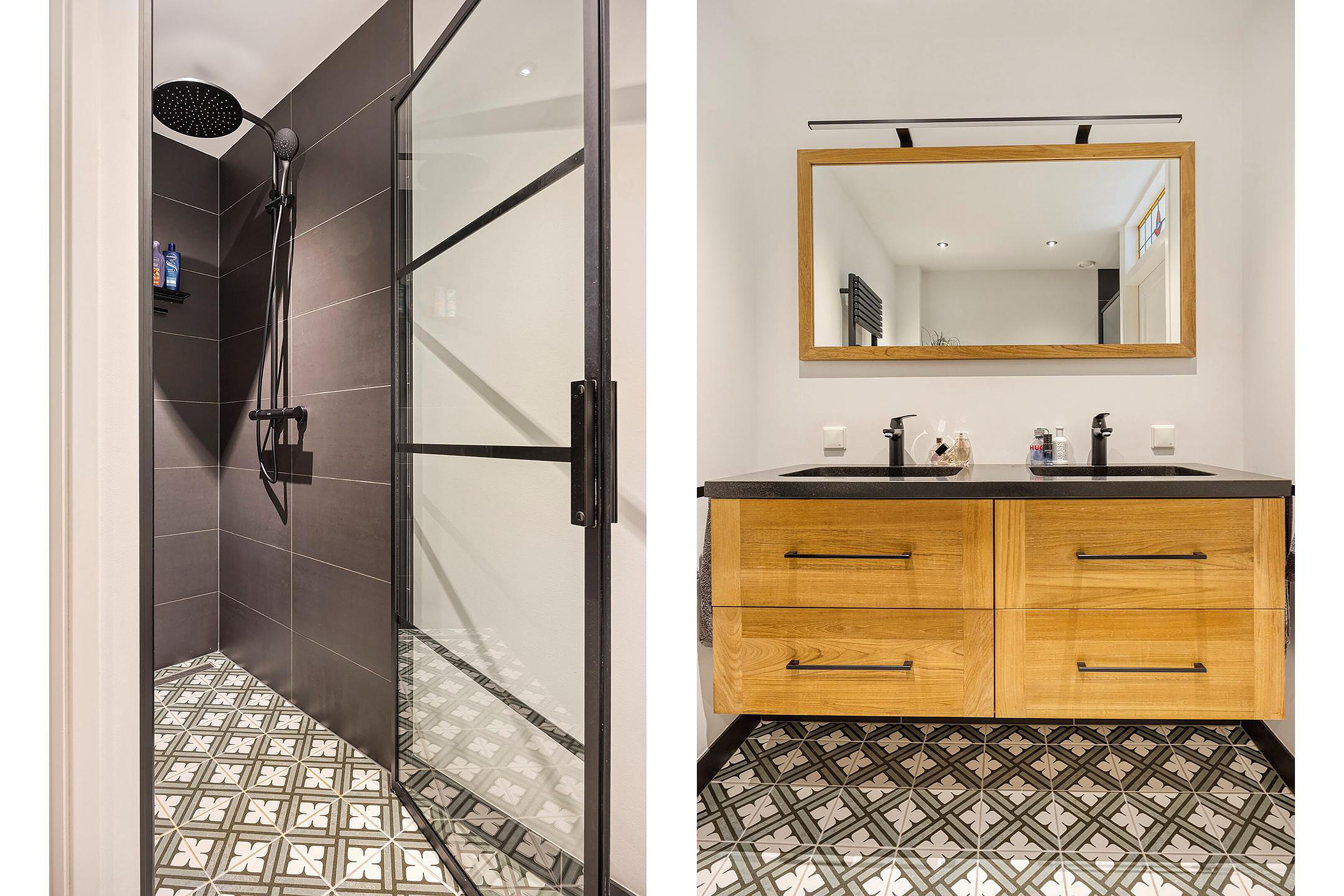 Badkamer (2019), een ruime en chique badkamer! Voorzien van een inloopdouche met thermostaatkraan, rainshower en handdouche, een dubbele wastafel met onderladen en grote spiegel met verlichting, een tweede toilet, mechanische afzuiging en een badkamerradiator.