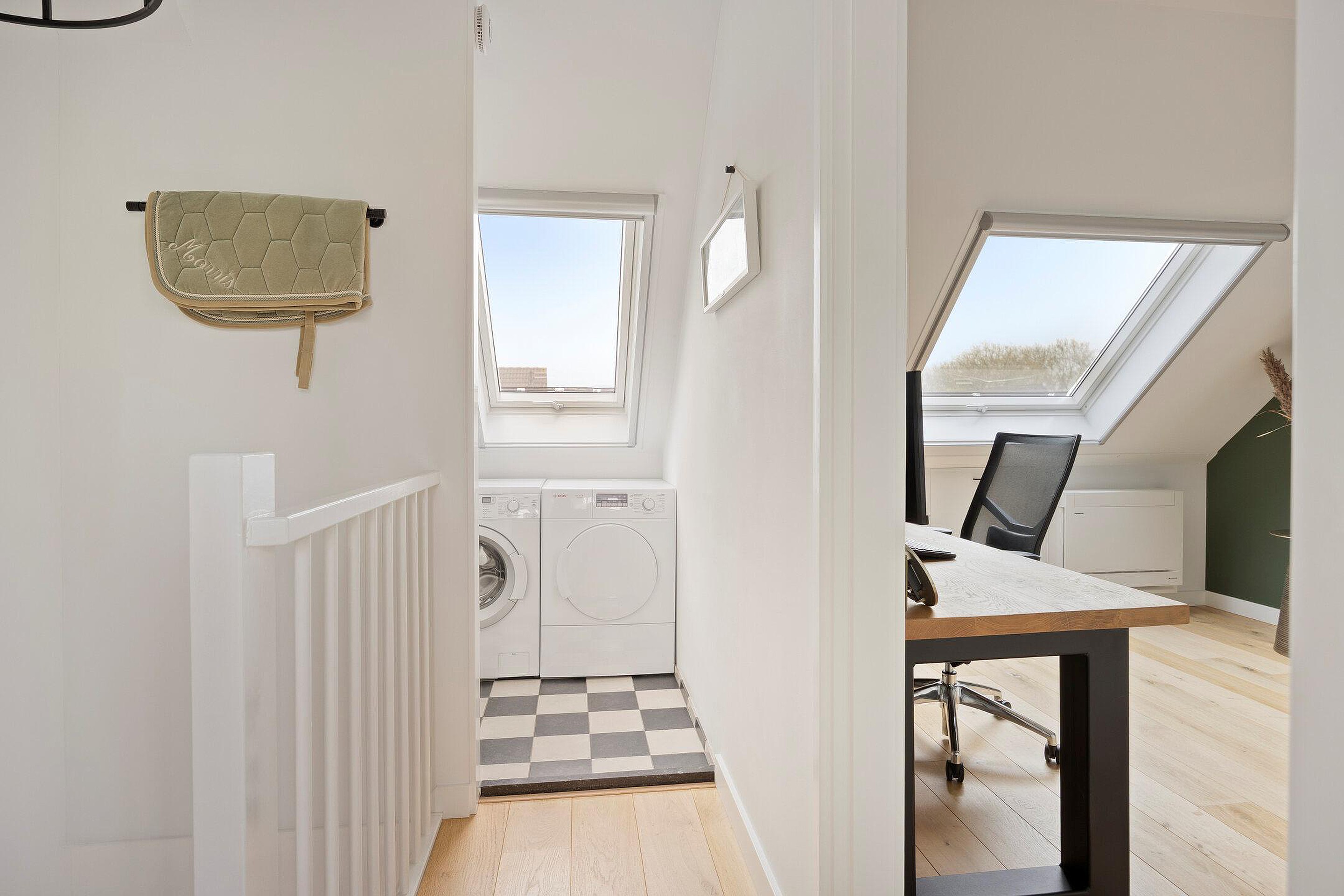 Overloop, voorzien van een Velux dakraam met zonwering en vliegenhor, een wasmachine- en drogeraansluiting en de opstelling van de cv-ketel en mechanische ventilatie-unit. Daarnaast biedt de overloop toegang tot twee slaapkamers en de bergvliering.