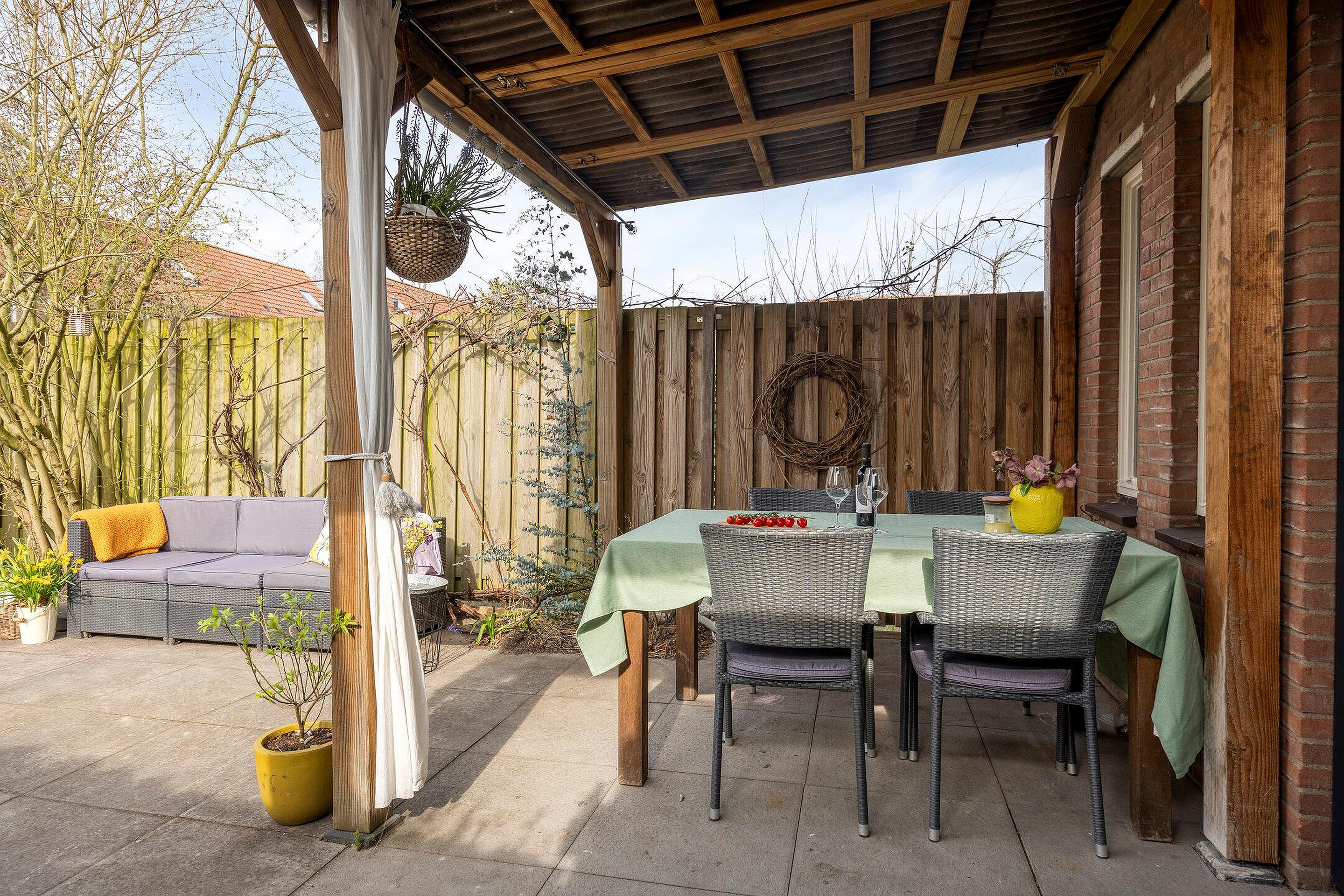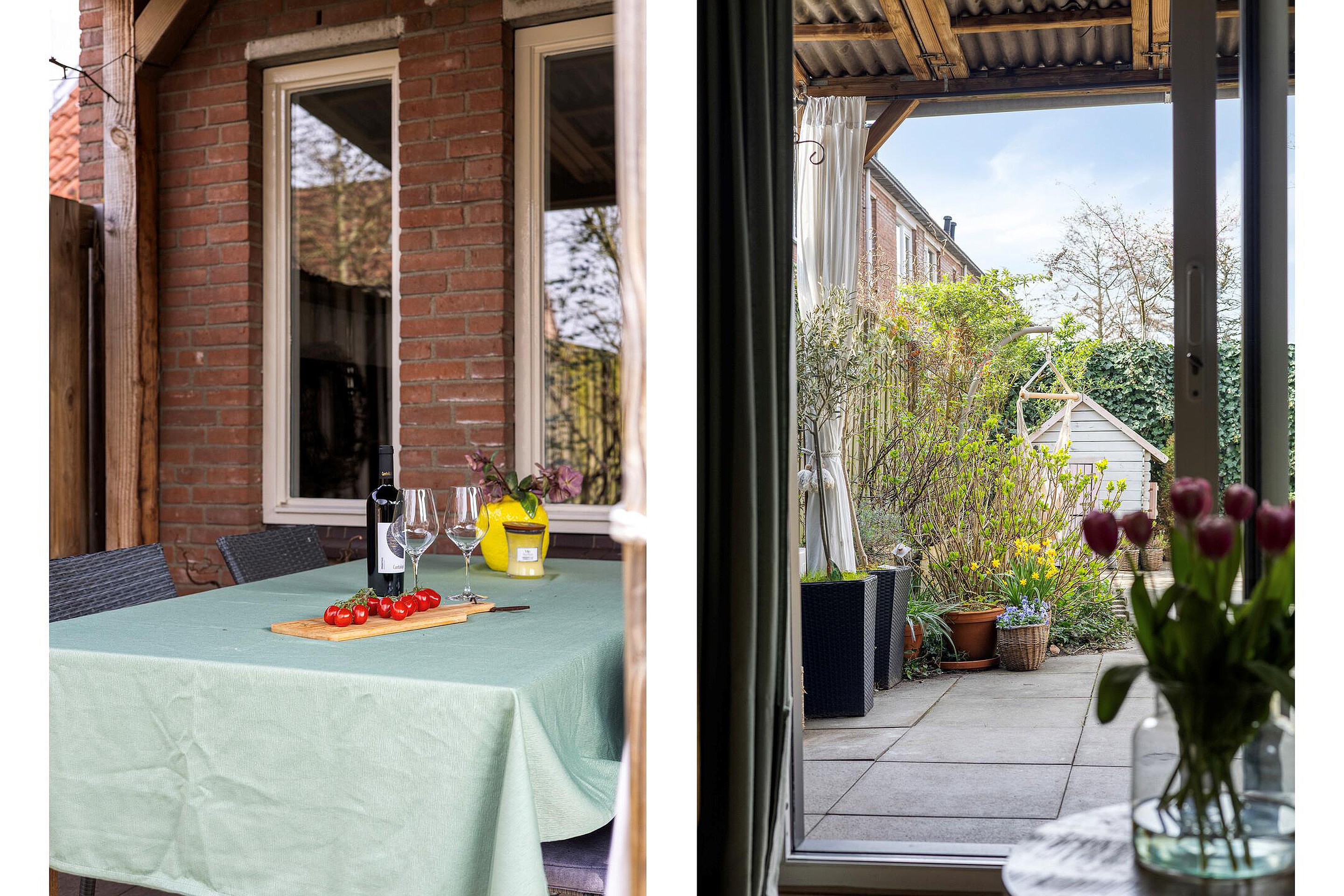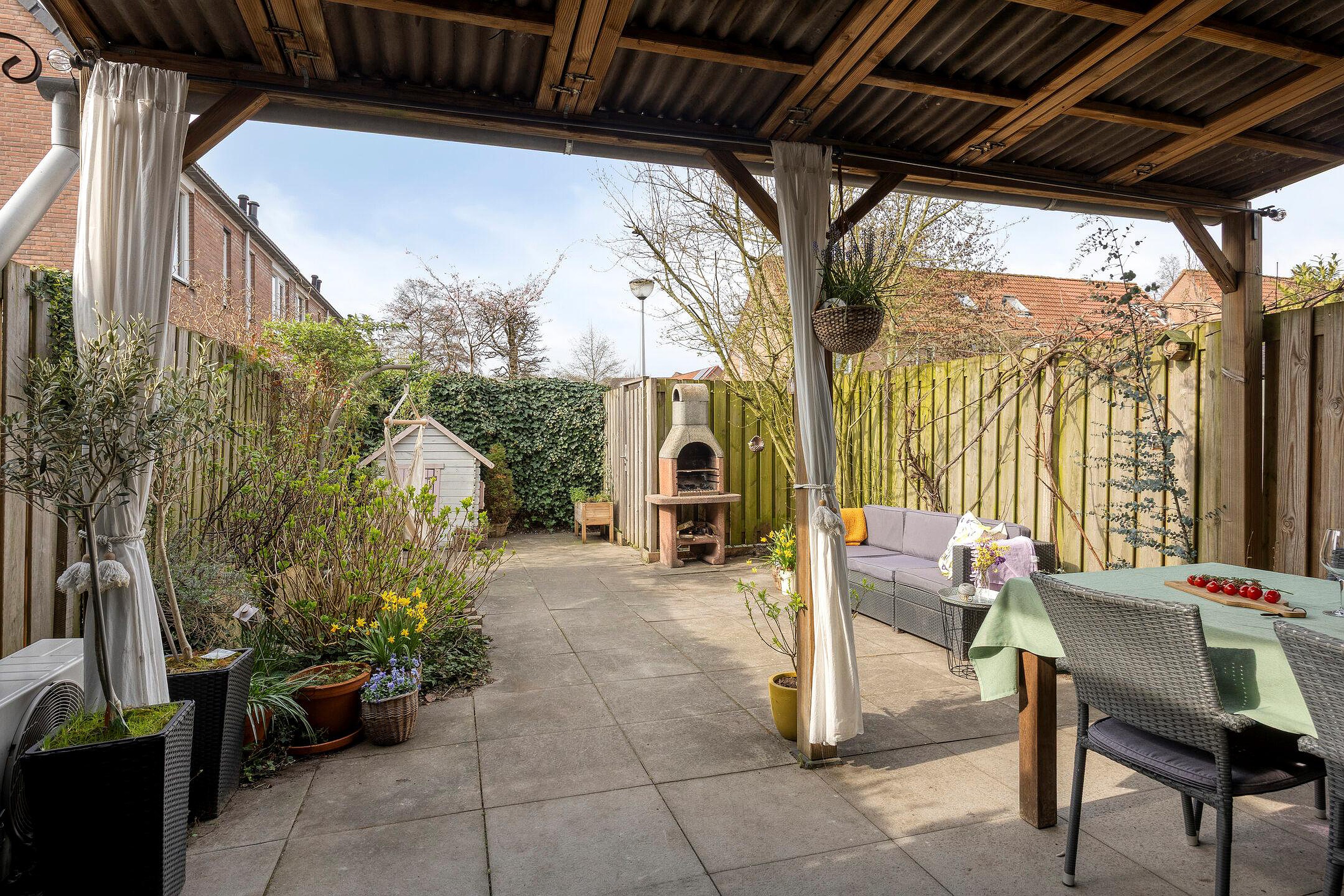 Achtertuin, gelegen op het zuidoosten, voorzien van bestrating en groen. Verder is de achtertuin uitgerust met een heerlijke overkapping, een tuinberging en een zij-uitgang.