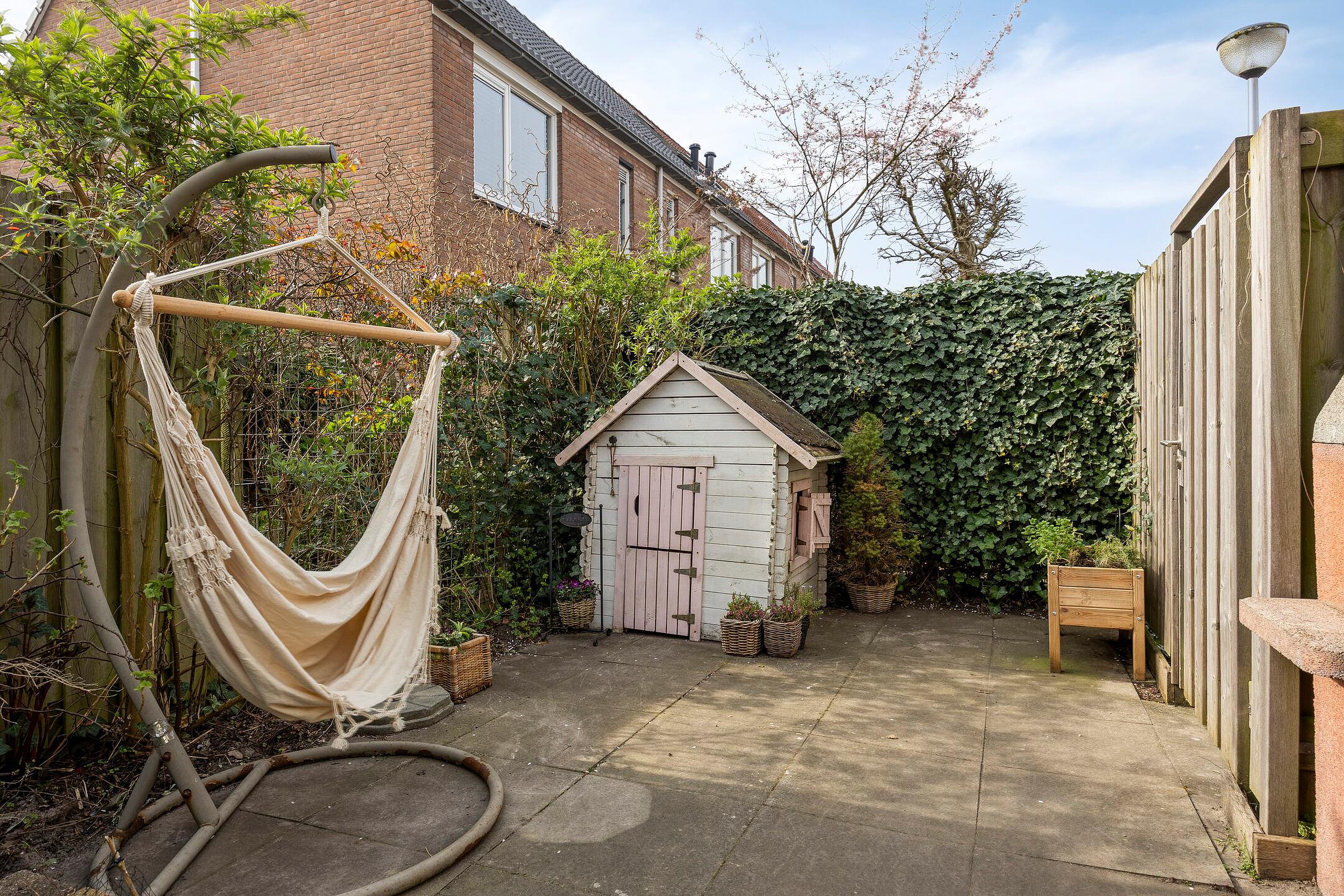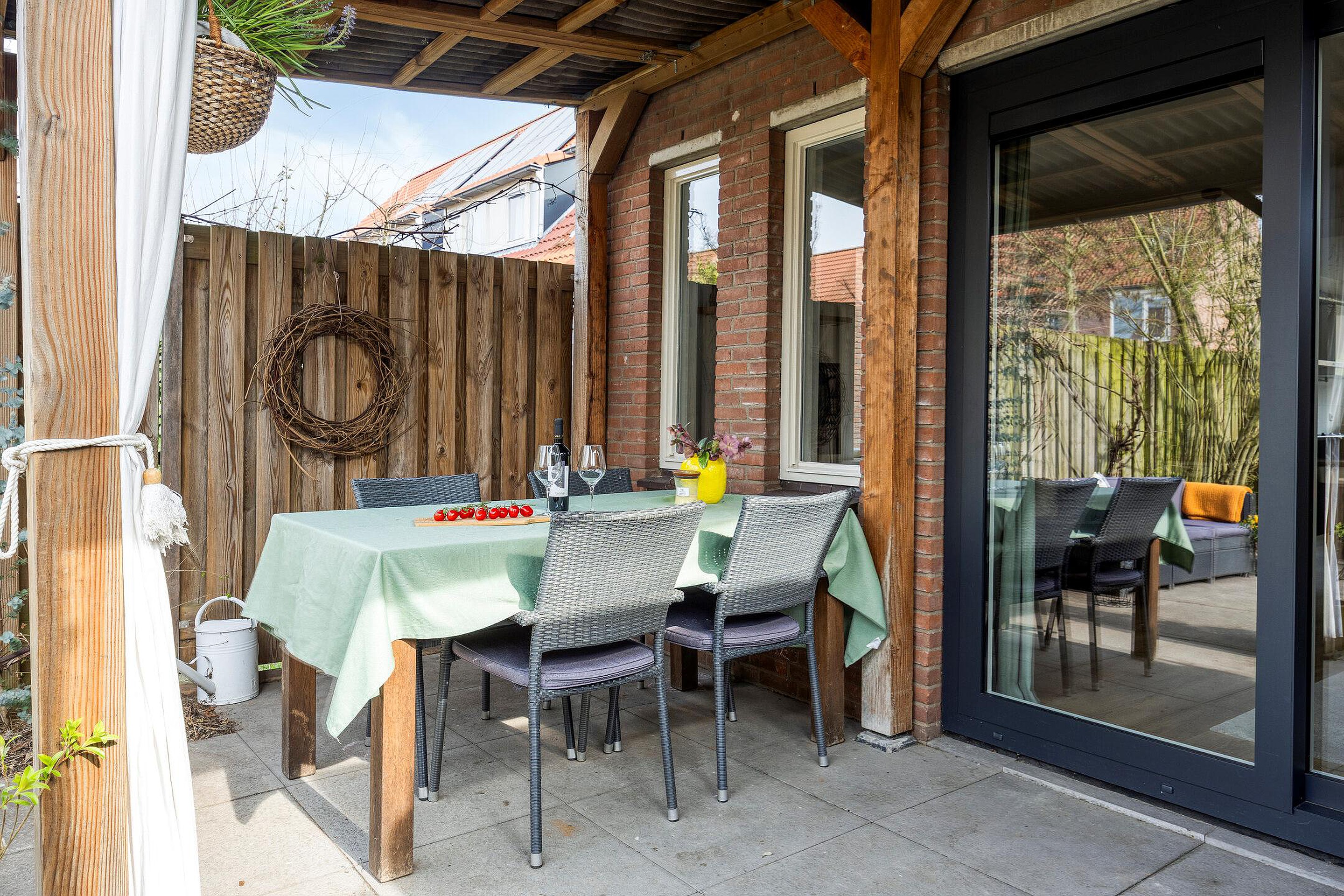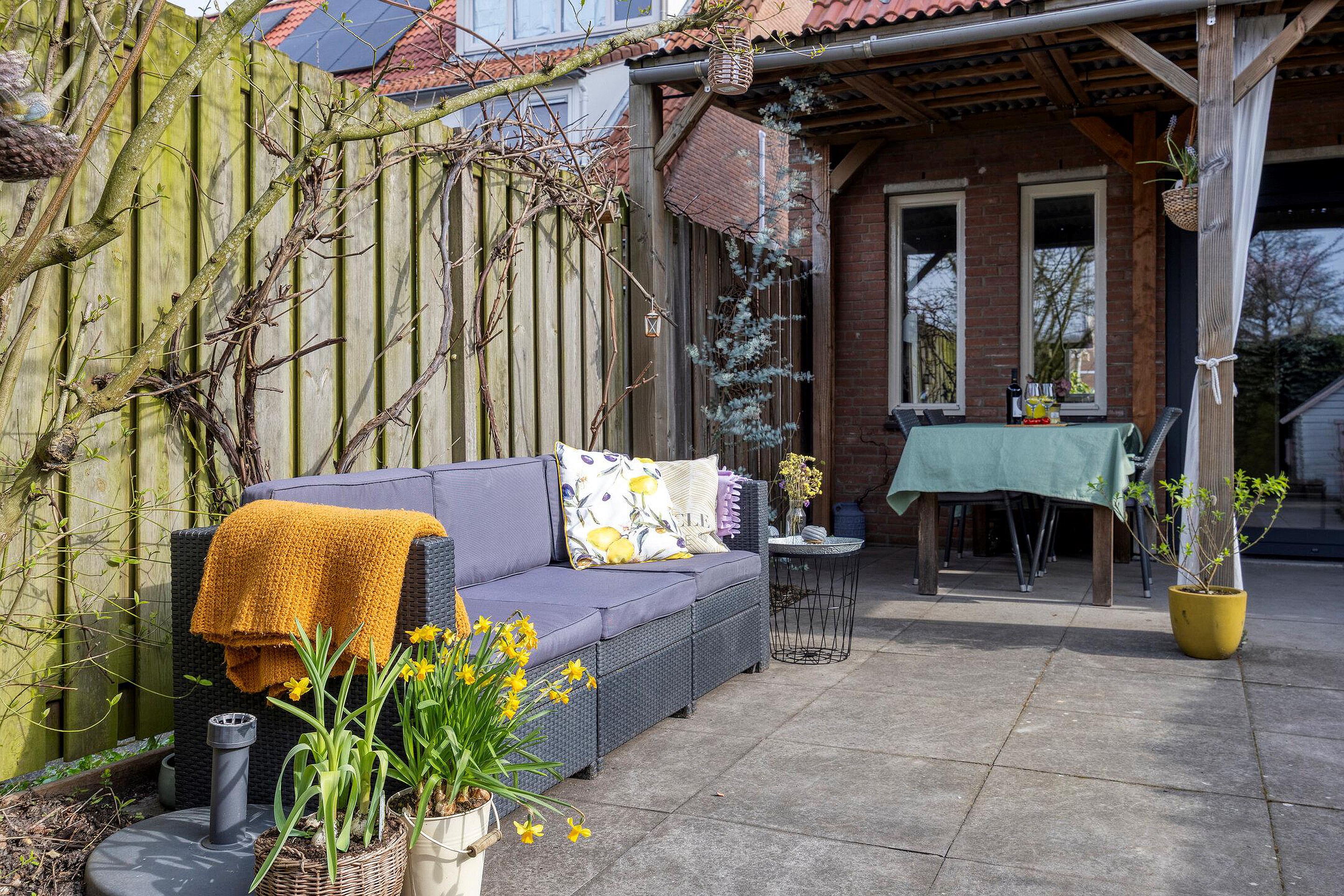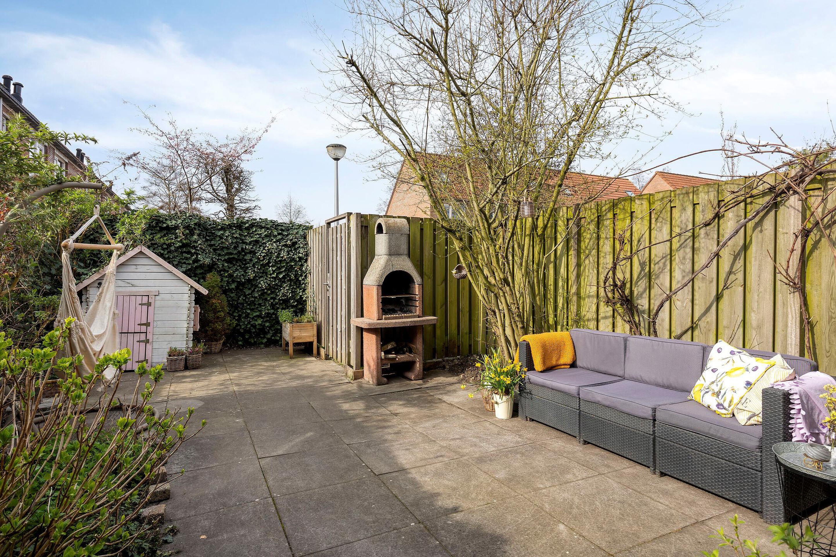 Achtertuin, gelegen op het zuidoosten, voorzien van bestrating en groen. Verder is de achtertuin uitgerust met een heerlijke overkapping, een tuinberging en een zij-uitgang.