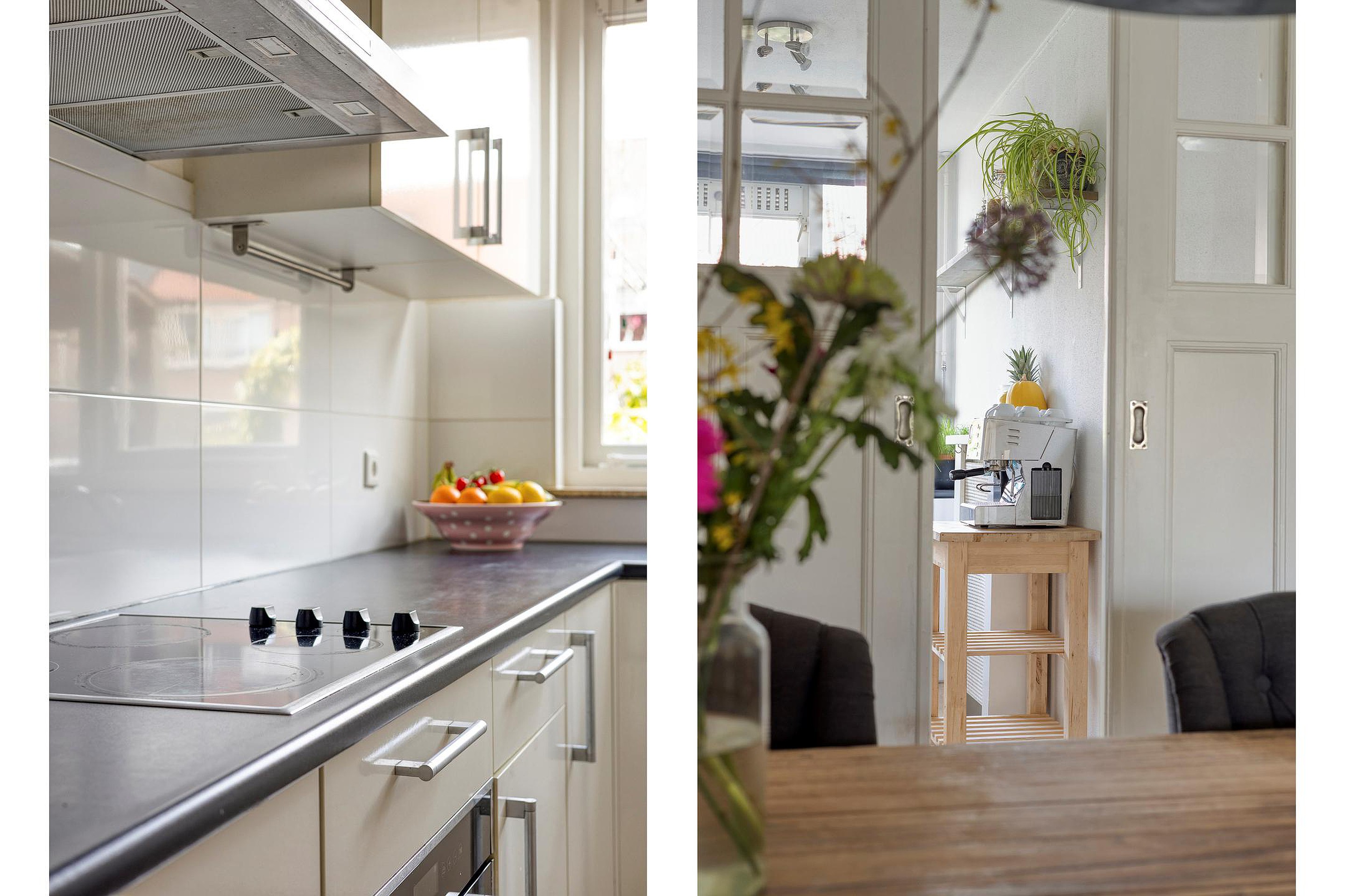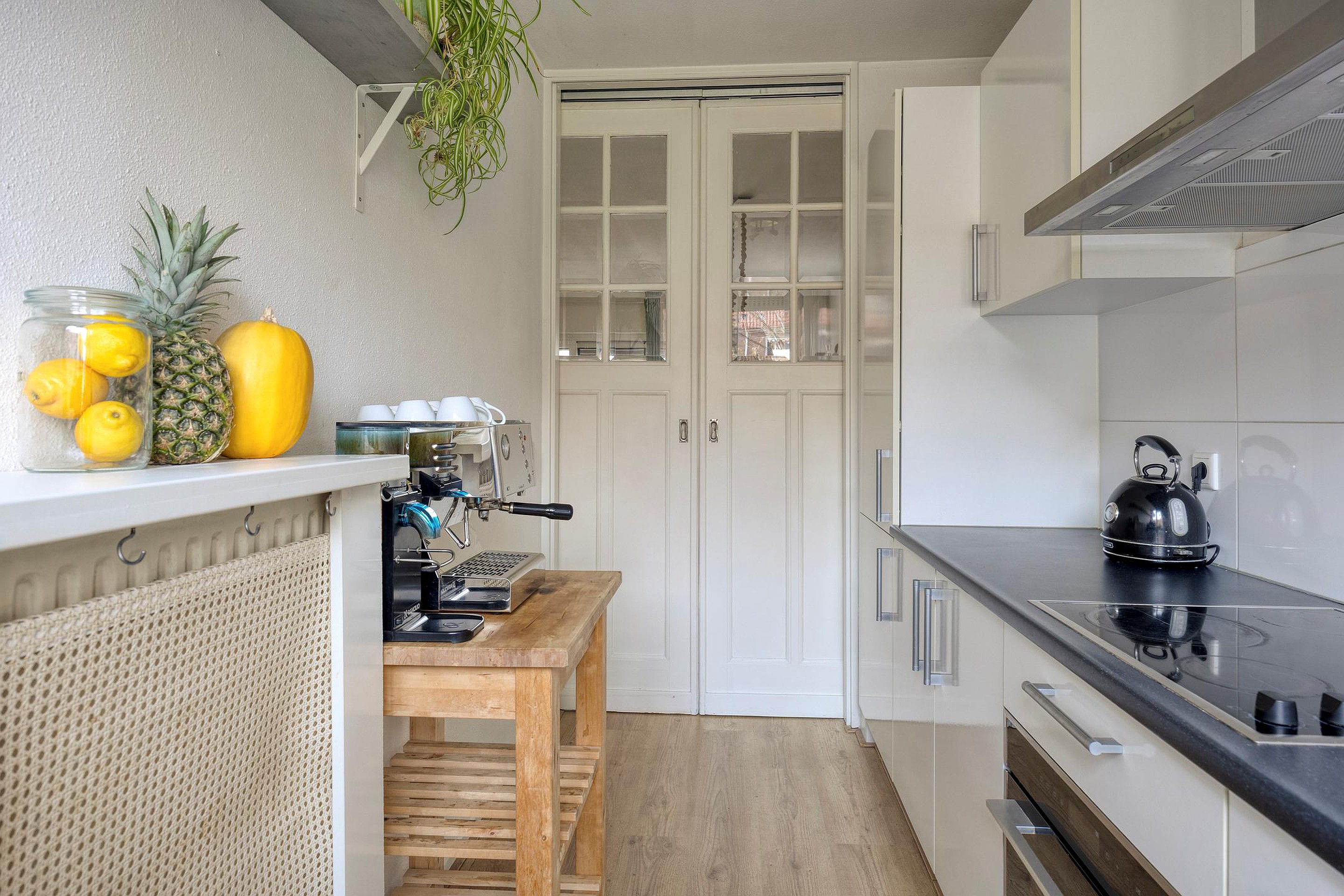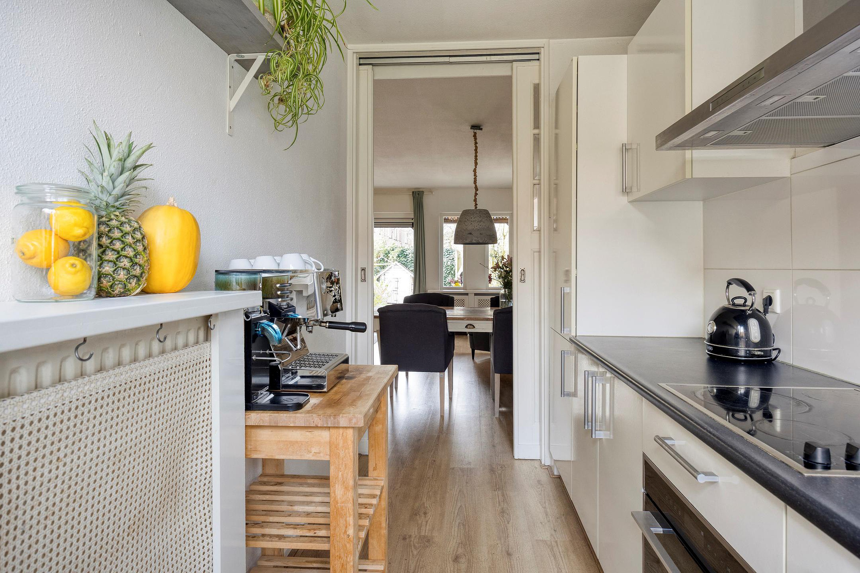 Keuken, gelegen aan de voorzijde met uitzicht op de straat, voorzien van een keukenblok in L-vormige opstelling. Verder bevat de keuken divers apparatuur: een keramische kookplaat en afzuigkap (met afvoer naar buiten), koel-vriescombinatie, vaatwasser en een combimagnetron.
