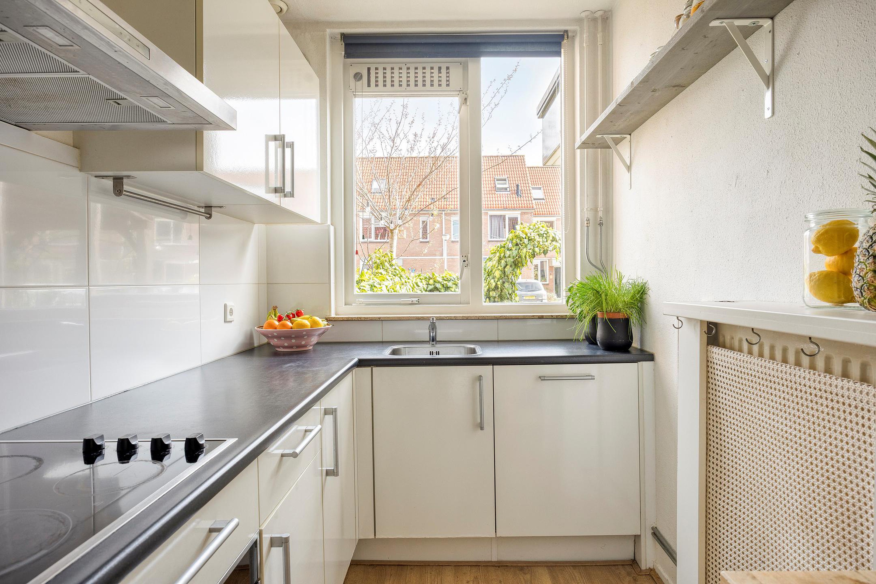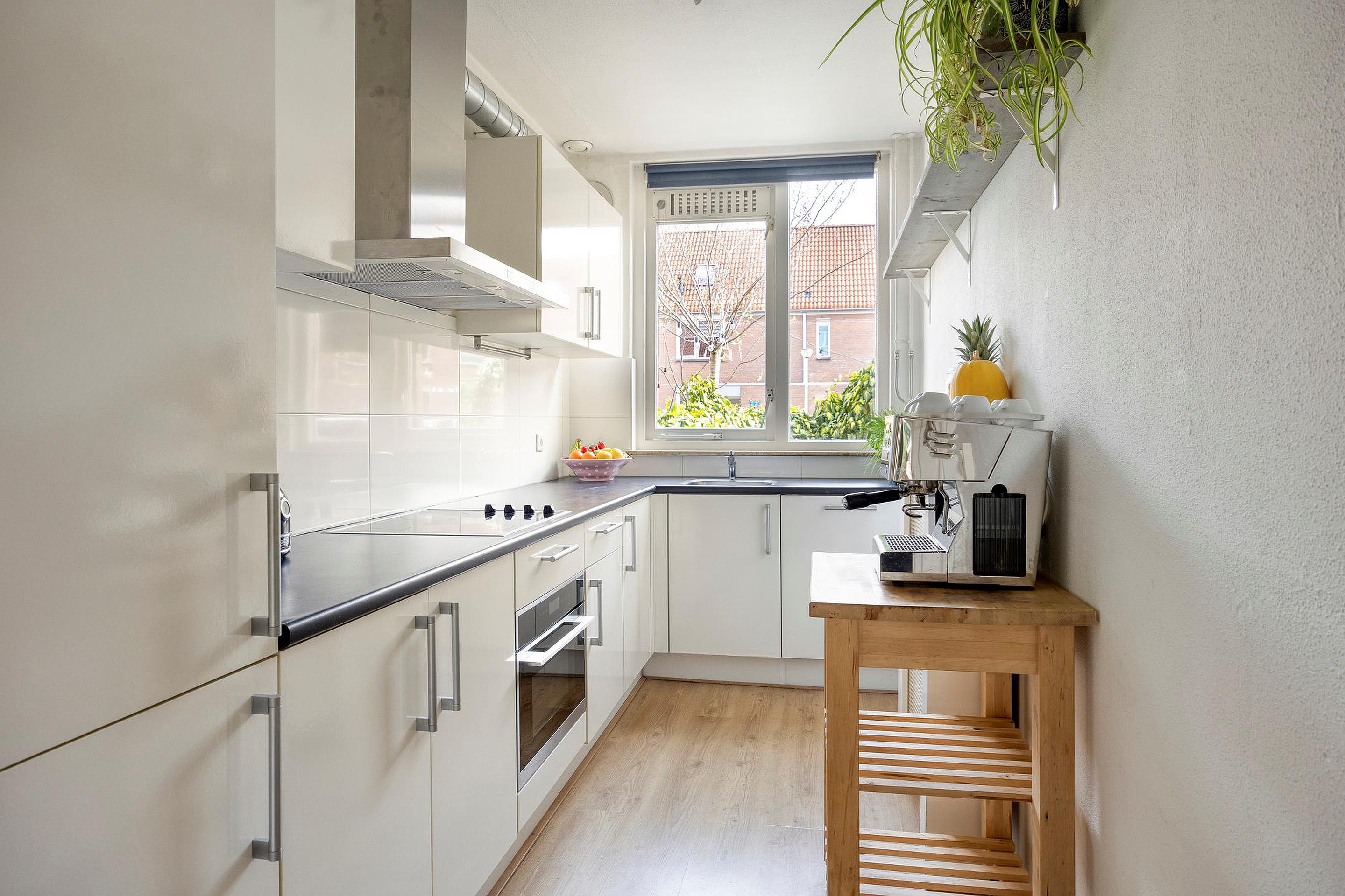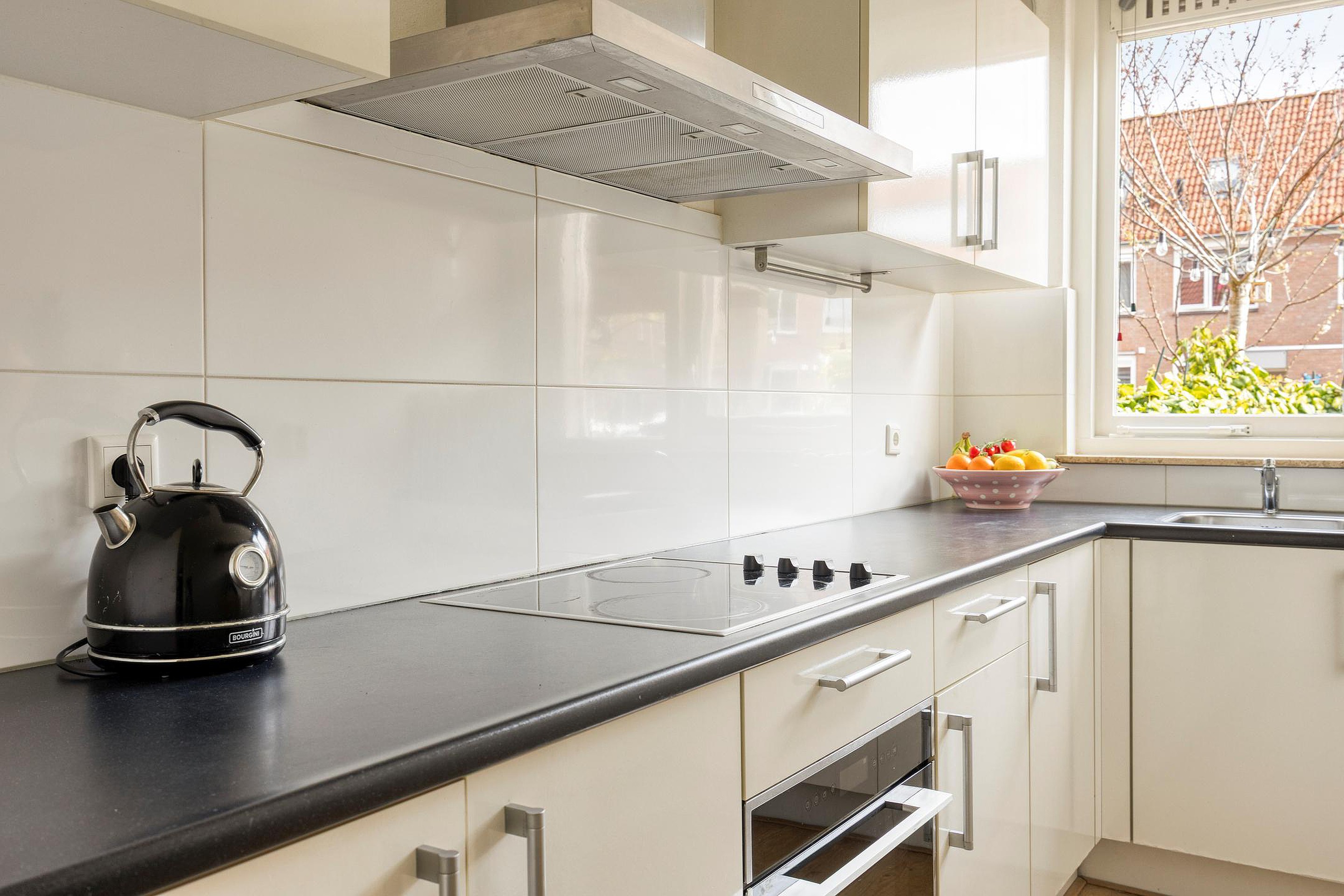 Keuken, gelegen aan de voorzijde met uitzicht op de straat, voorzien van een keukenblok in L-vormige opstelling. Verder bevat de keuken divers apparatuur: een keramische kookplaat en afzuigkap (met afvoer naar buiten), koel-vriescombinatie, vaatwasser en een combimagnetron.
