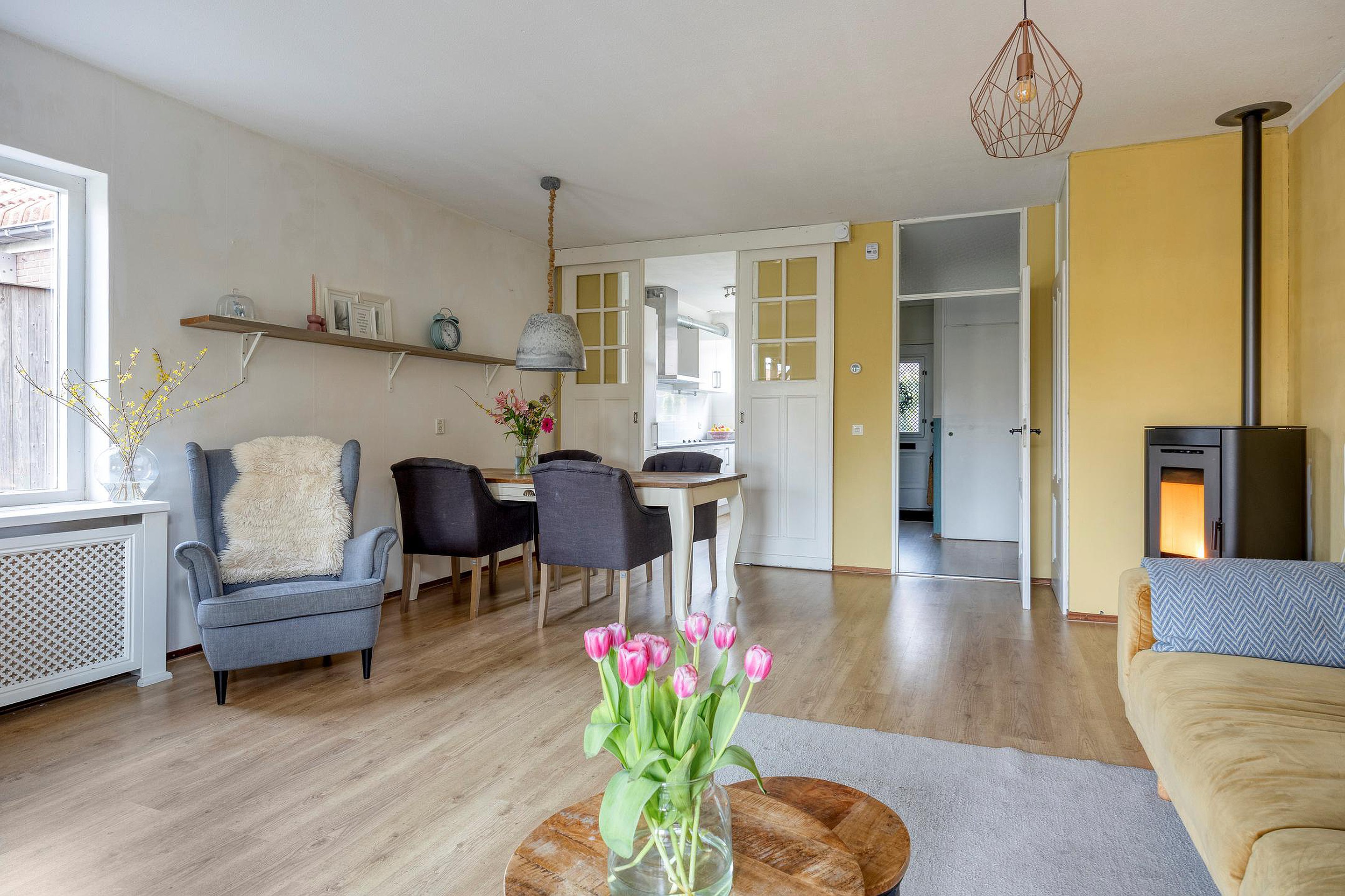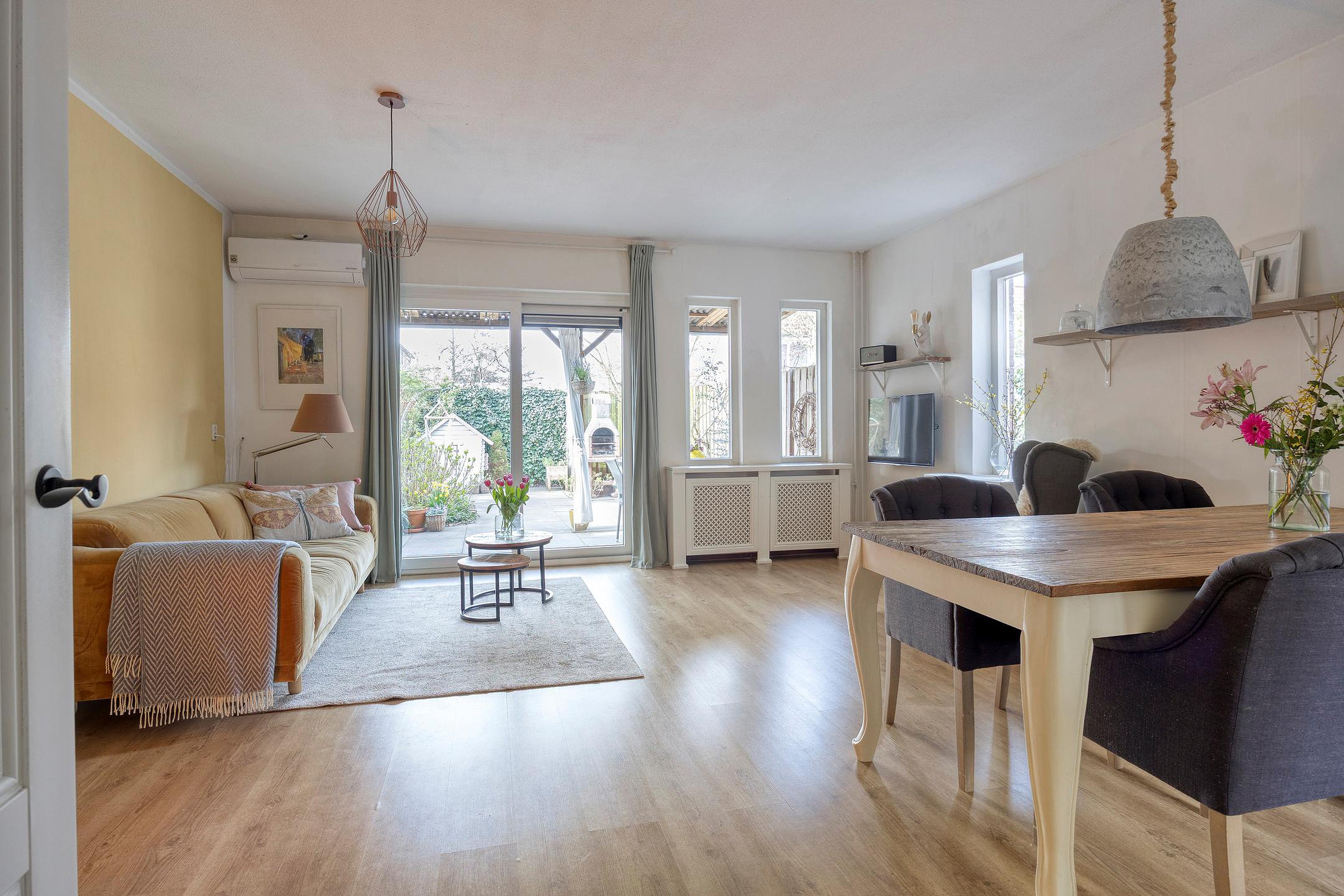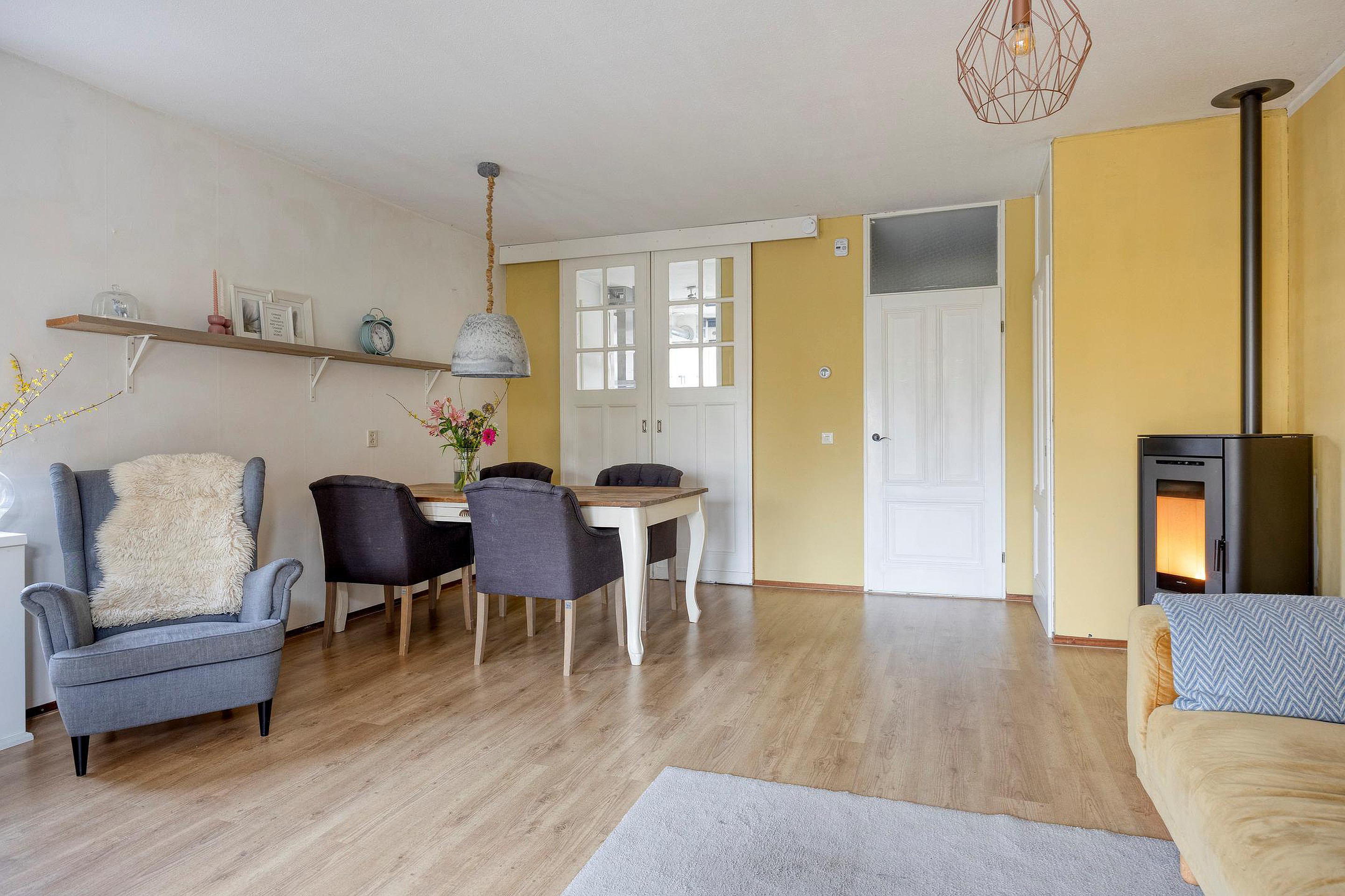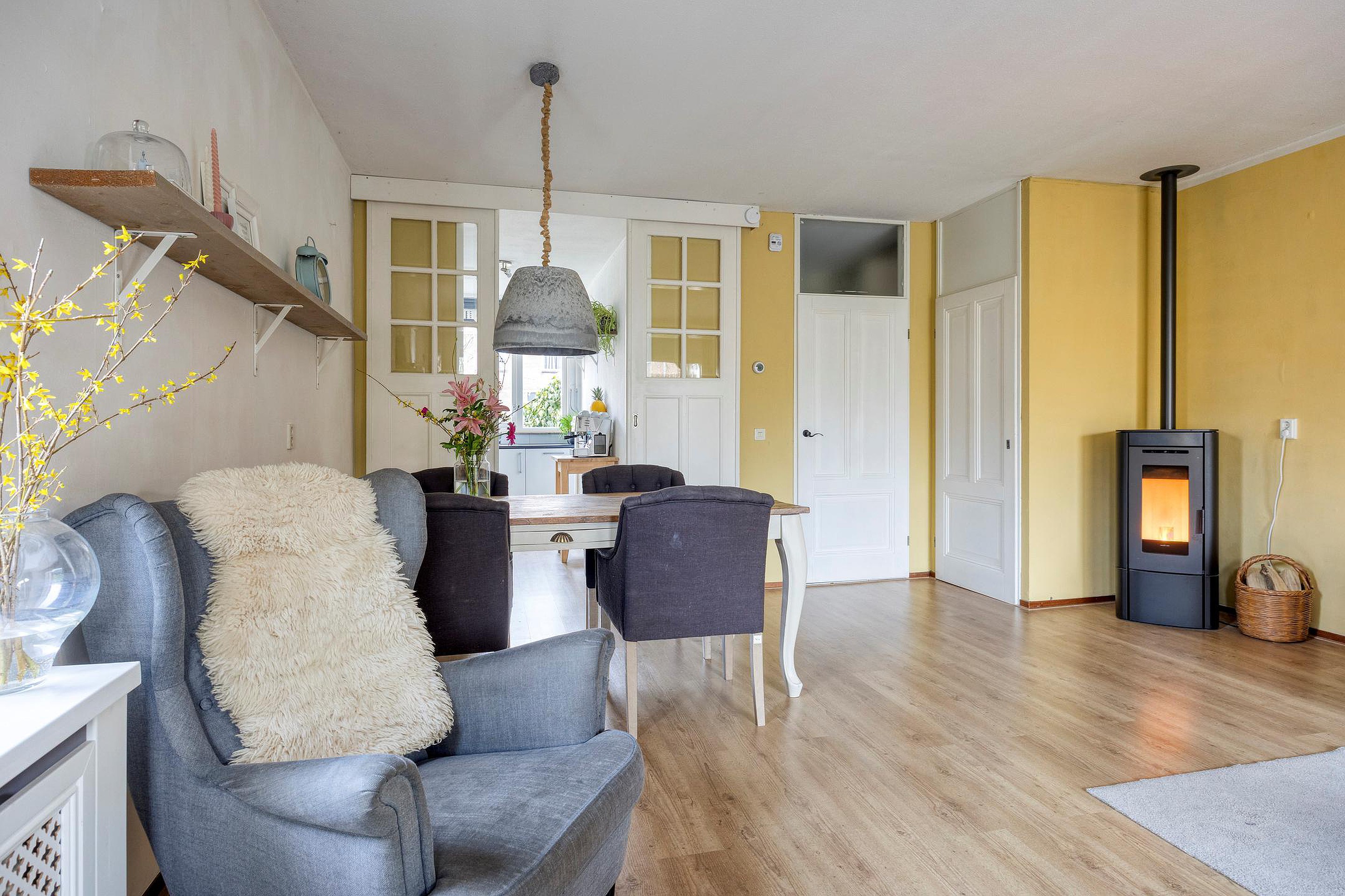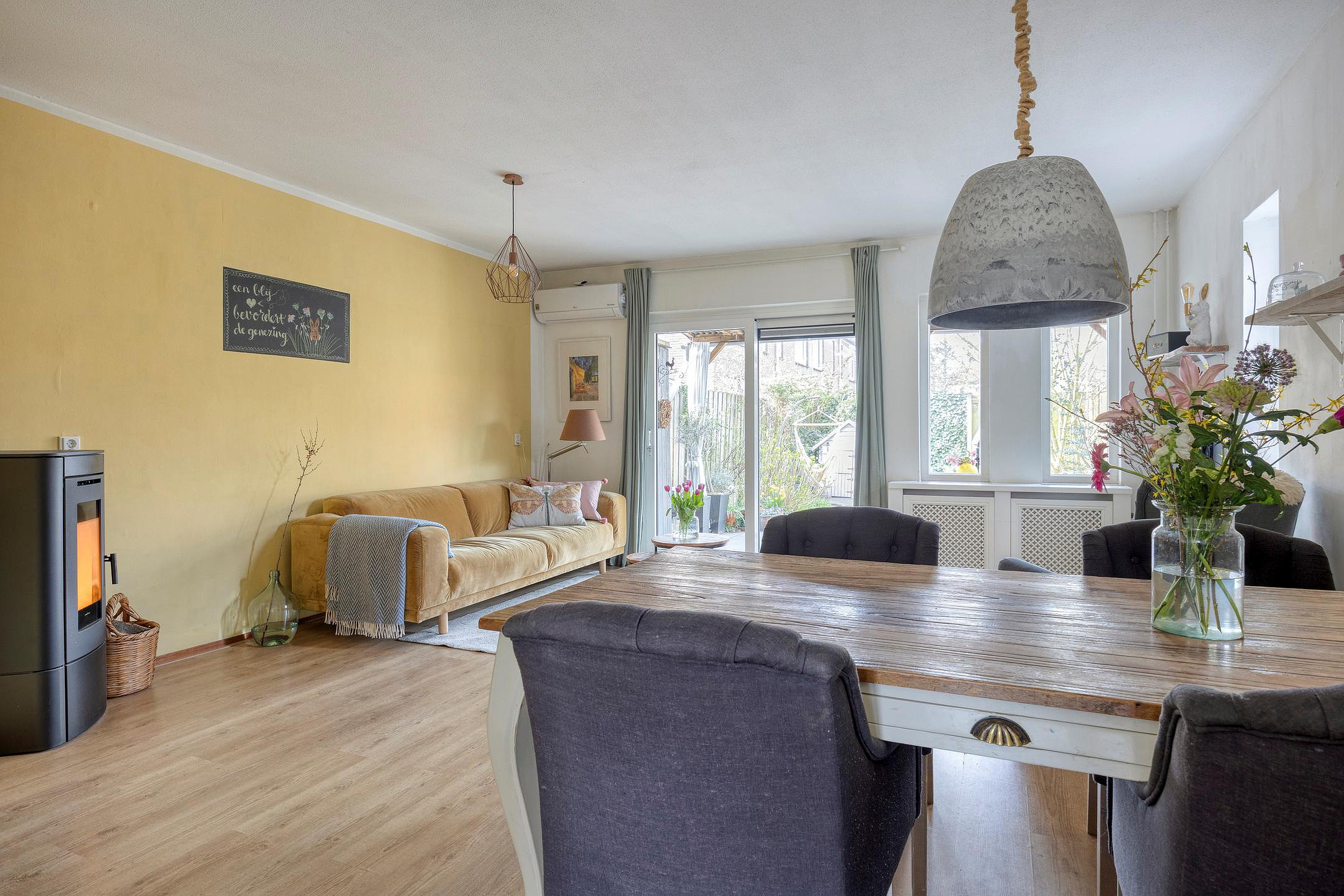 Woonkamer, een gezellige en lichte woonkamer, voorzien van een palletkachel en airconditioning. De woonkamer is voorzien van veel lichtinval door het zijraam (hoekligging!) en de aluminium schuifpui naar de achtertuin.