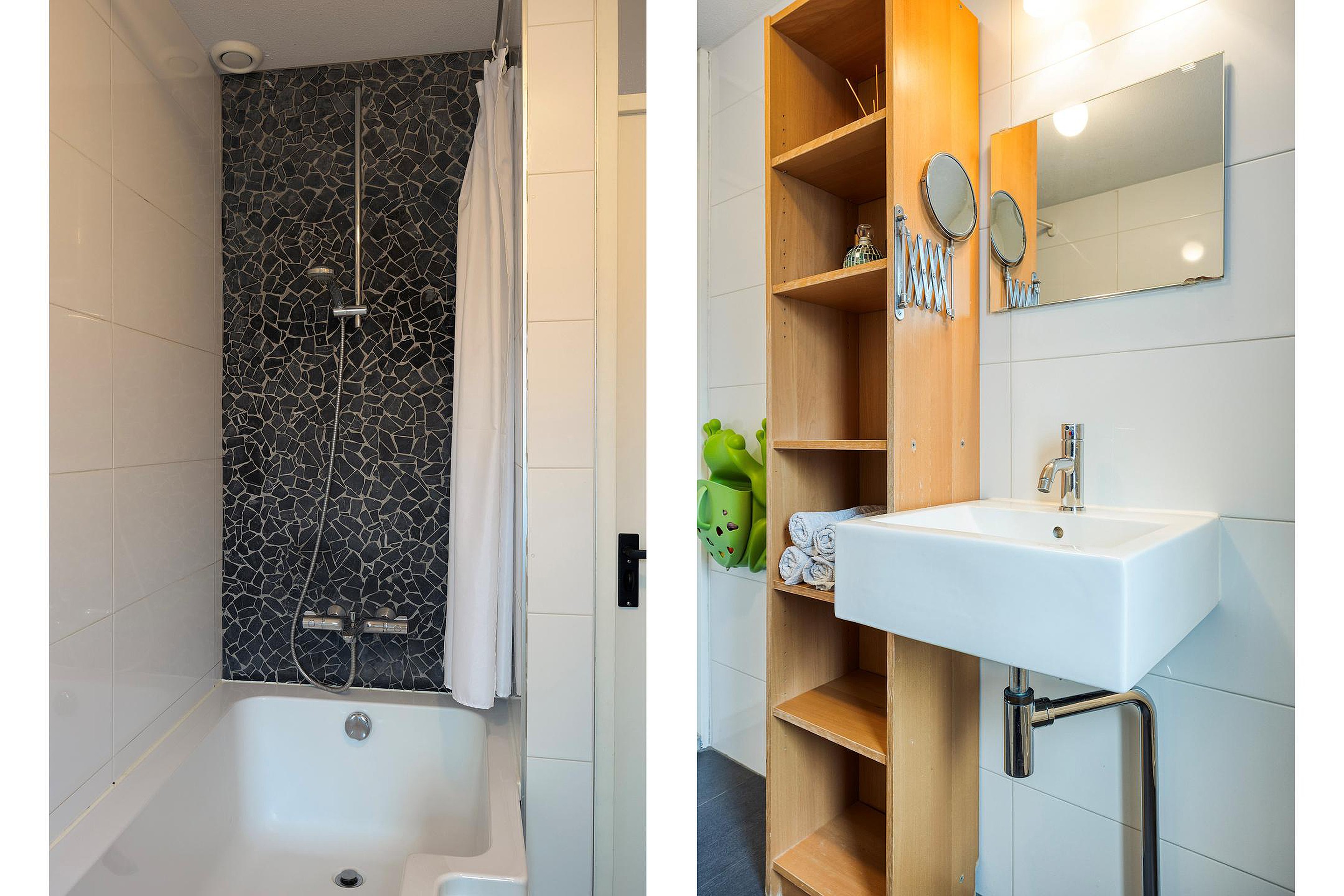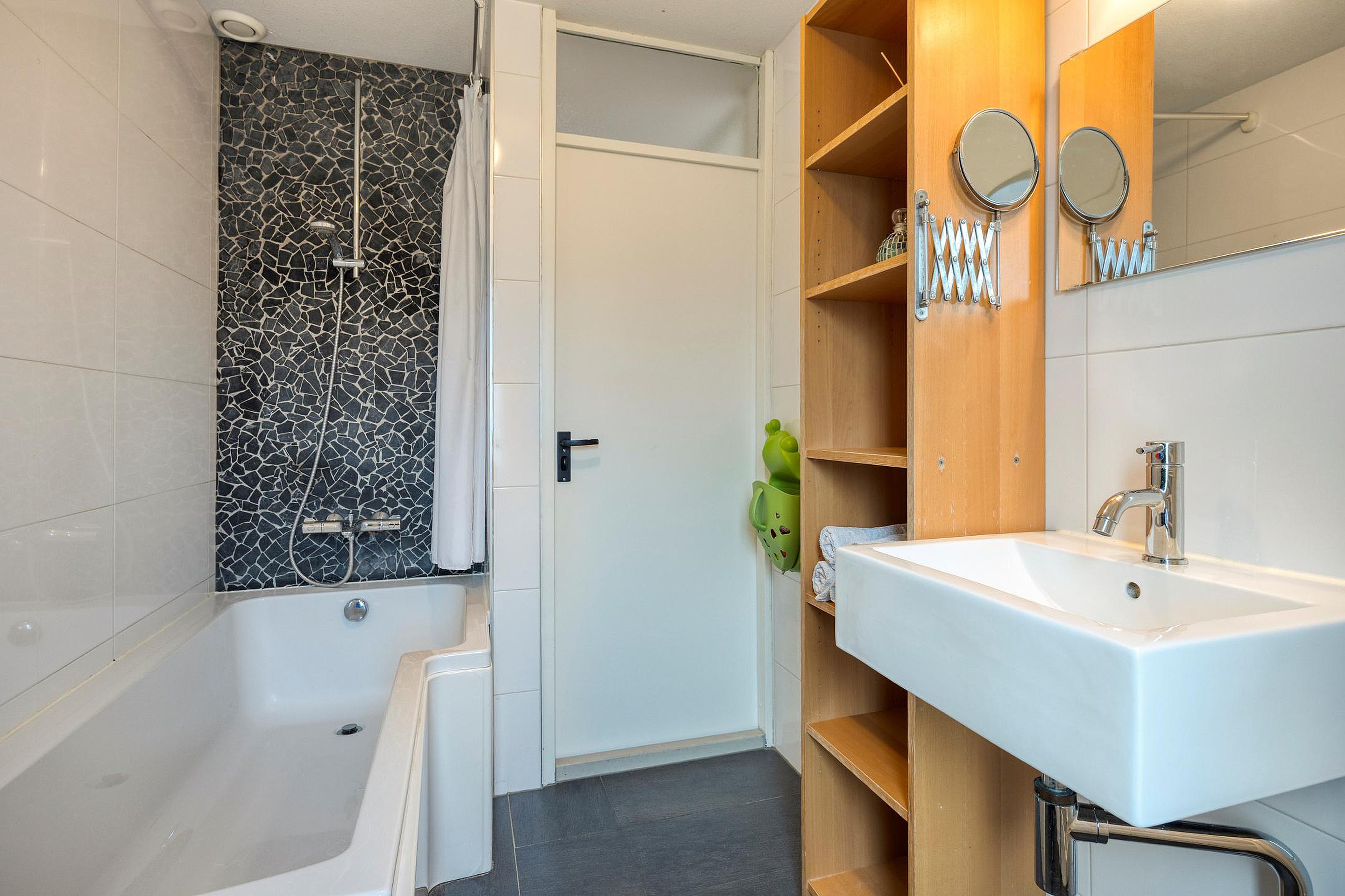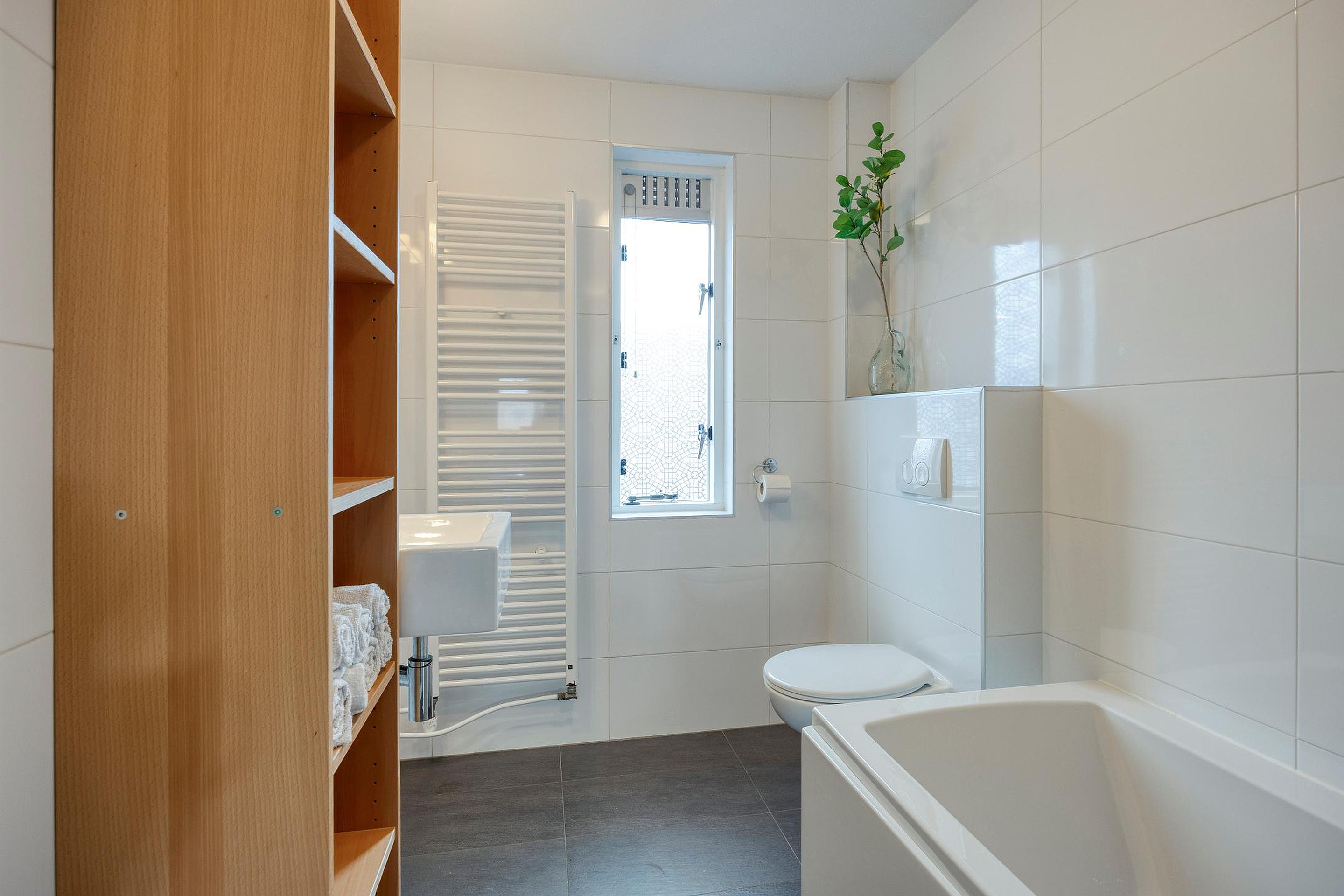 Badkamer, een geheel betegelde ruimte, gelegen aan de voorzijde. De badkamer is voorzien van een groot ligbad met thermostaatkraan, wastafel, een tweede toilet, te openen raam en een badkamerradiator.