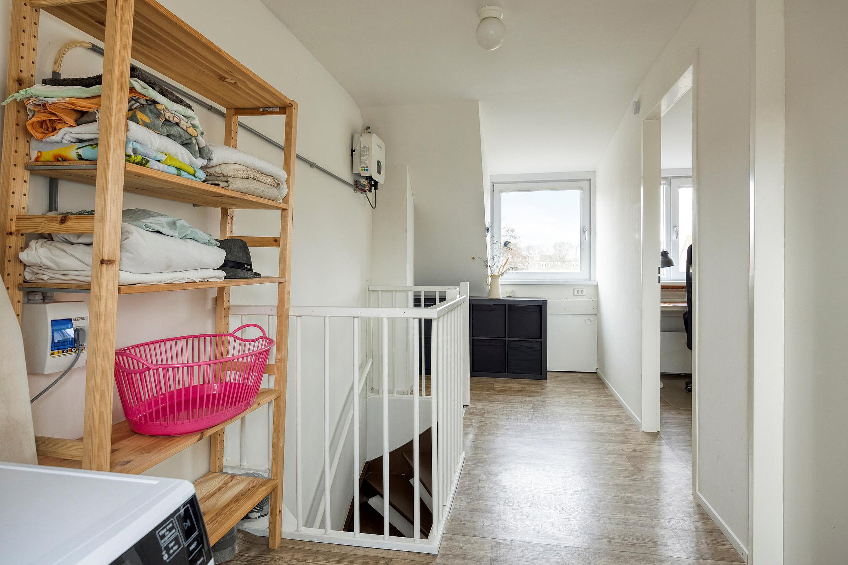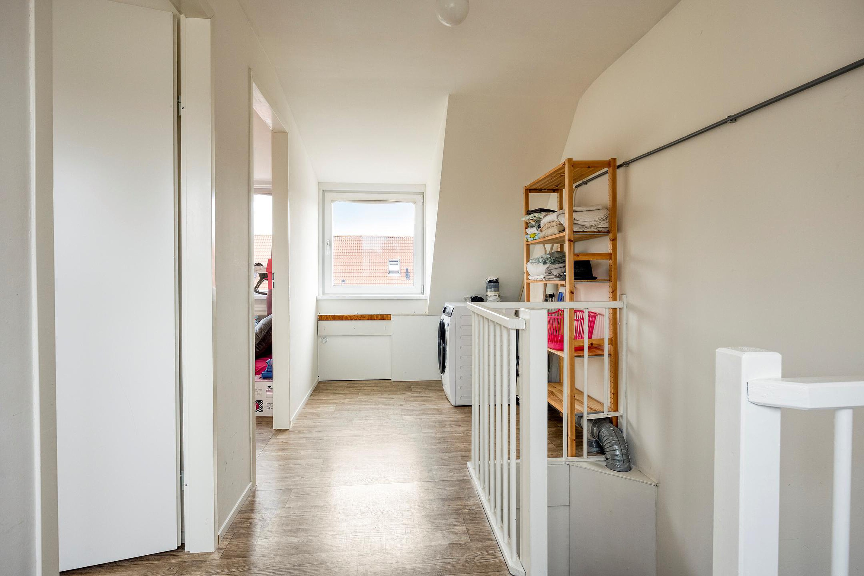 Overloop, een ruime overloop, voorzien van de wasmachineaansluiting, omvormer PV-zonnepanelen en bergruimte achter het knieschot. Vanaf de overloop is er toegang tot slaapkamer 4 en 5.