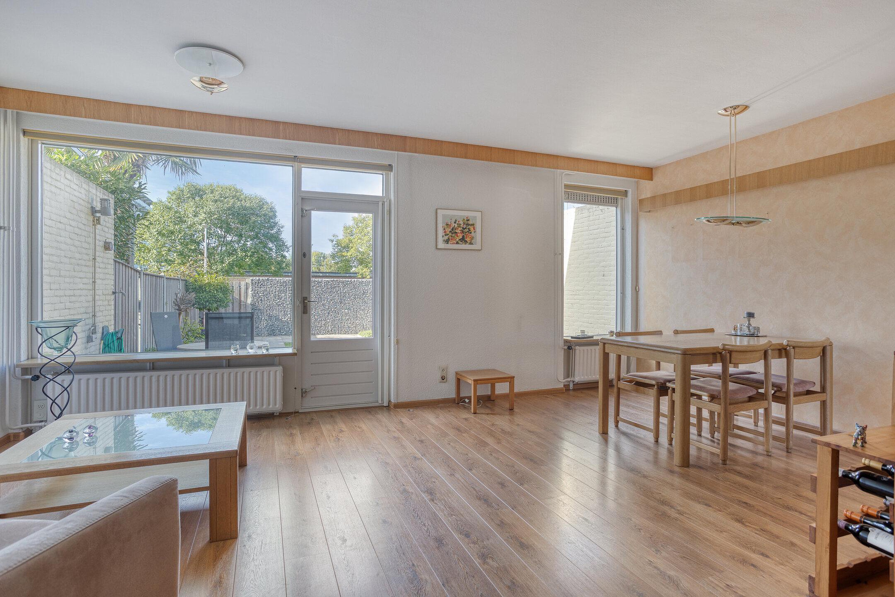Woonkamer, een lichte en tuingerichte woonkamer voorzien van laminaat vloerafwerking, met toegang tot de keuken, achtertuin en gestoffeerde trapopgang naar de eerste verdieping.