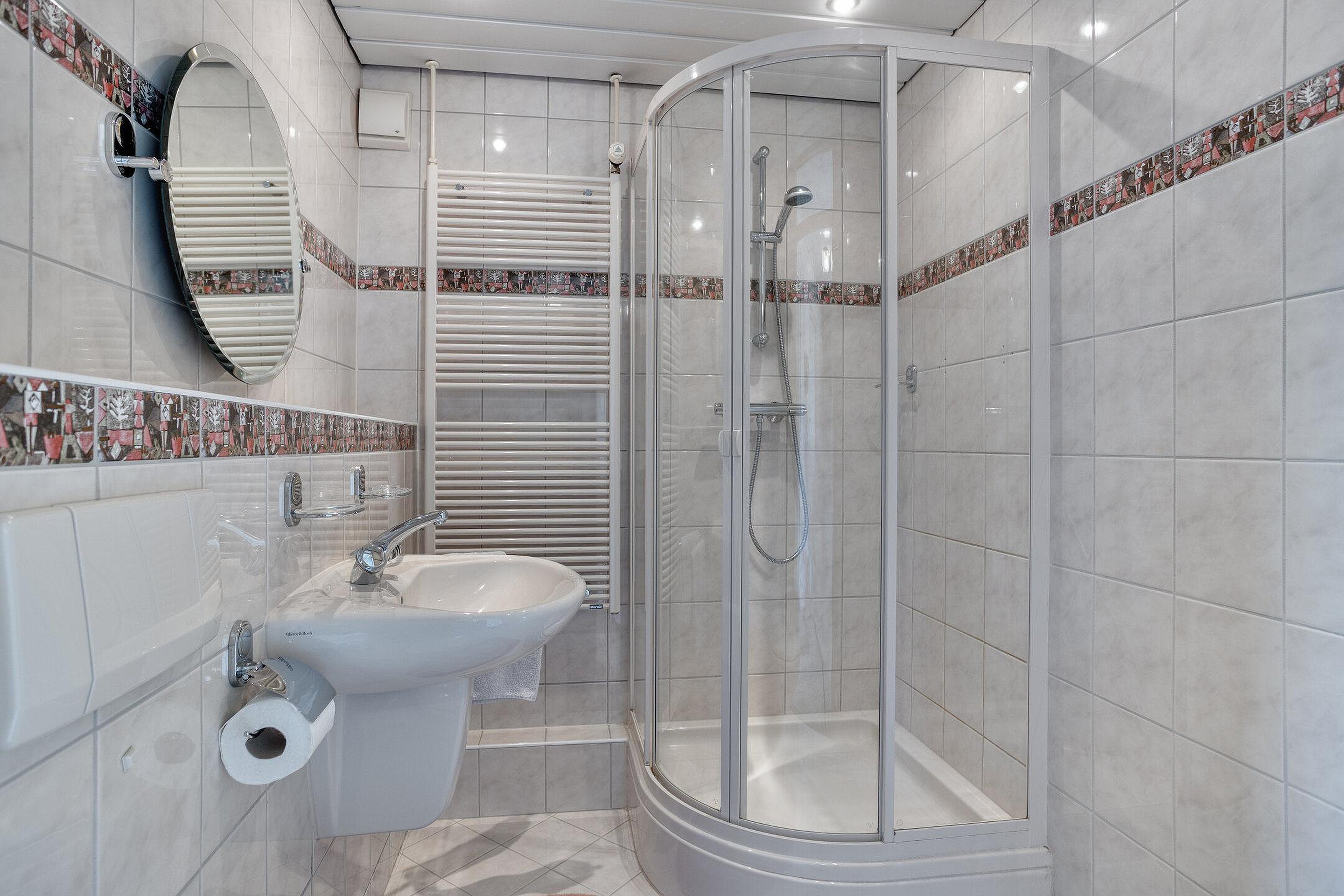 Badkamer, vergroot en geheel betegeld, voorzien van een douchecabine met thermostaatkraan, wastafel met spiegel, een tweede toilet (hangend closet), badkamerradiator en elektrische afzuiging.