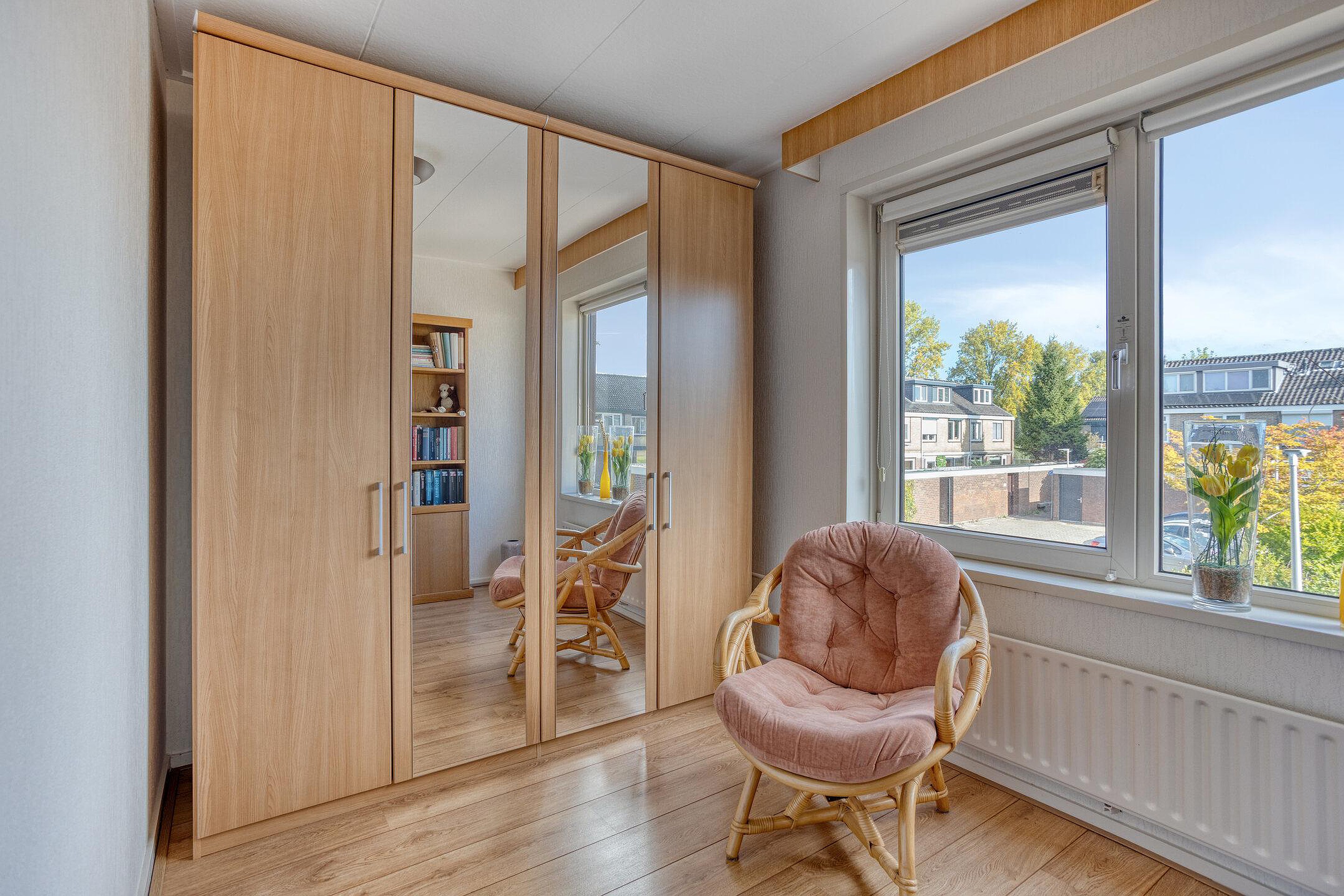 Slaapkamer 3, gelegen aan de achterzijde, voorzien van 2 vaste kasten, laminaat op de vloer en elektrische zonwering (screen).