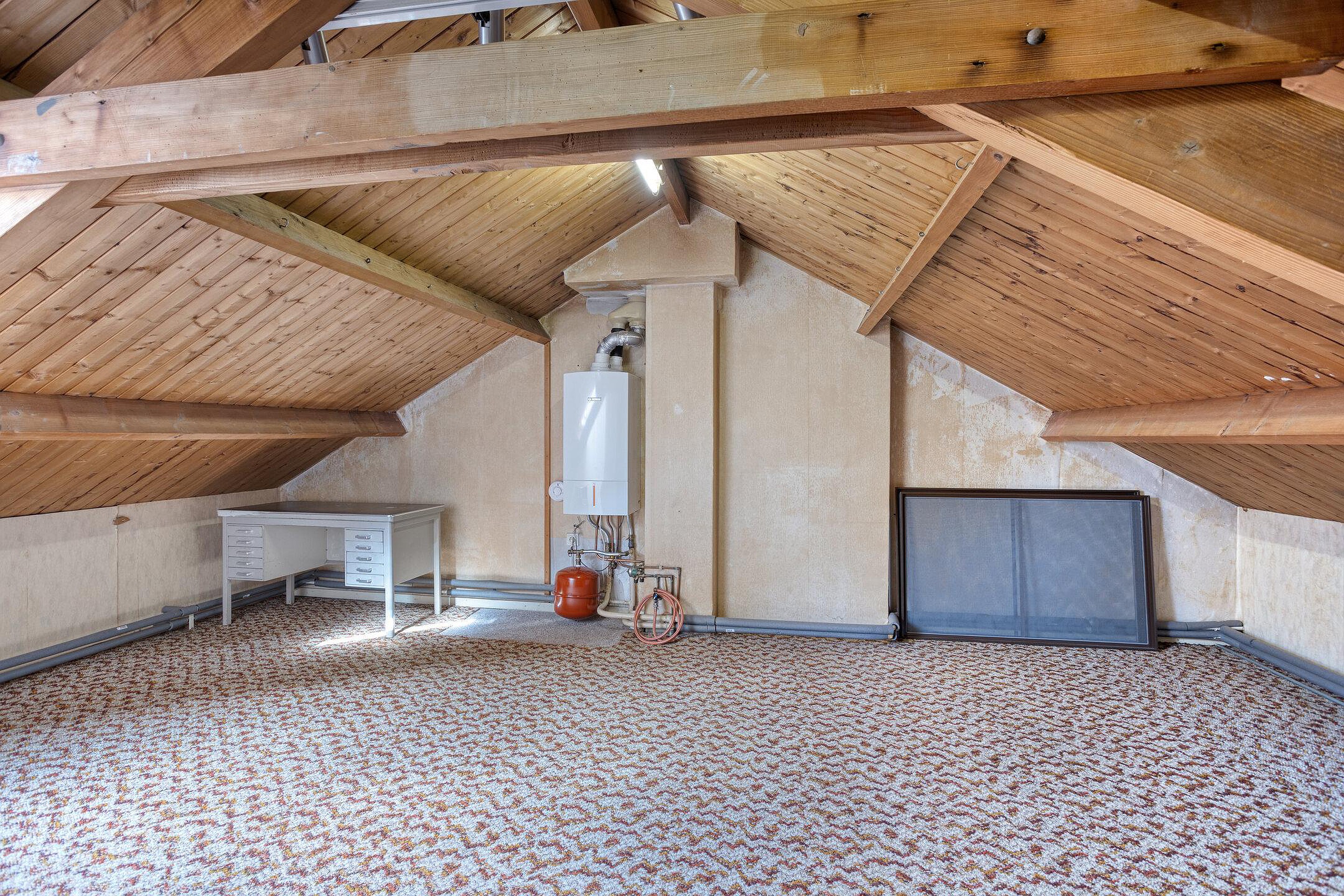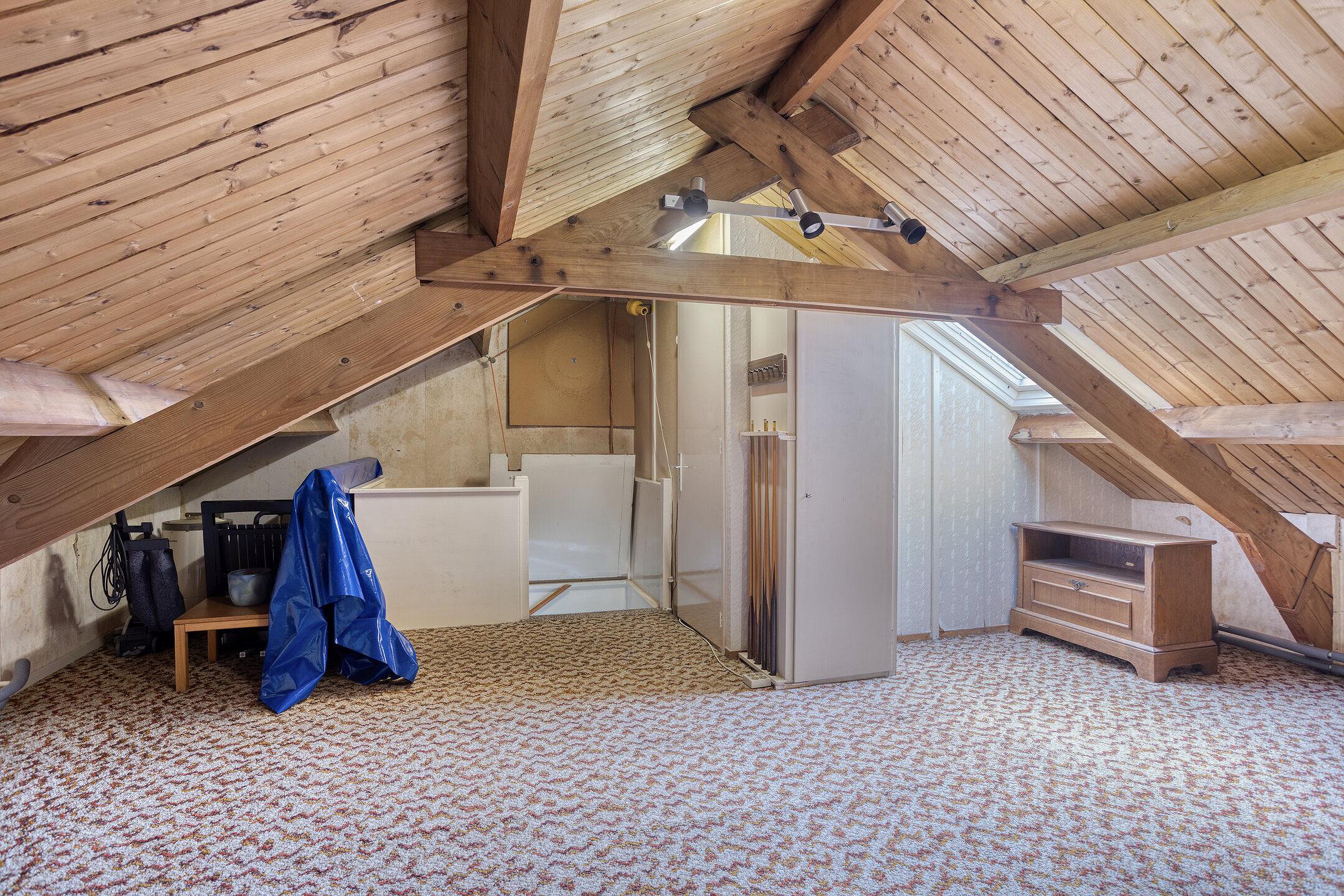 Een grote zolderkamer met afgesloten berg/hobbyruimte, Velux dakraam, toegang tot de opstelling cv-ketel en opbergruimte achter de knieschotten. De zolderverdieping beschikt momenteel niet over een radiator.