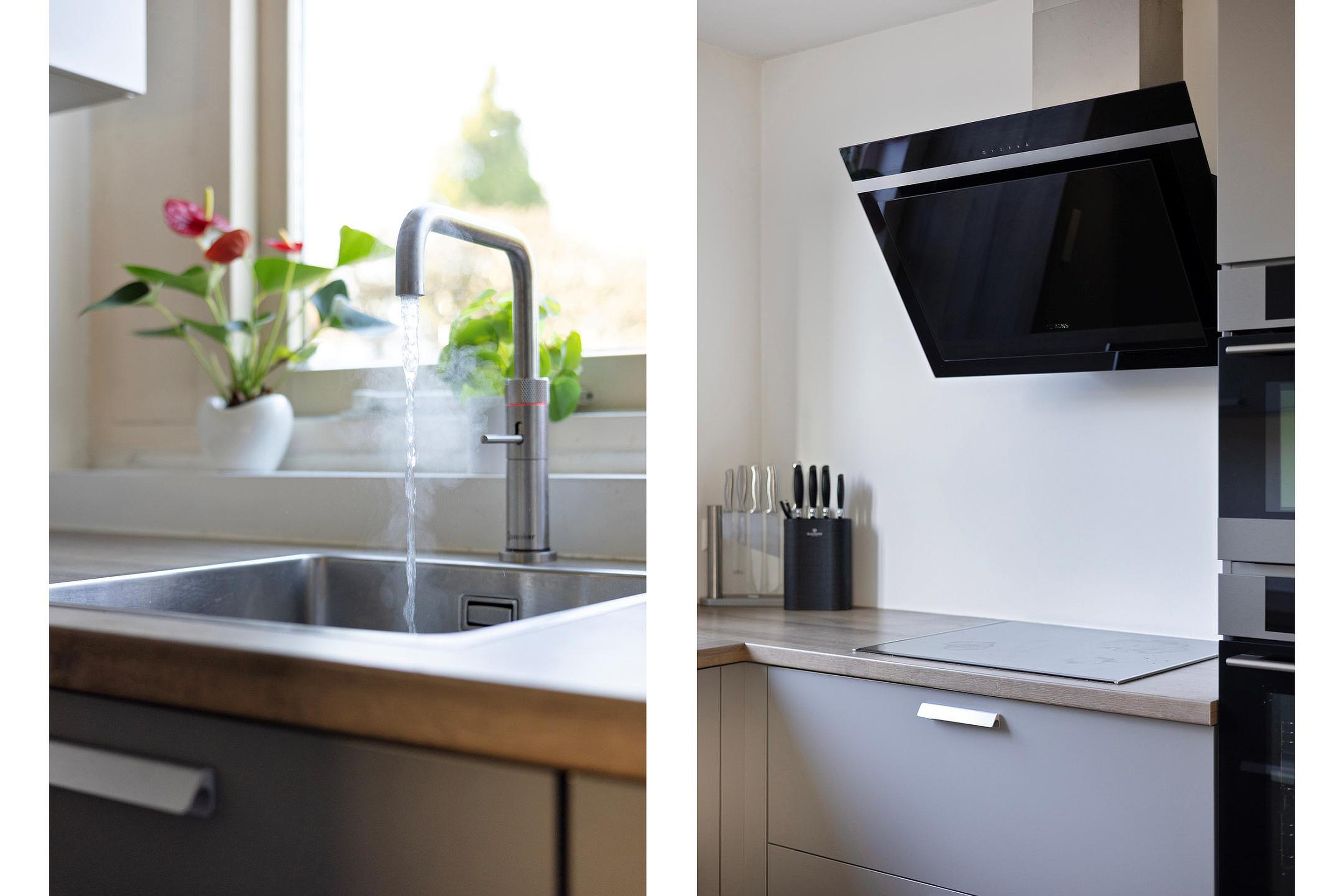 Woonkamer met sfeervolle open haard en open keuken welke luxe is uitgevoerd met diverse apparatuur.