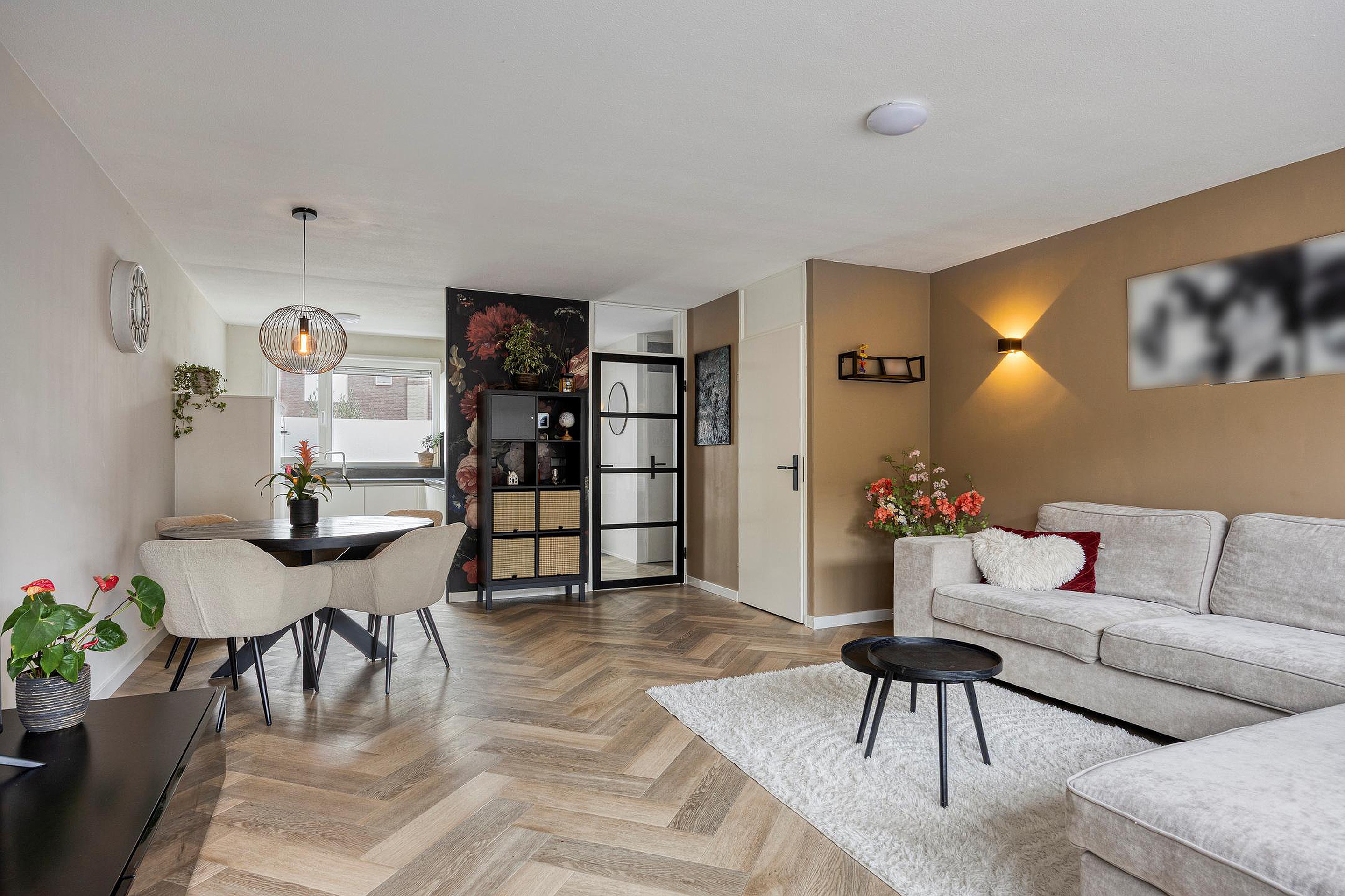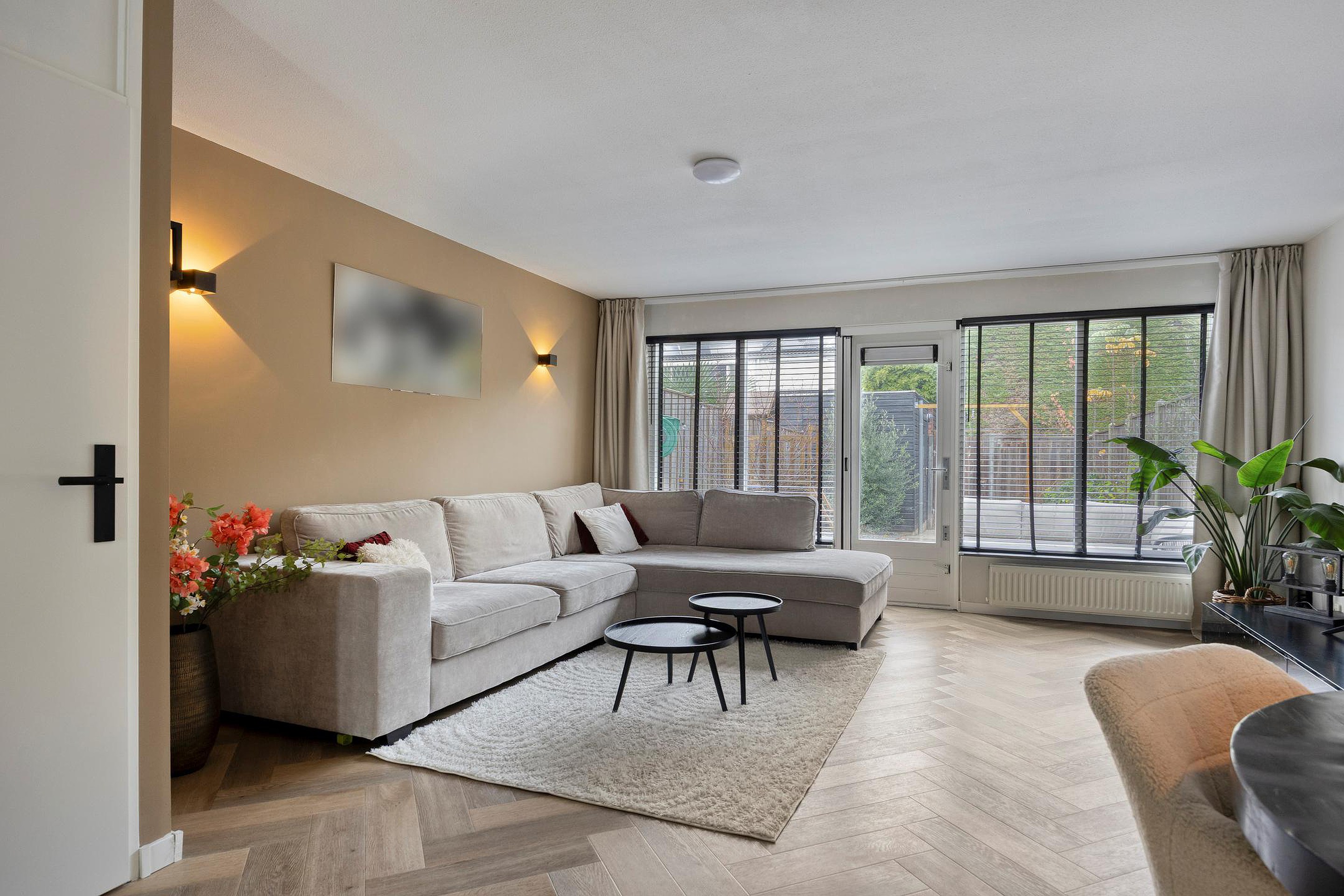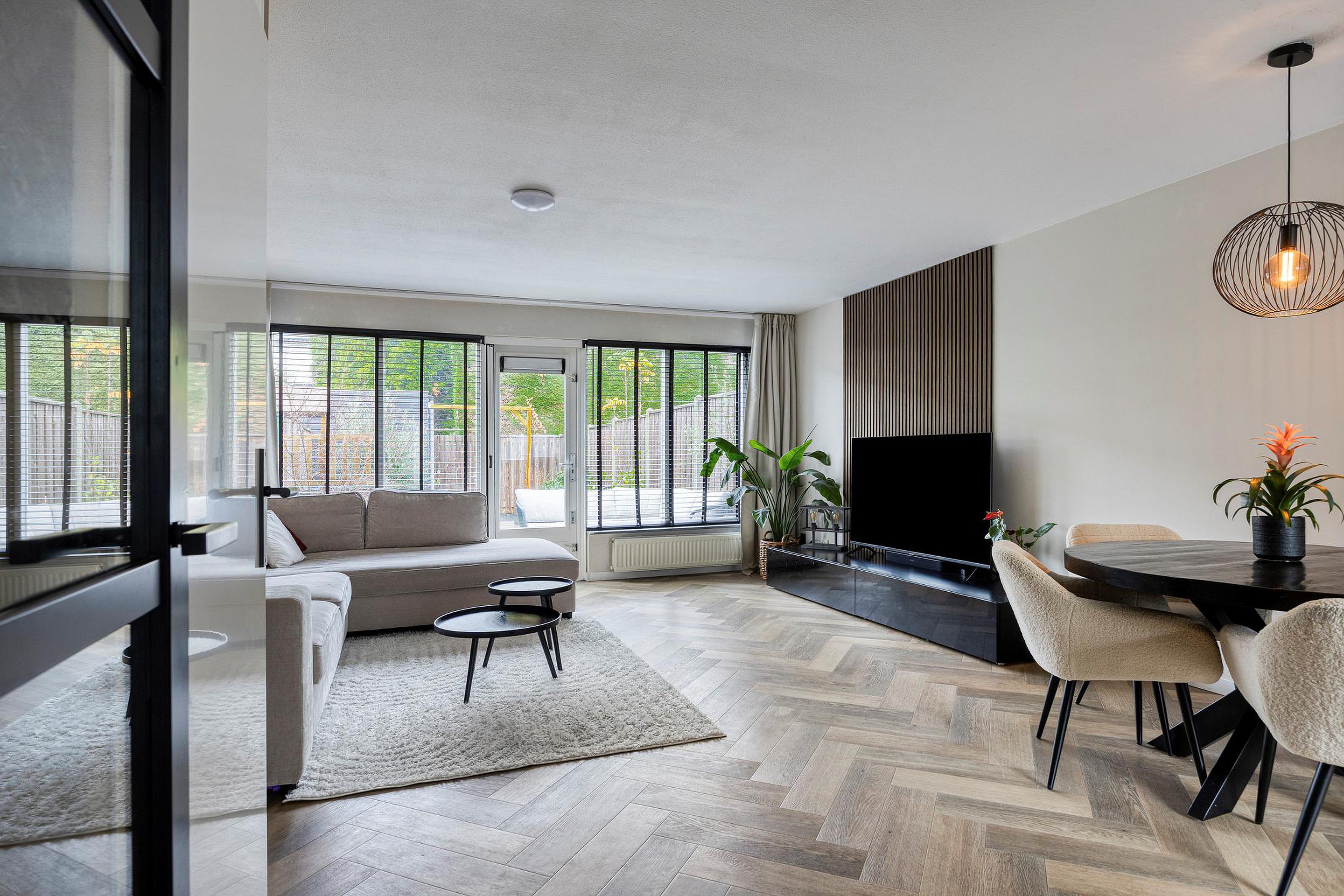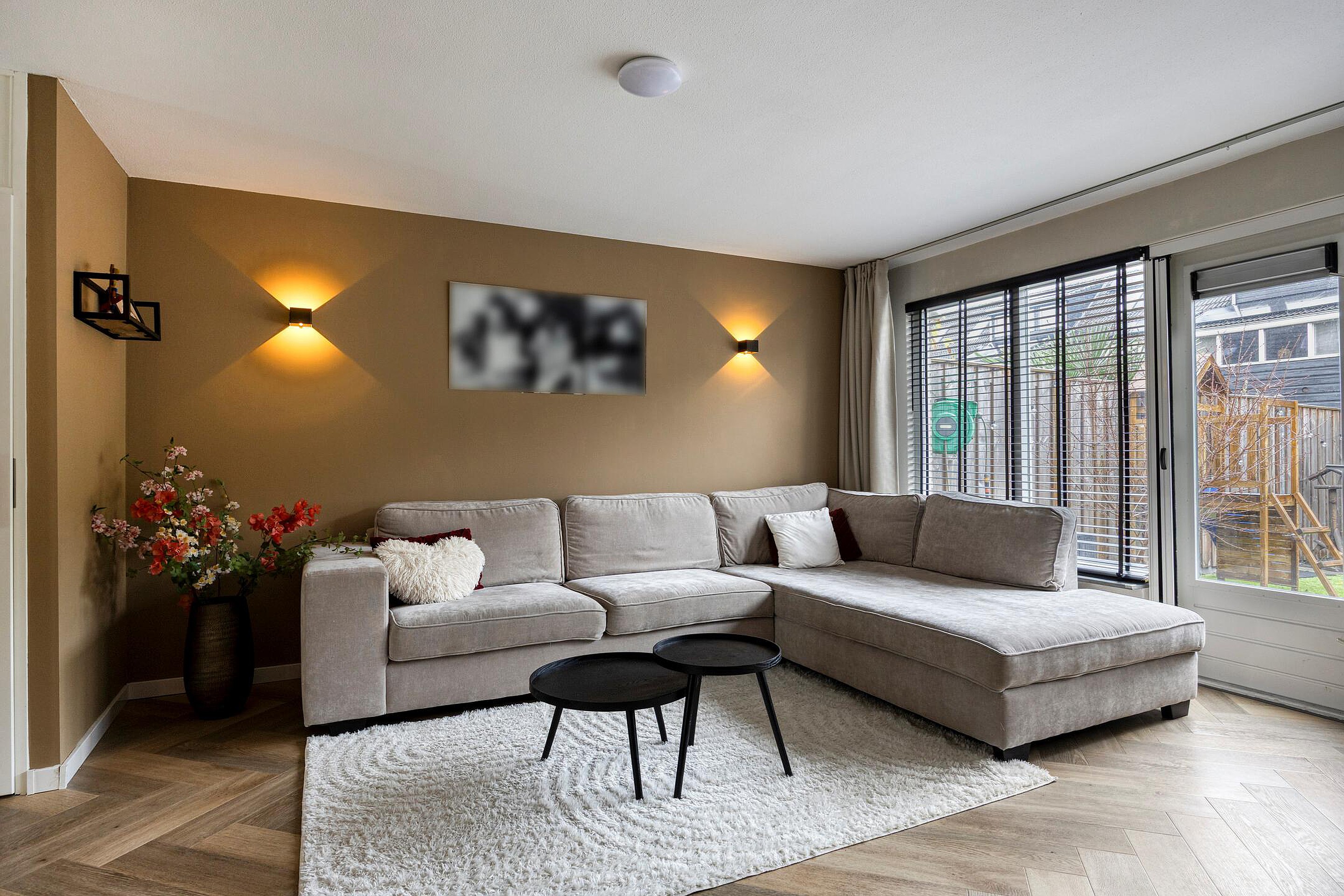 Woonkamer, een fraai afgewerkte en gezellige woonkamer met toegang tot de achtertuin en een vaste kast onder de trap.