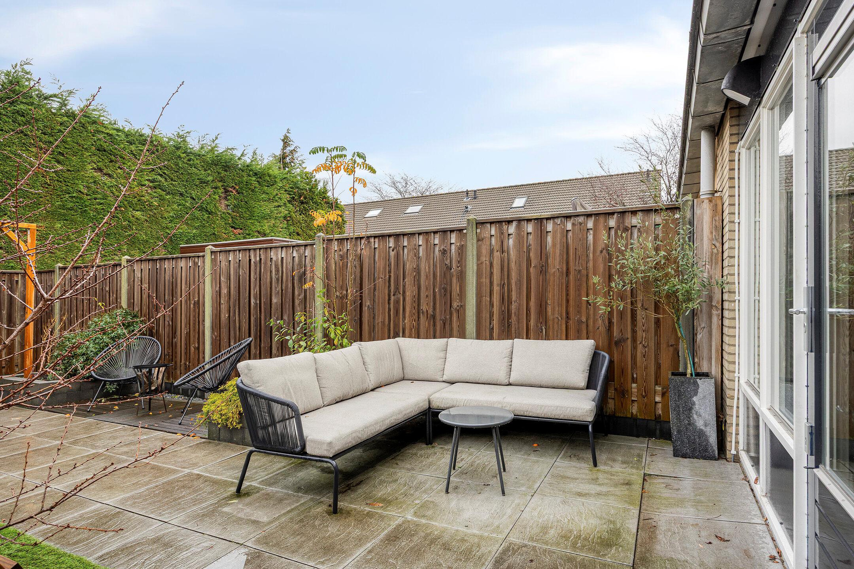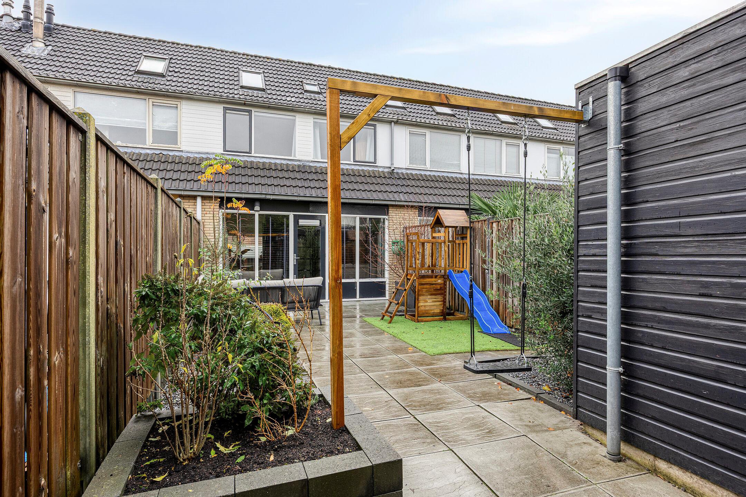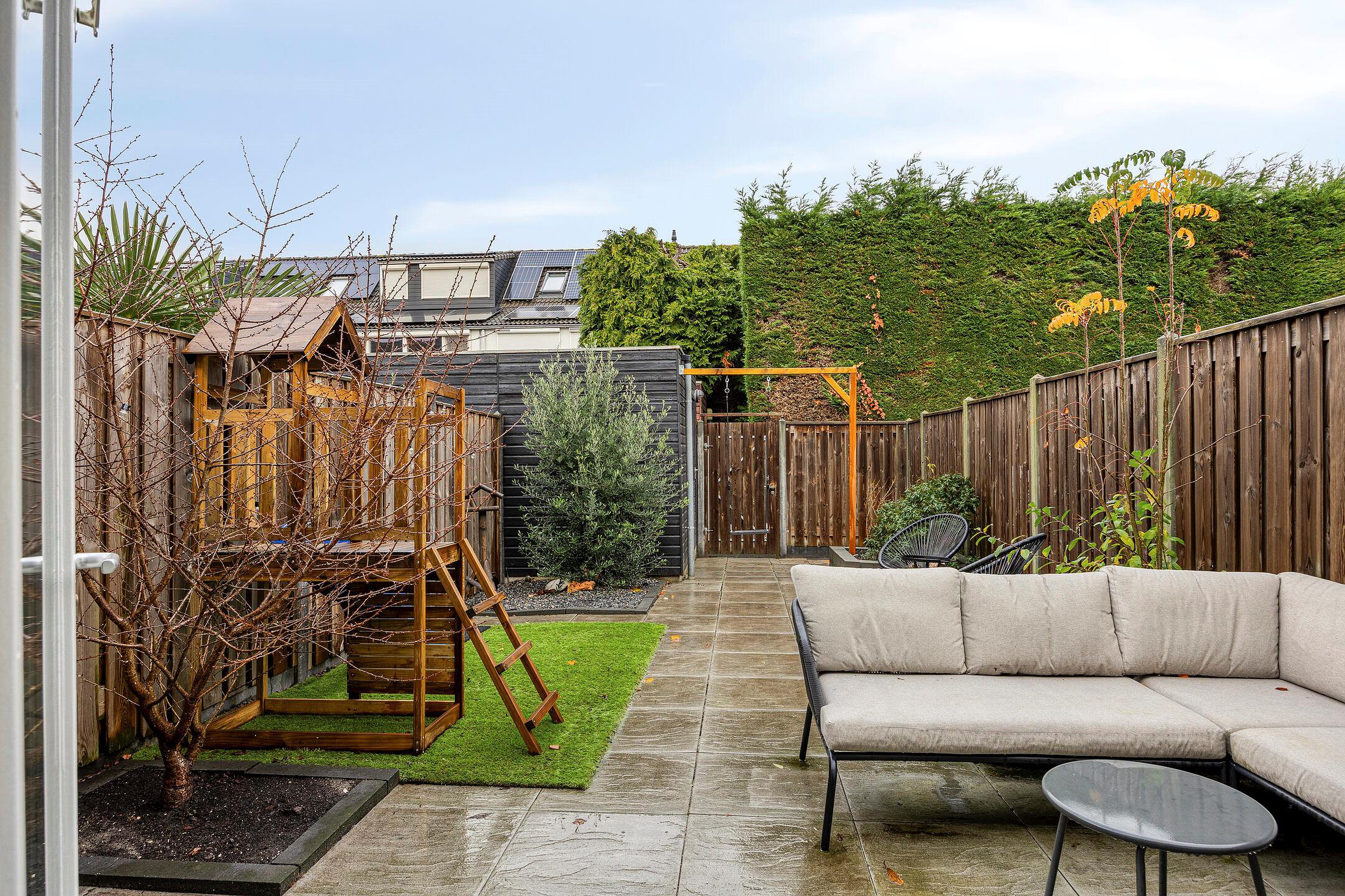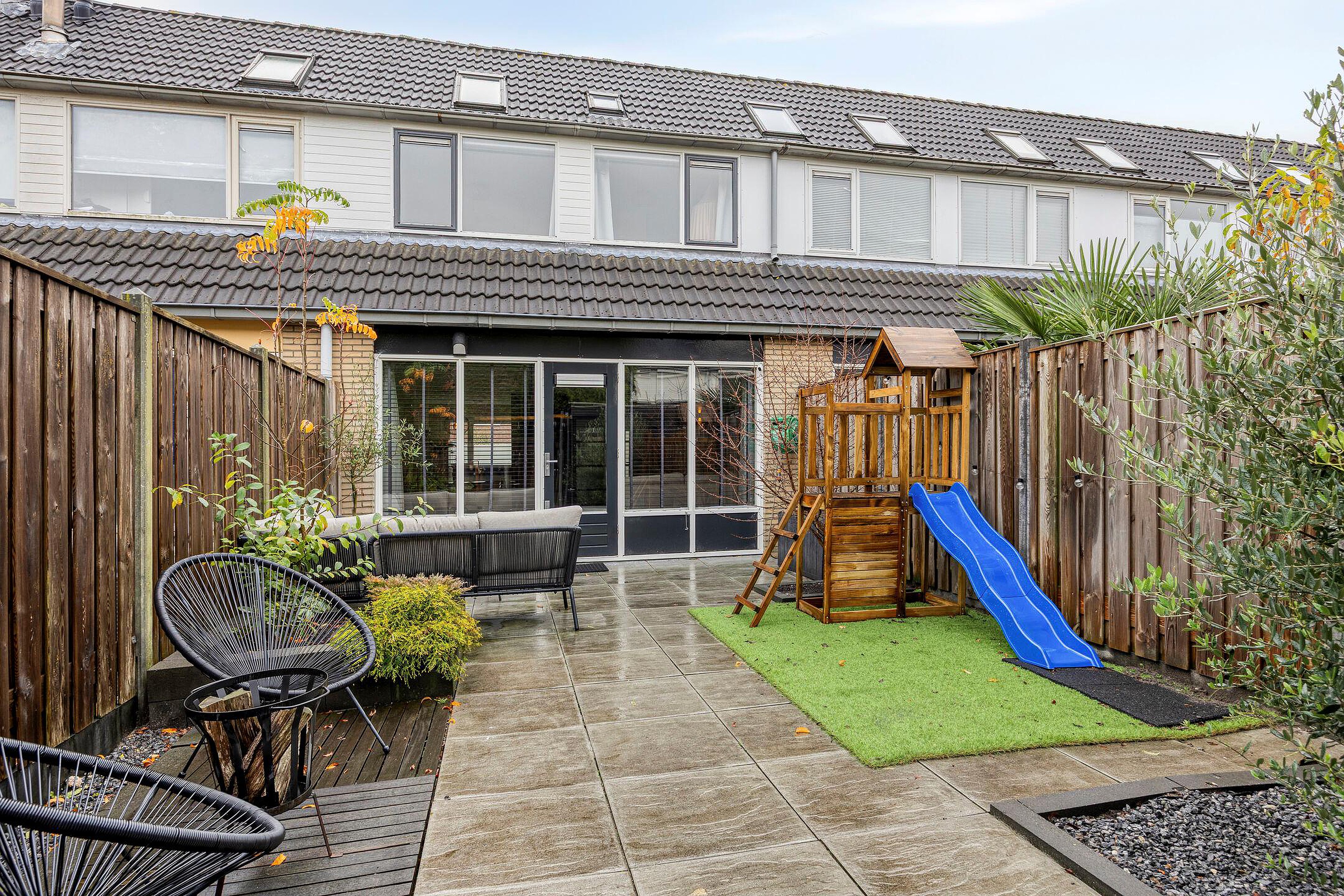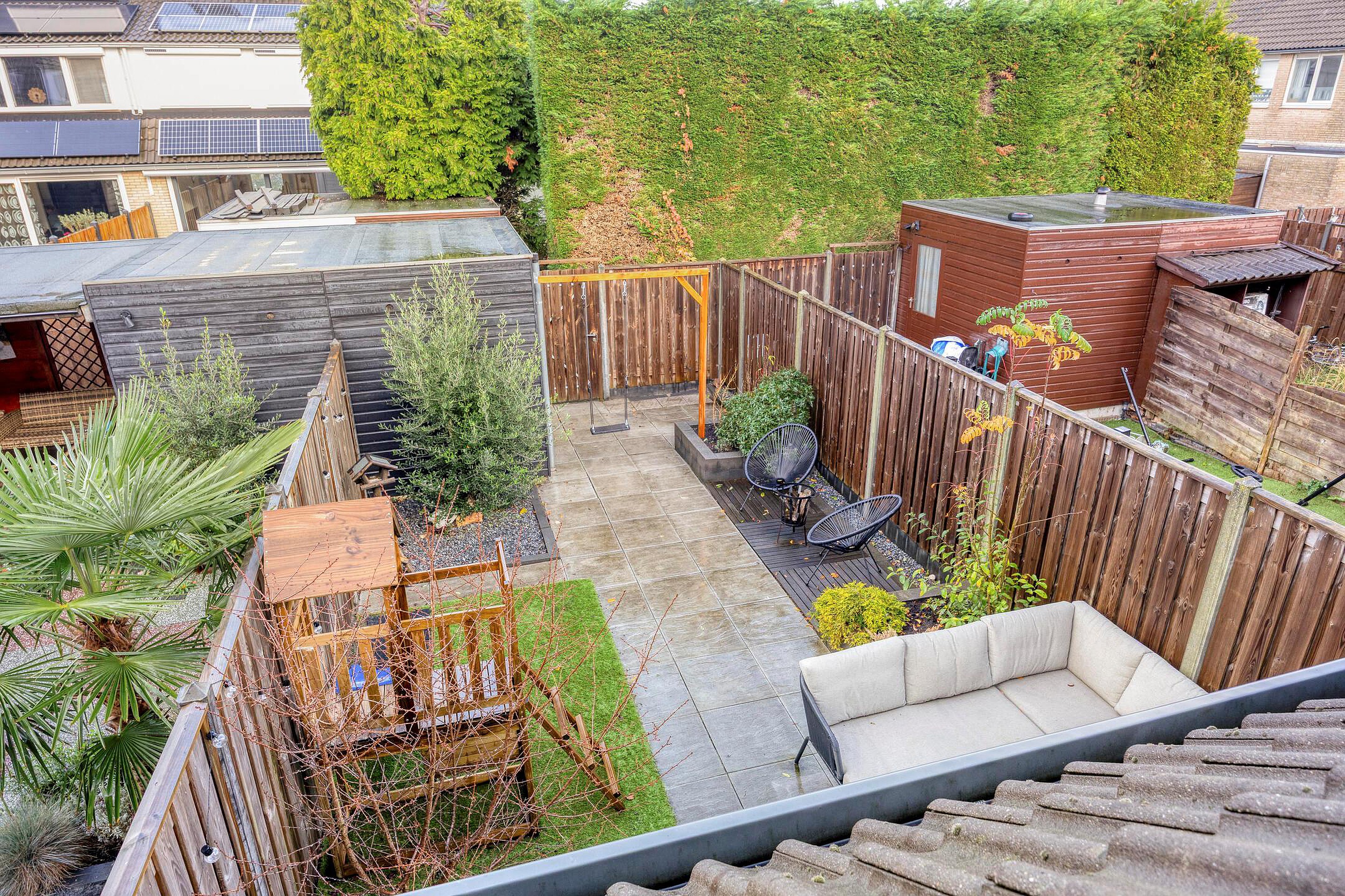 Achtertuin, een heerlijke achtertuin, gesitueerd op het noord/westen (middag- en avondzon) voorzien van diverse groen, kunstgras, sierbestrating, houten berging, buitenkraan en achterom.