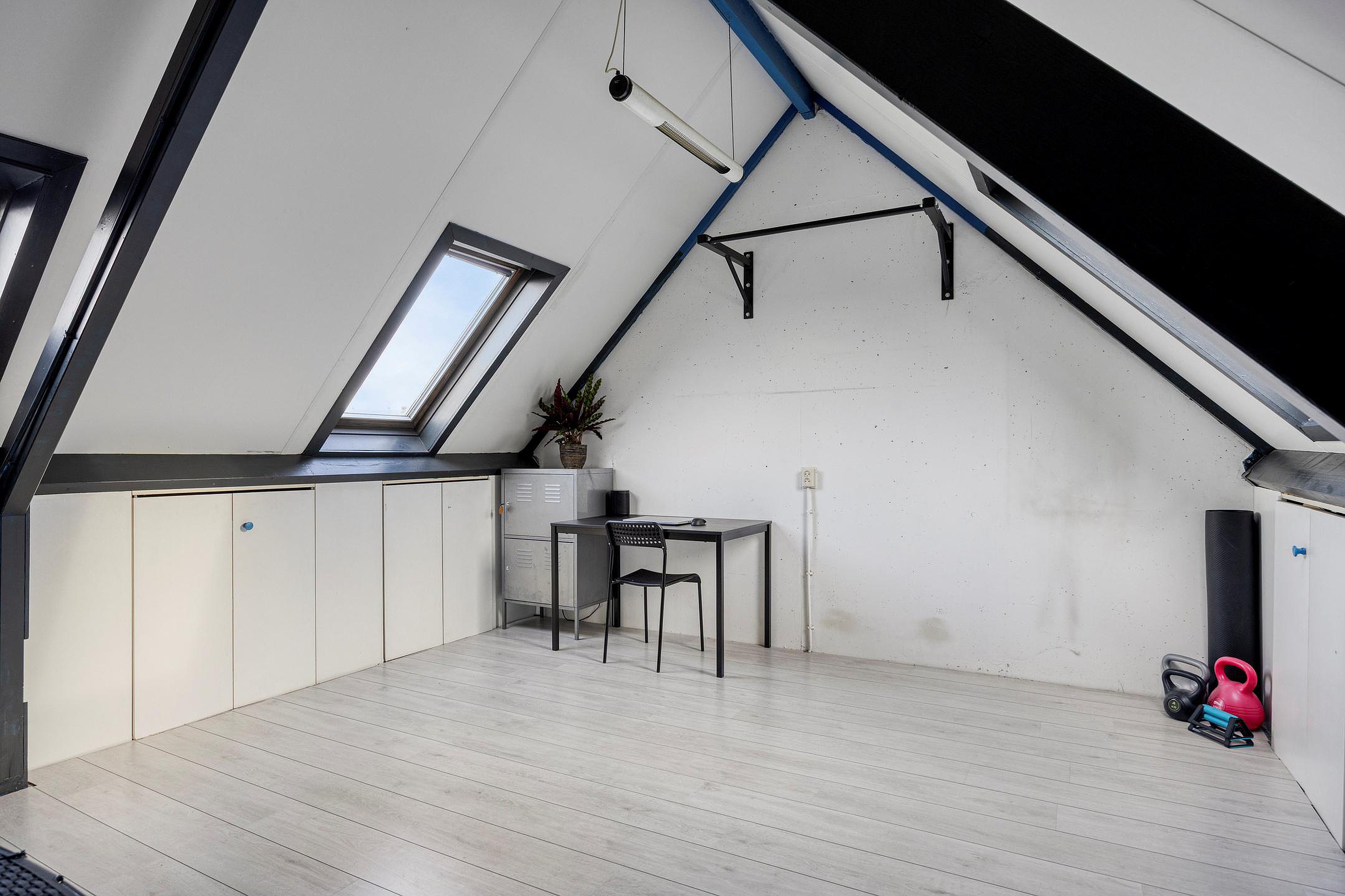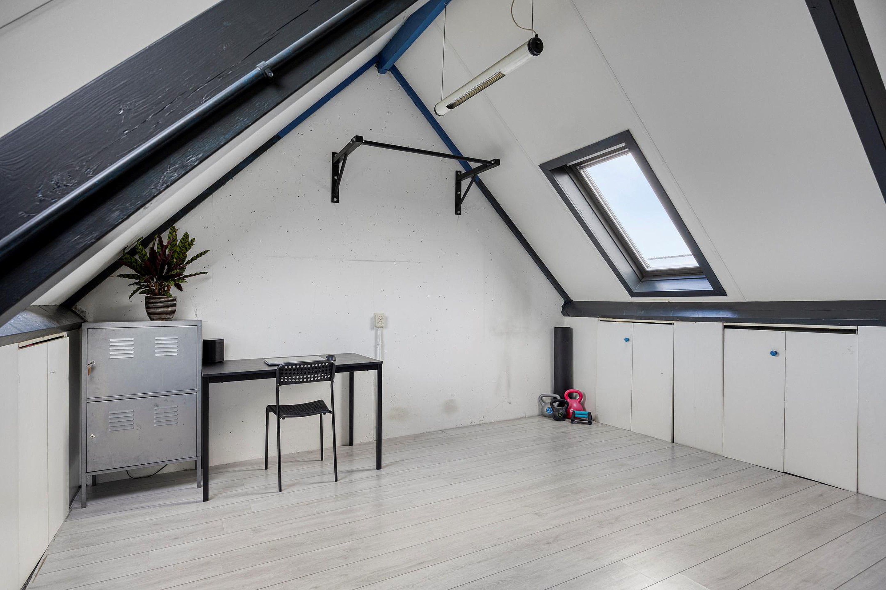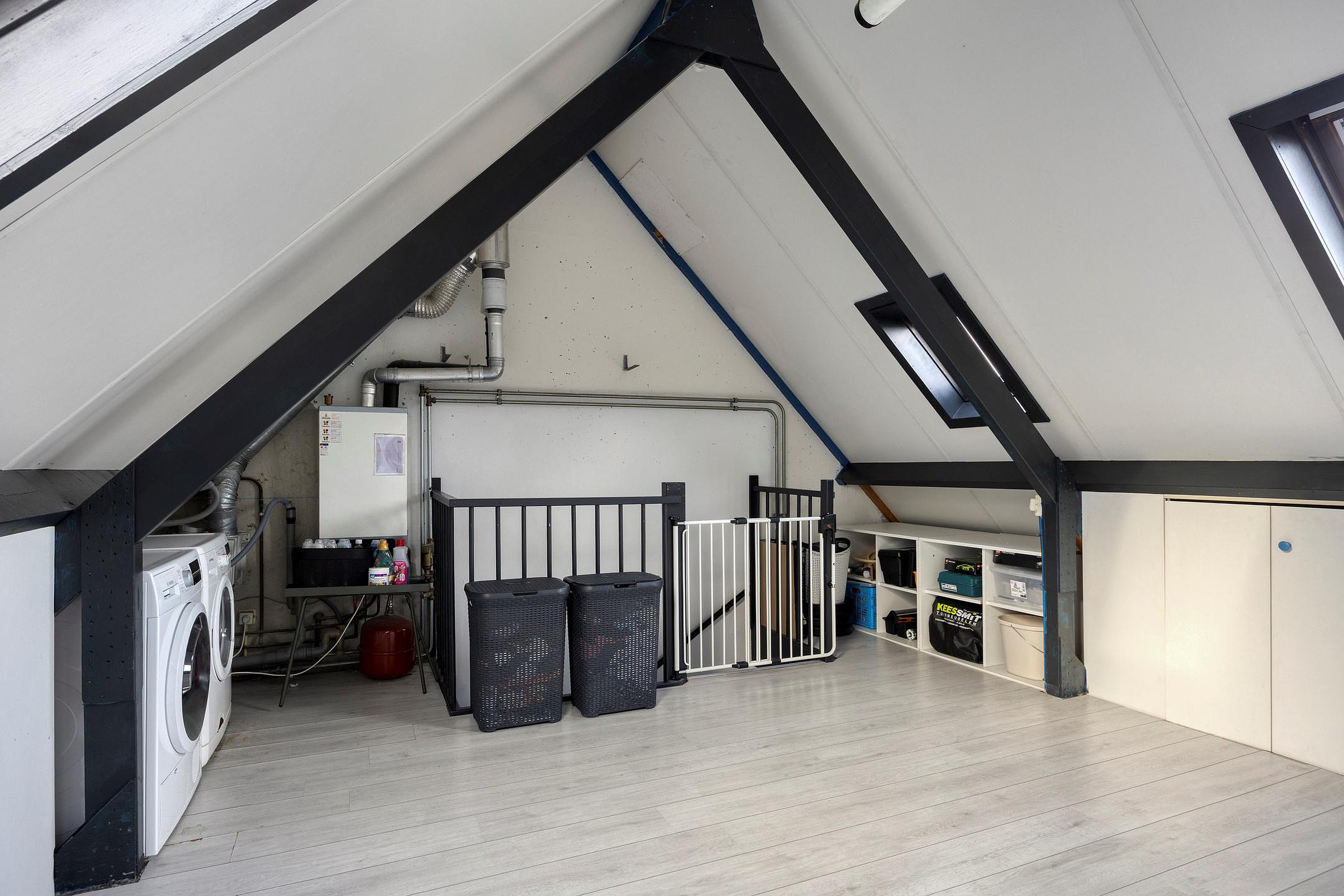 Zolderkamer, voorzien van laminaat vloerafwerking (2019), 3 Velux dakramen, bergruimte achter de knieschotten, wasmachine- en drogeraansluiting en toegang tot de opstelling cv-ketel en mechanische ventilatie unit.