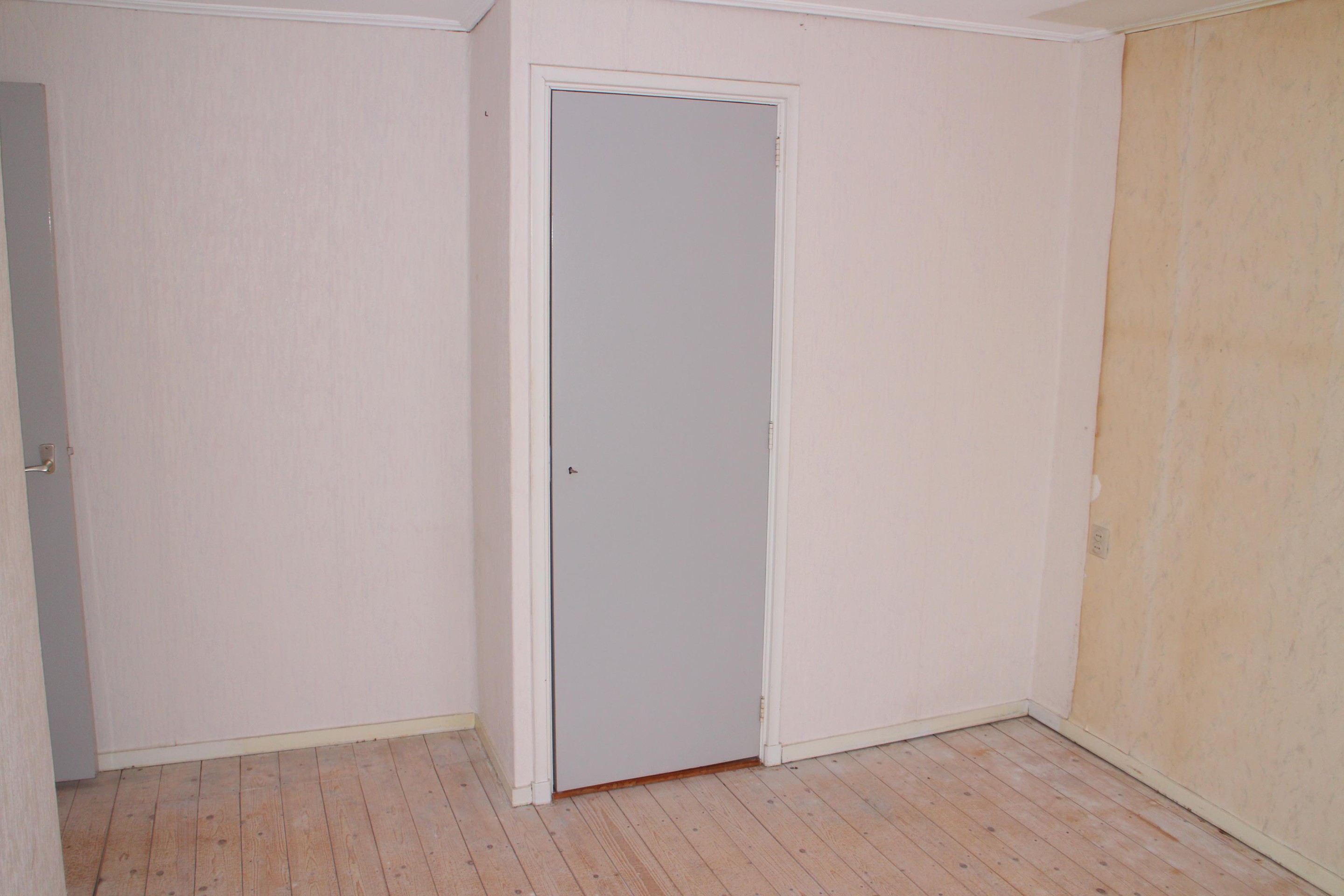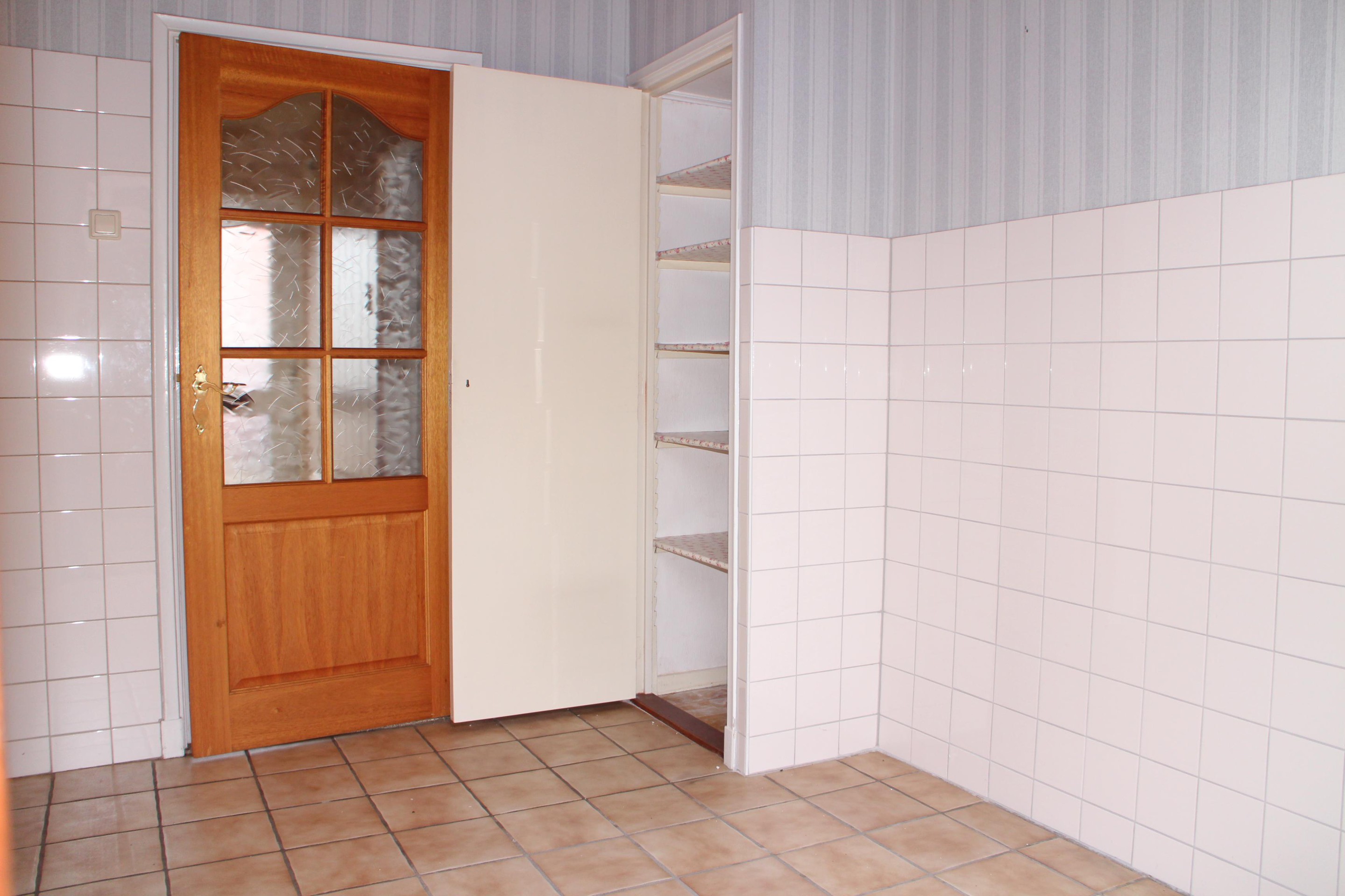 Begane grond Hal met toilet, trap naar de verdieping, kelderkast en meterkast (4 groepen en 1 aardlekschakelaar). Woonkeuken met keukenblok en bovenkasten. Ruimte en aansluiting voor een gaskooktoestel. Er is een doorgeefkast naar de woonkamer (22m2).