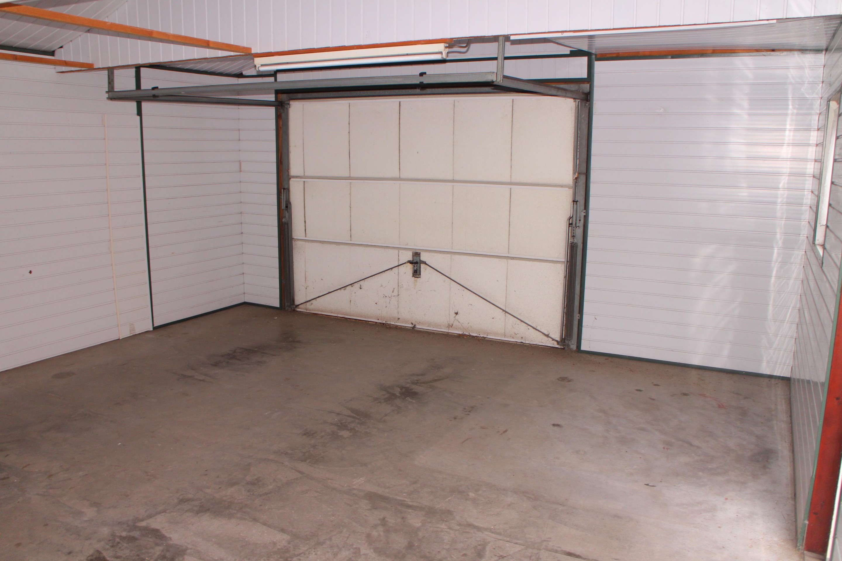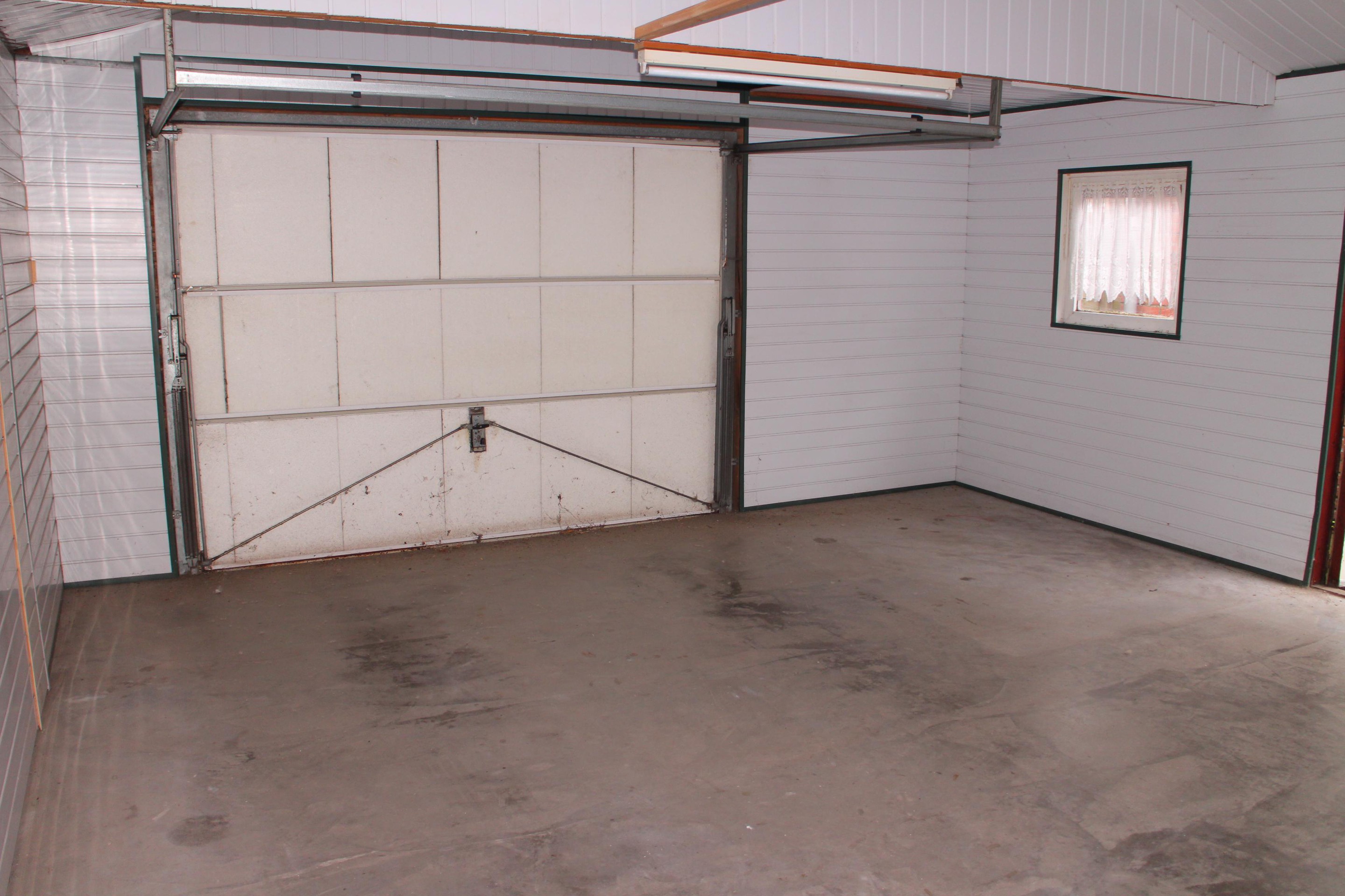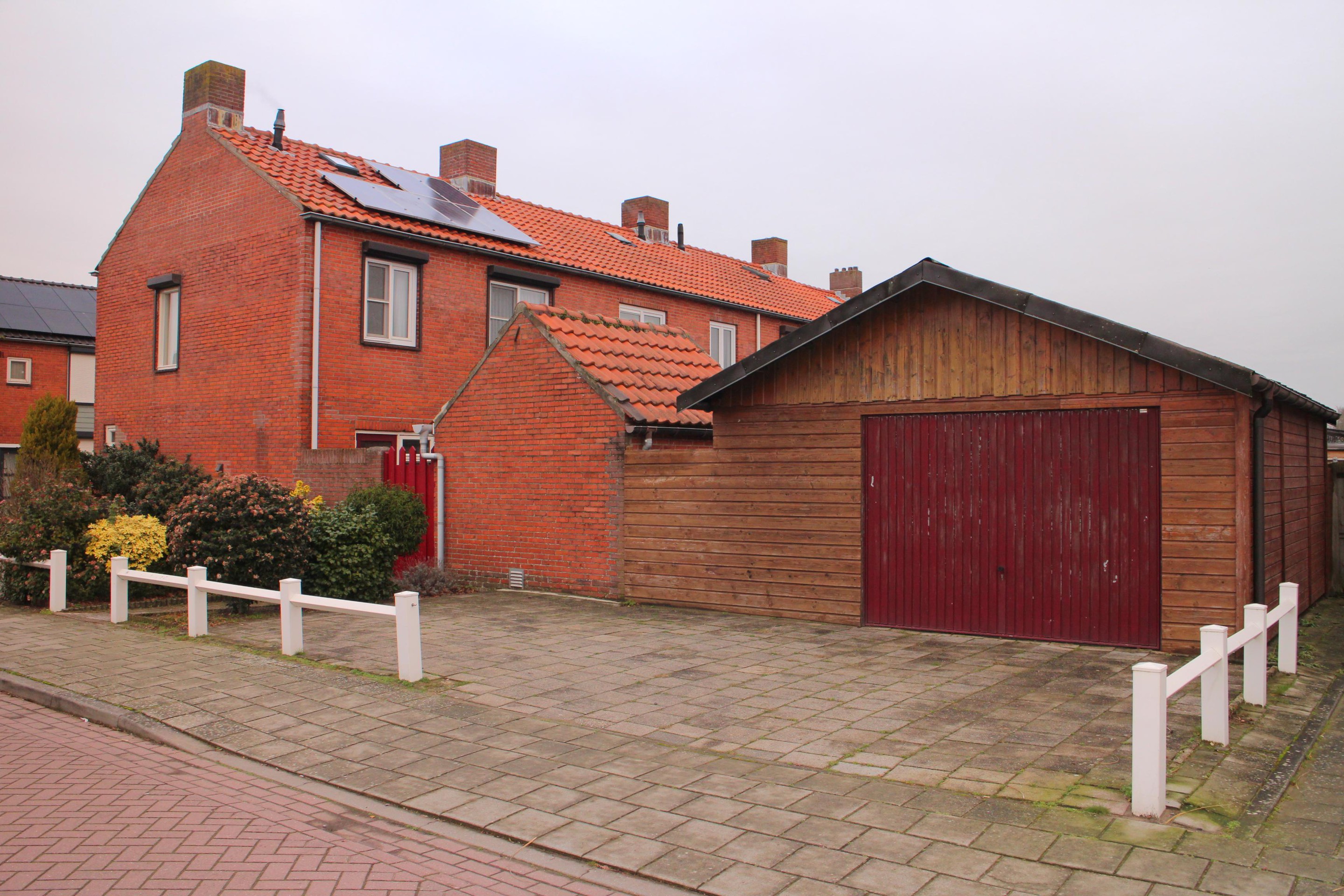 Achter de berging is een houten garage met kantelpoort geplaatst (27m2)