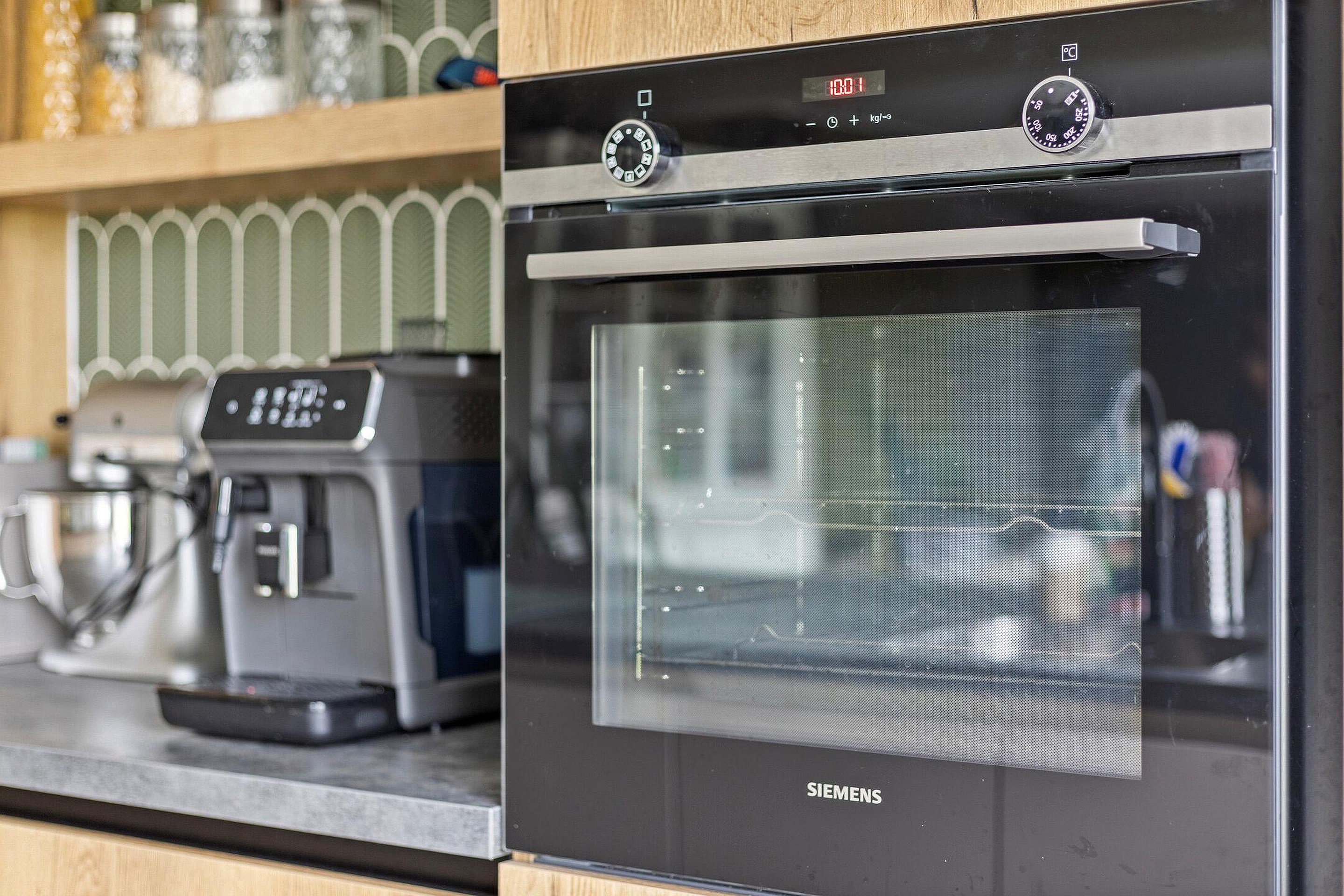 De woonkamer is bijzonder royaal en licht, met een hoogwaardige open keuken voorzien van topapparatuur: Bora inductiekookplaat, oven, koelkast, vaatwasser en boiler. Twee grote schuifpuien verbinden de leefruimte naadloos met de zonnige tuin, waardoor binnen en buiten één geheel vormen en u volop kunt genieten van het uitzicht.