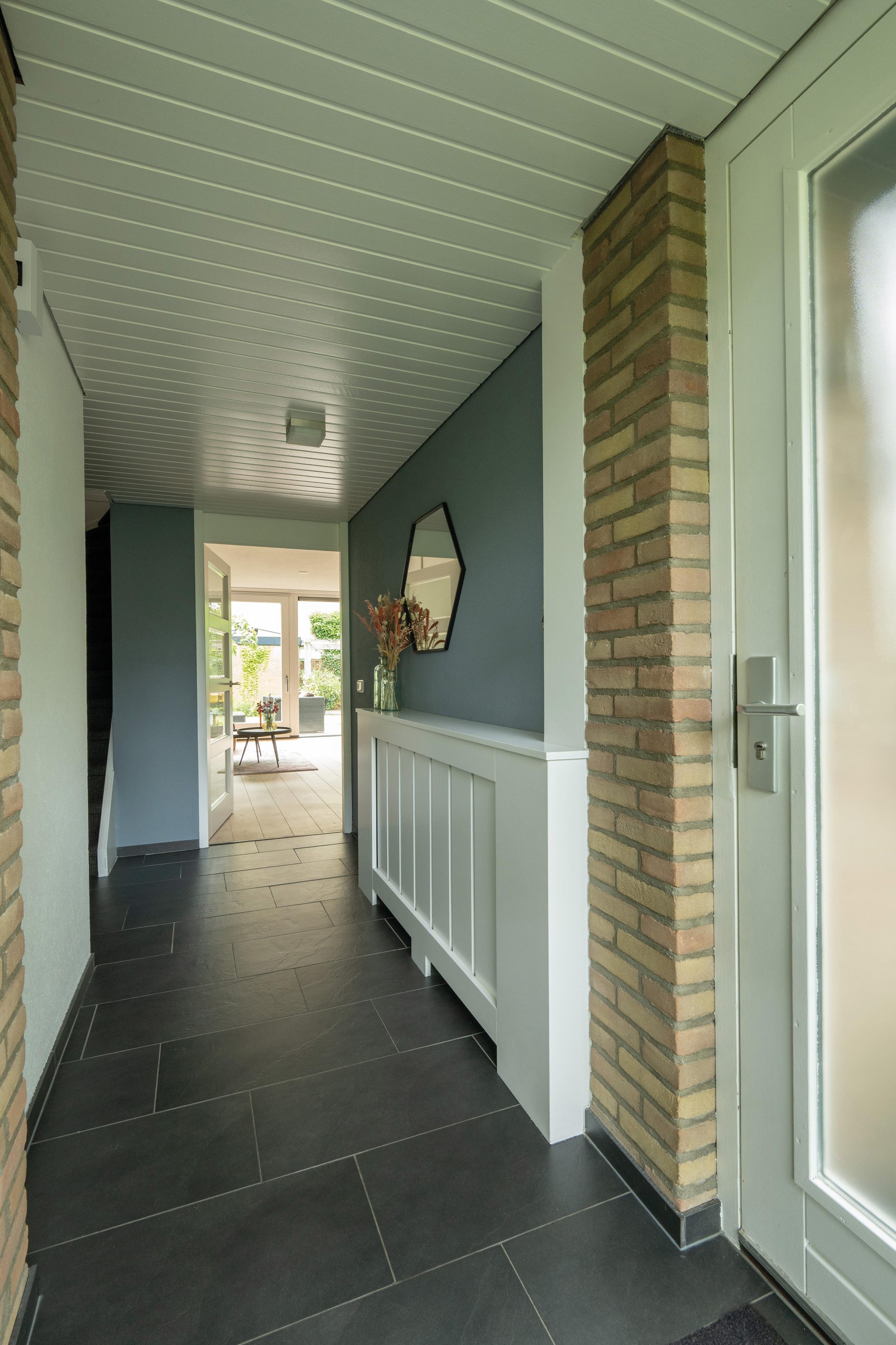De hal geeft toegang tot het toilet, de meterkast, de trapopgang en de woonkamer.