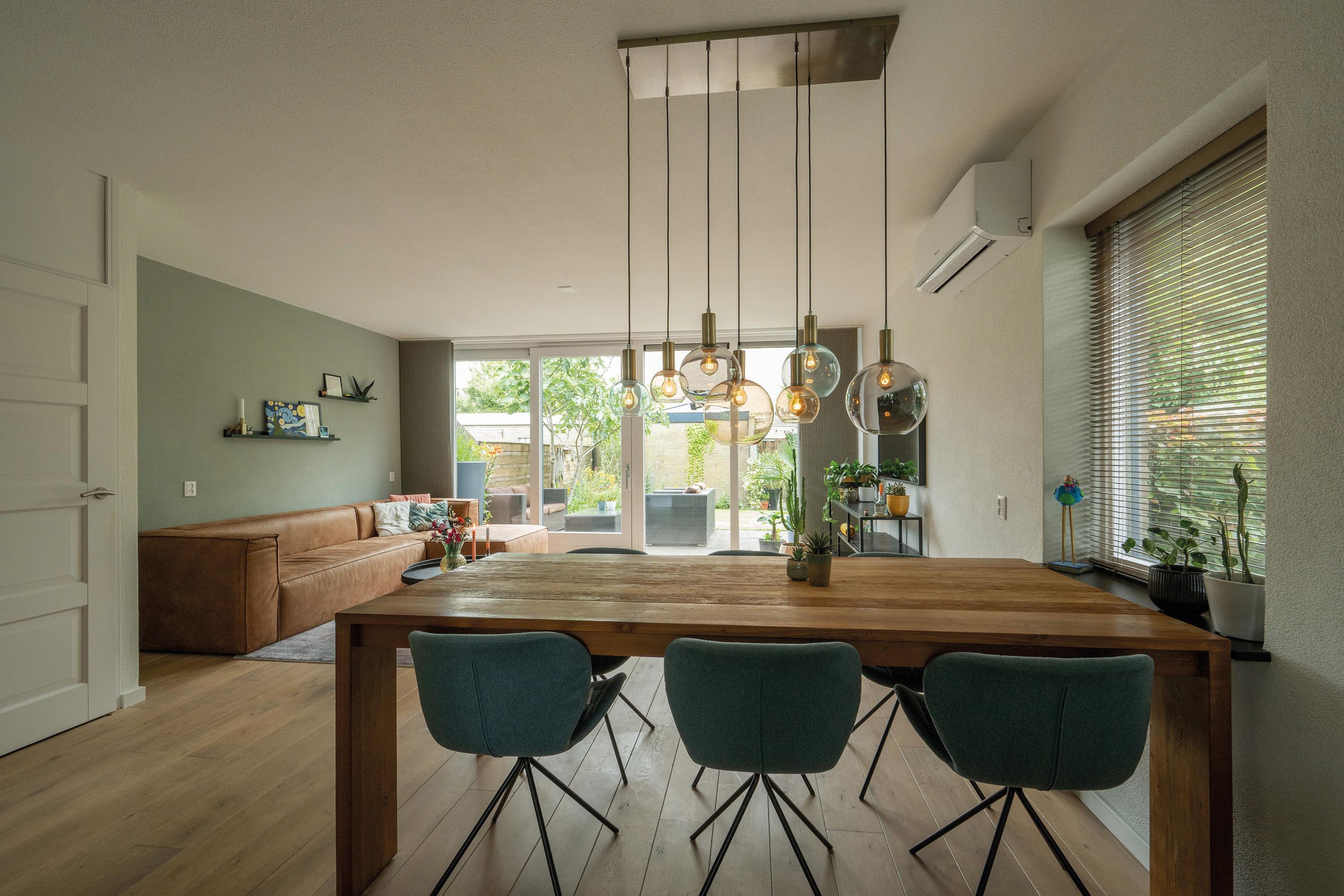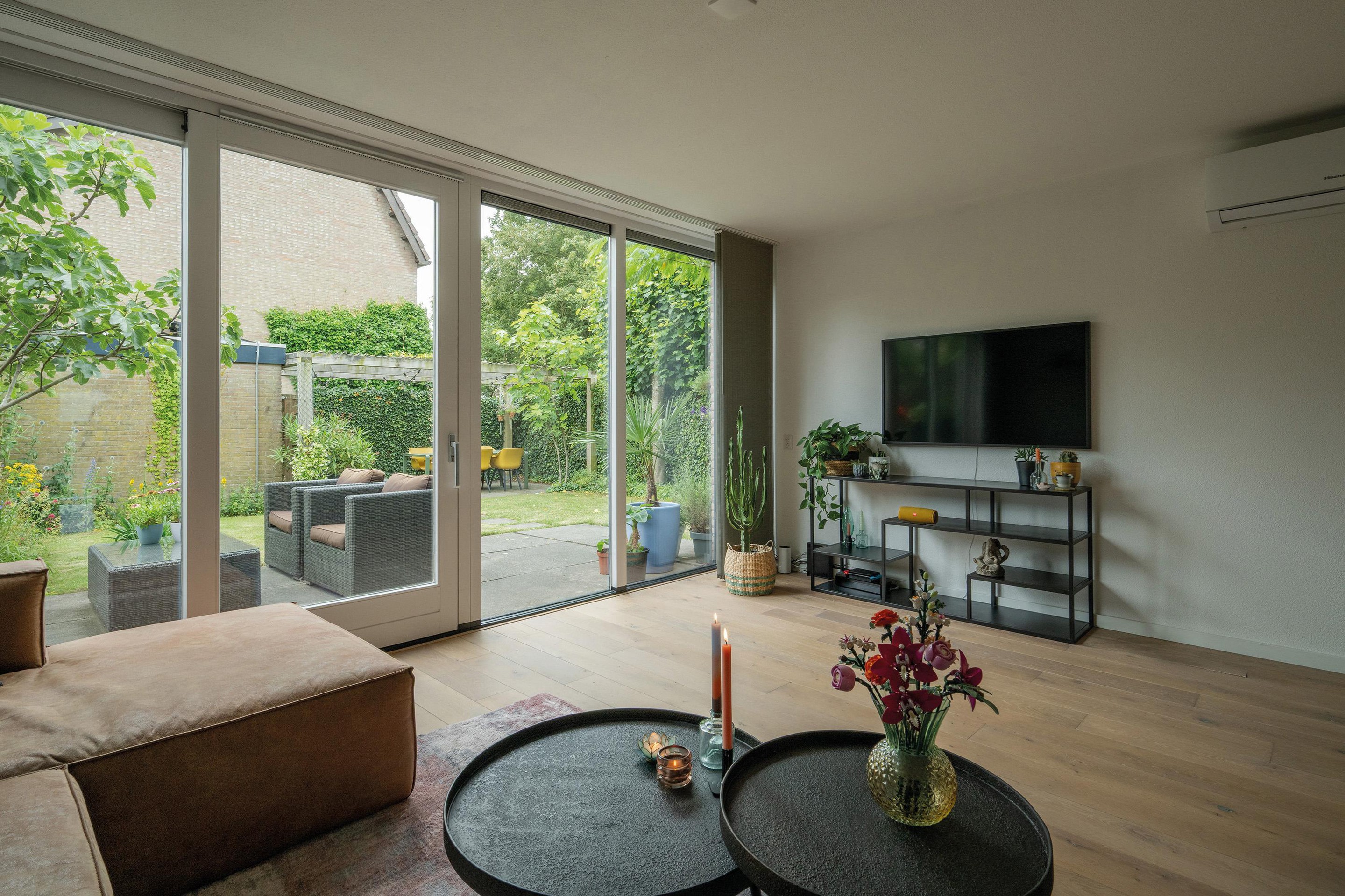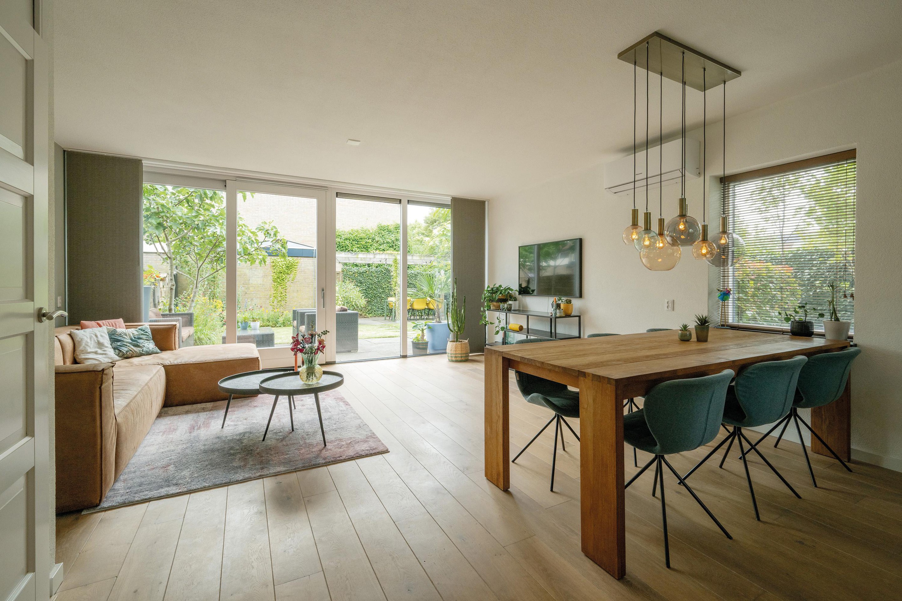 De woonkamer (met airconditioning voor koelen en verwarmen) krijgt veel daglicht via de brede achterpui en het zijraam.