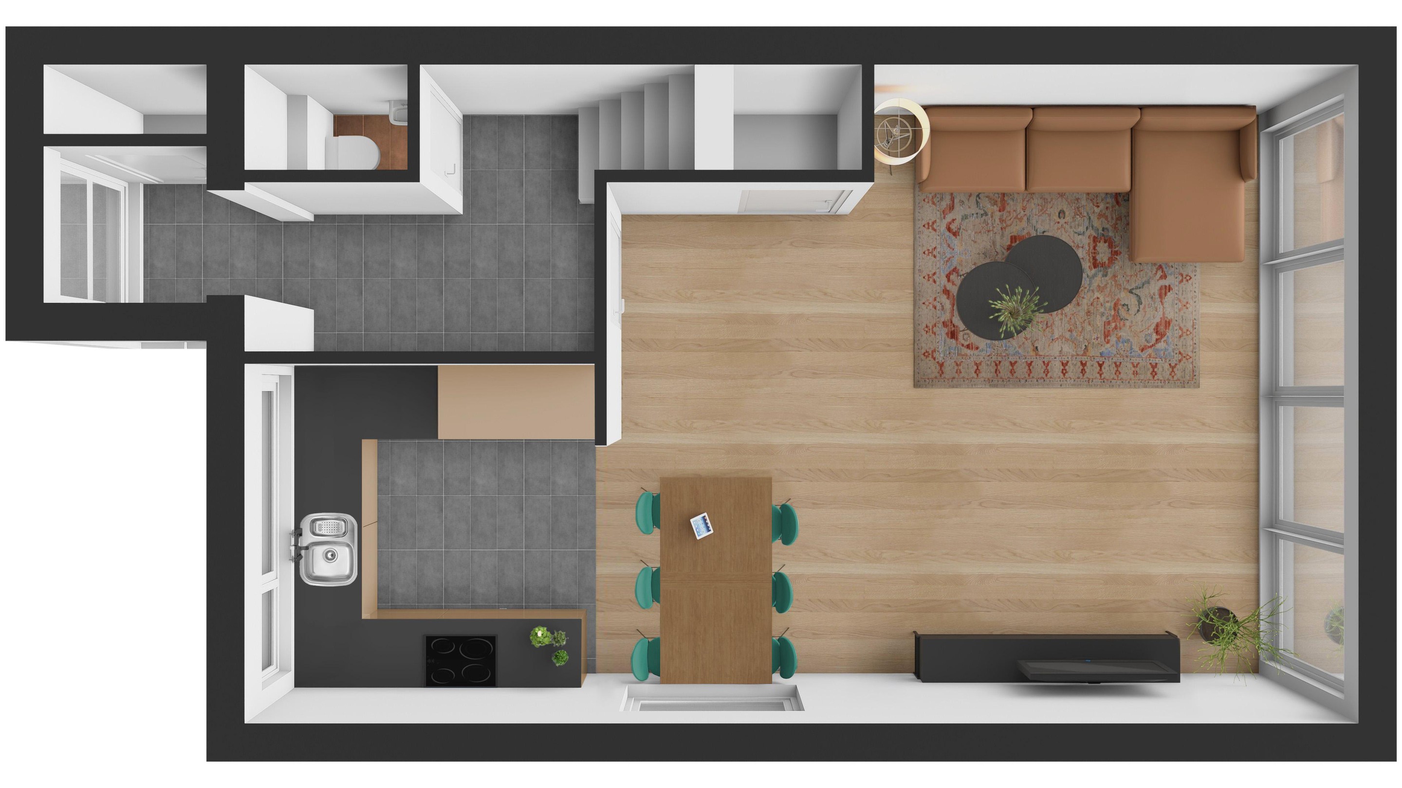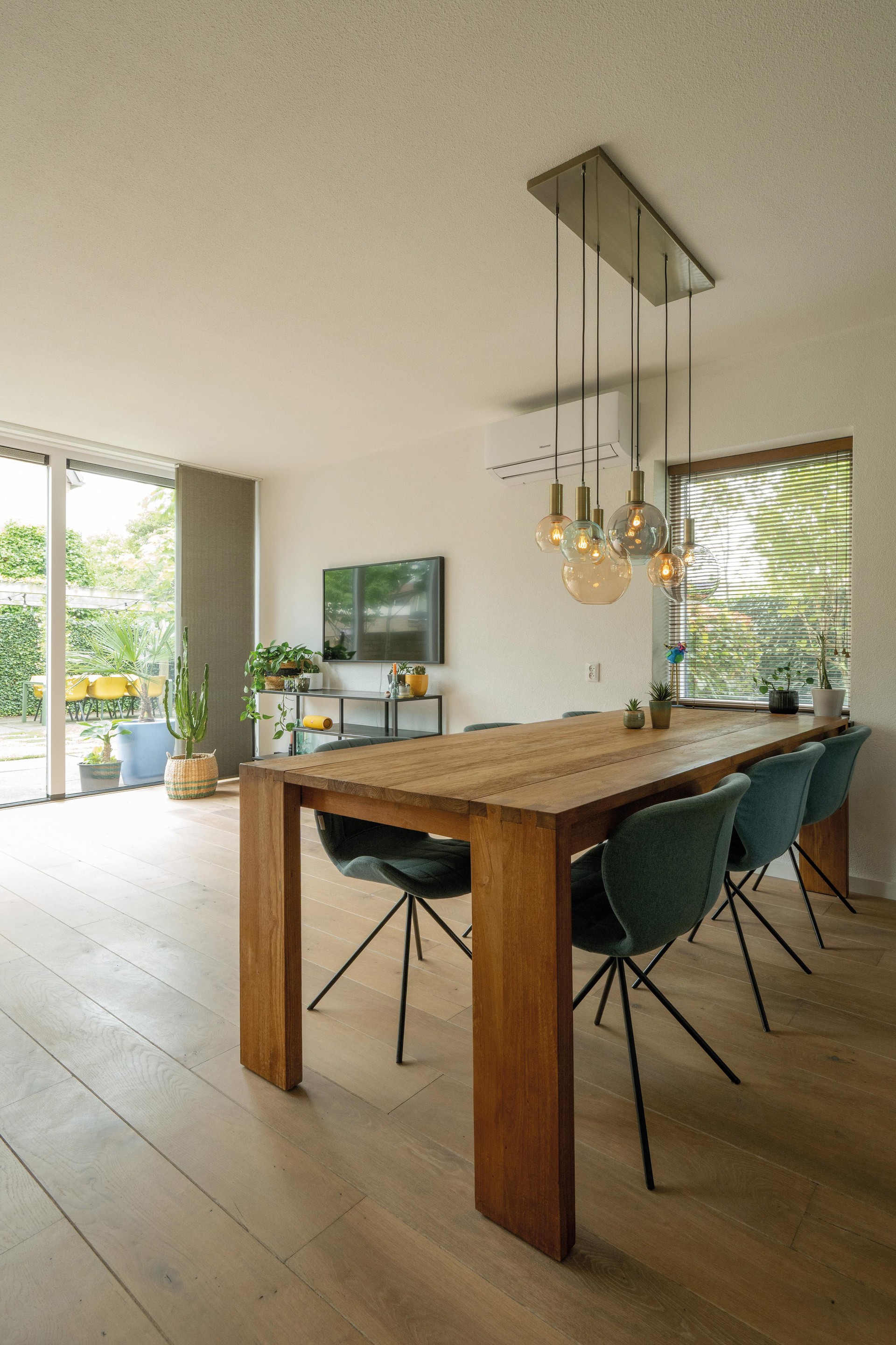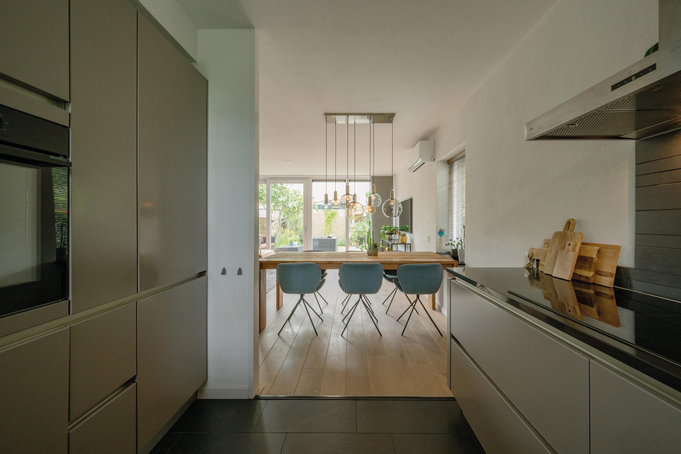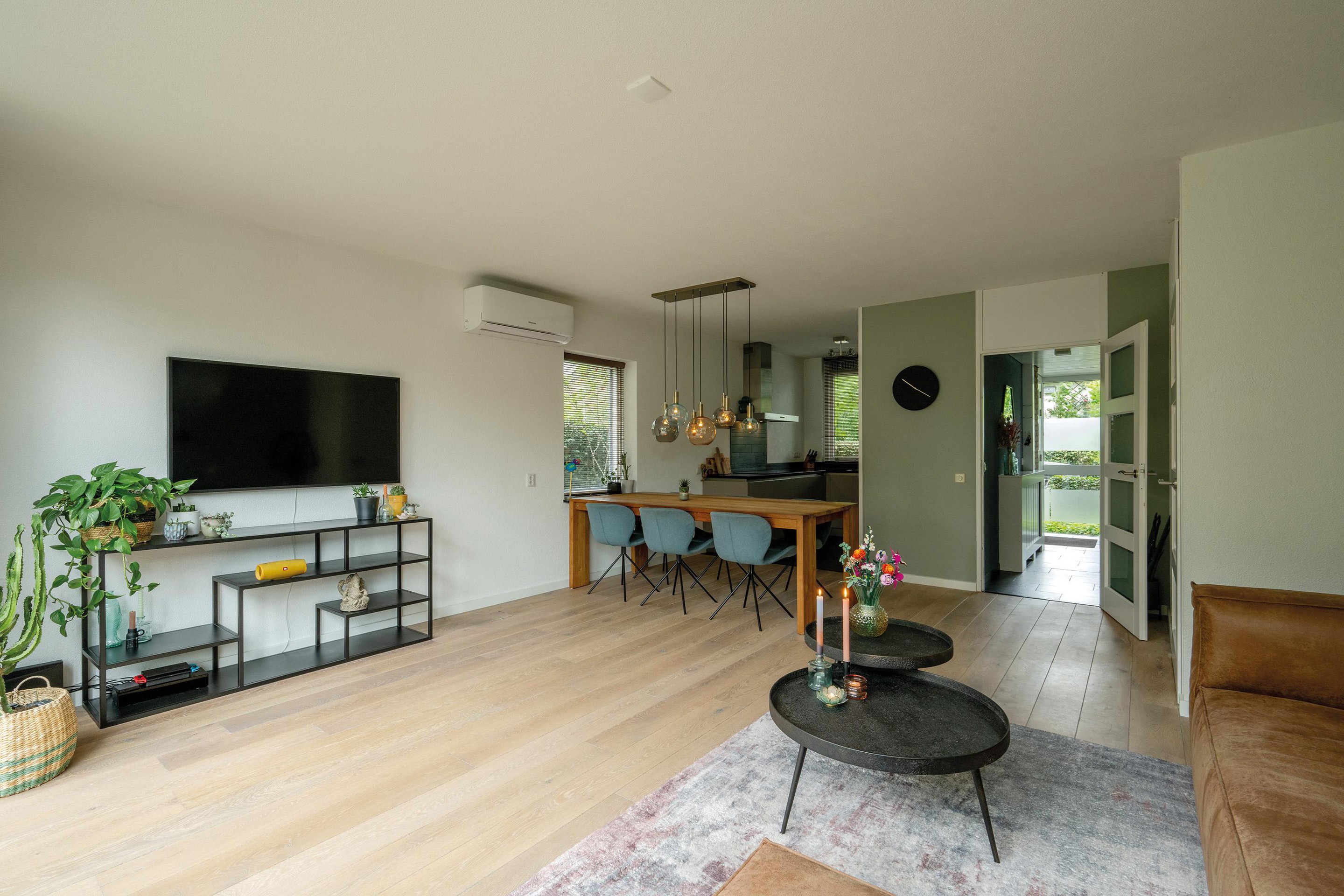 De woonkamer (met airconditioning voor koelen en verwarmen) krijgt veel daglicht via de brede achterpui en het zijraam.