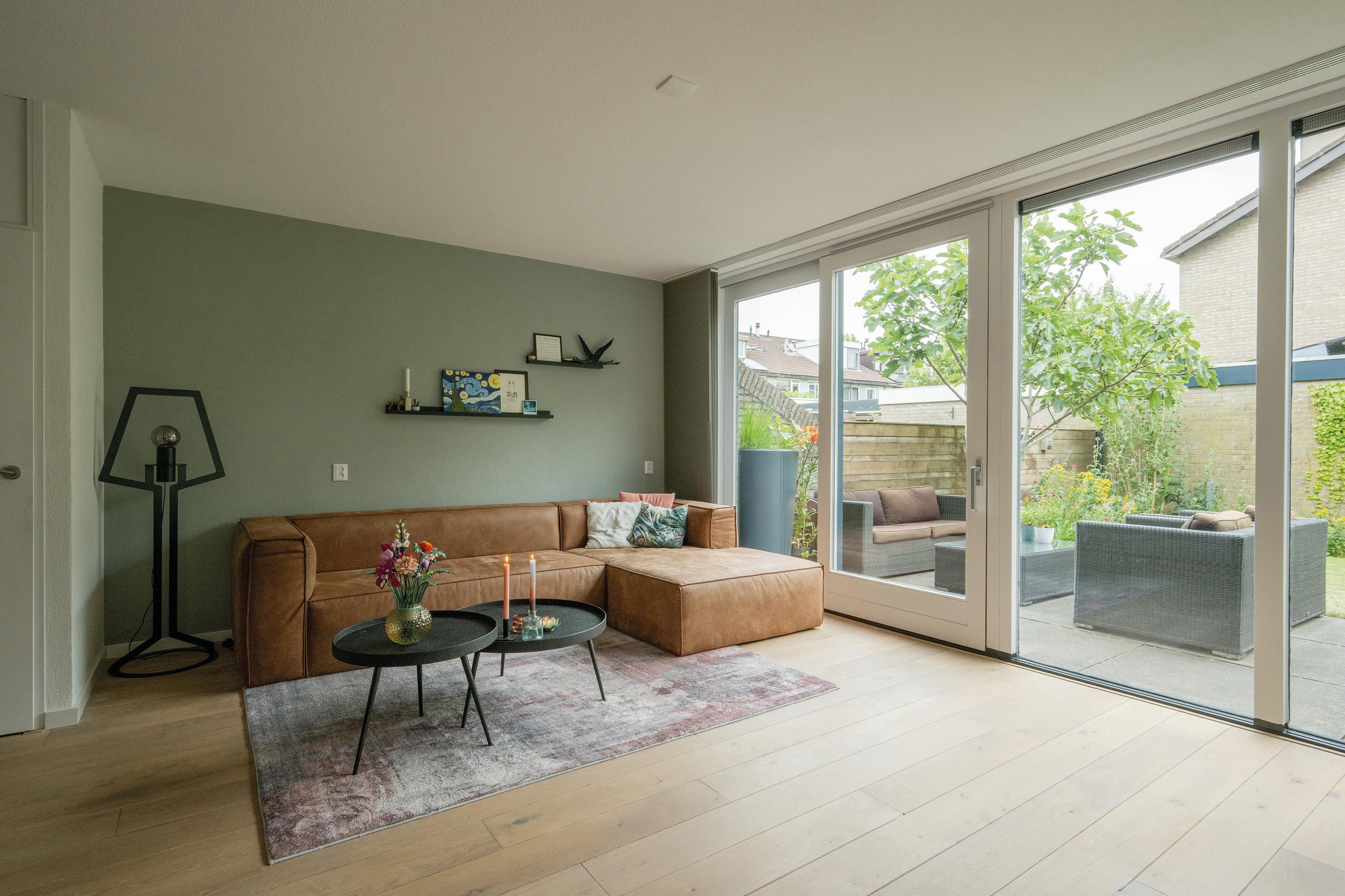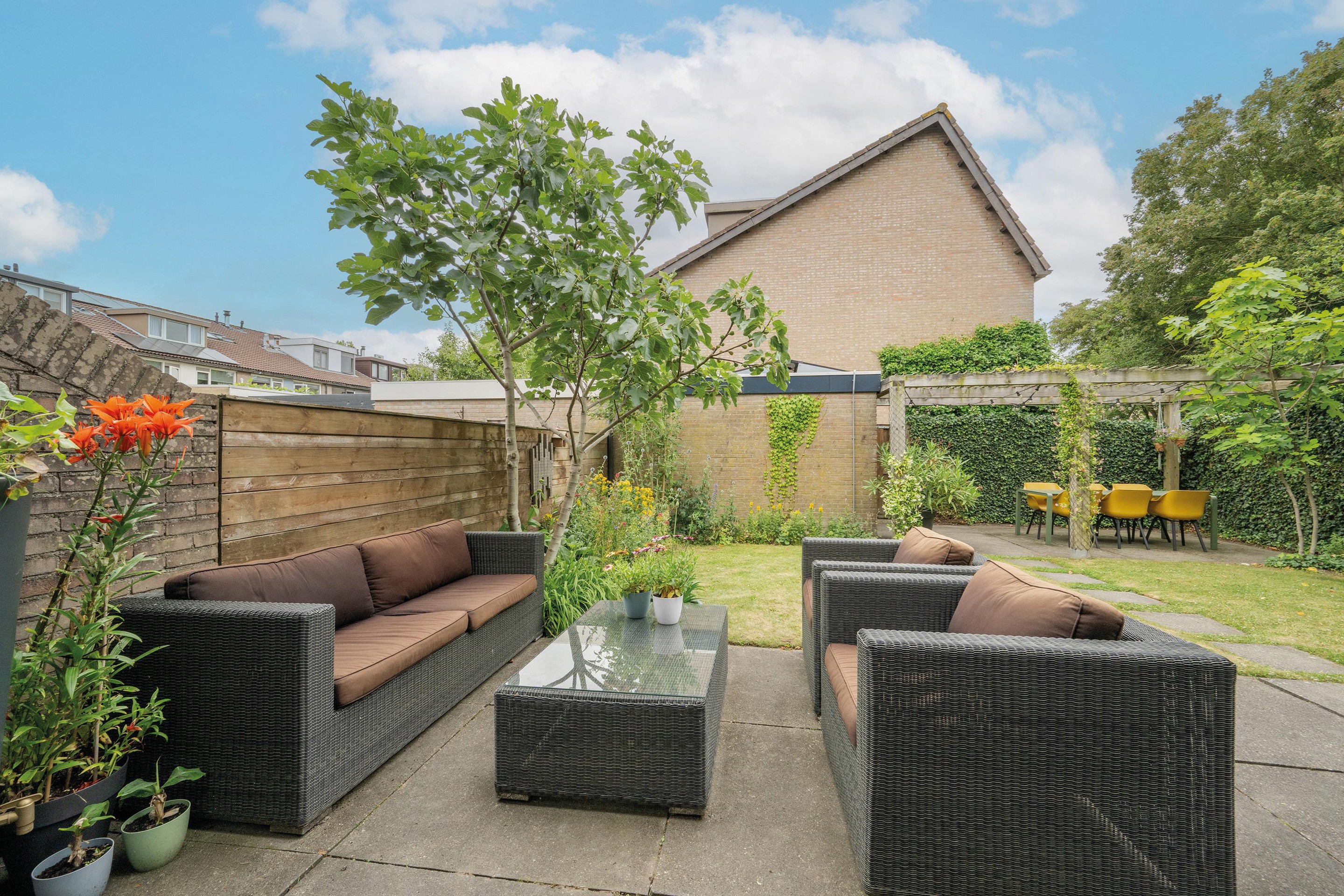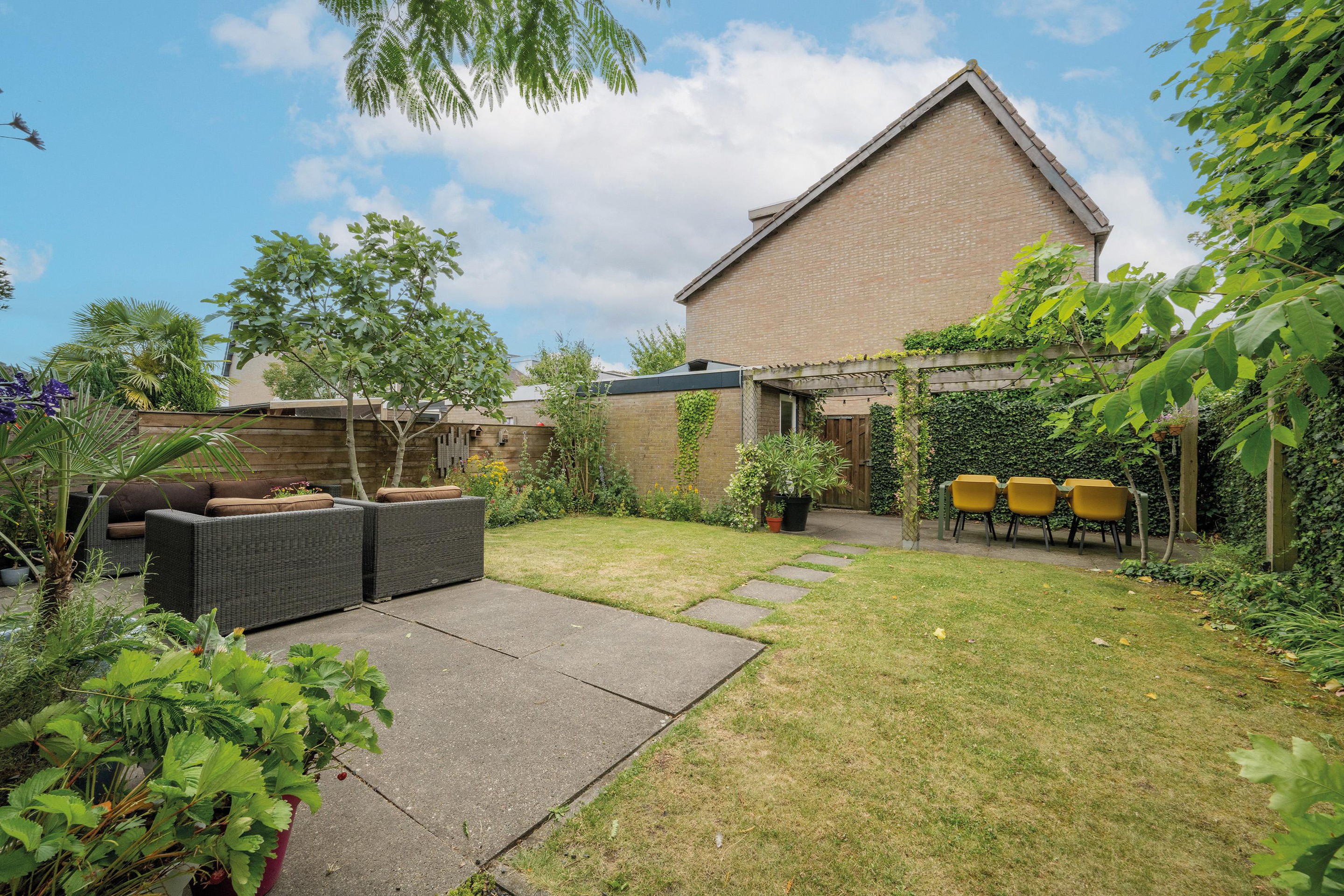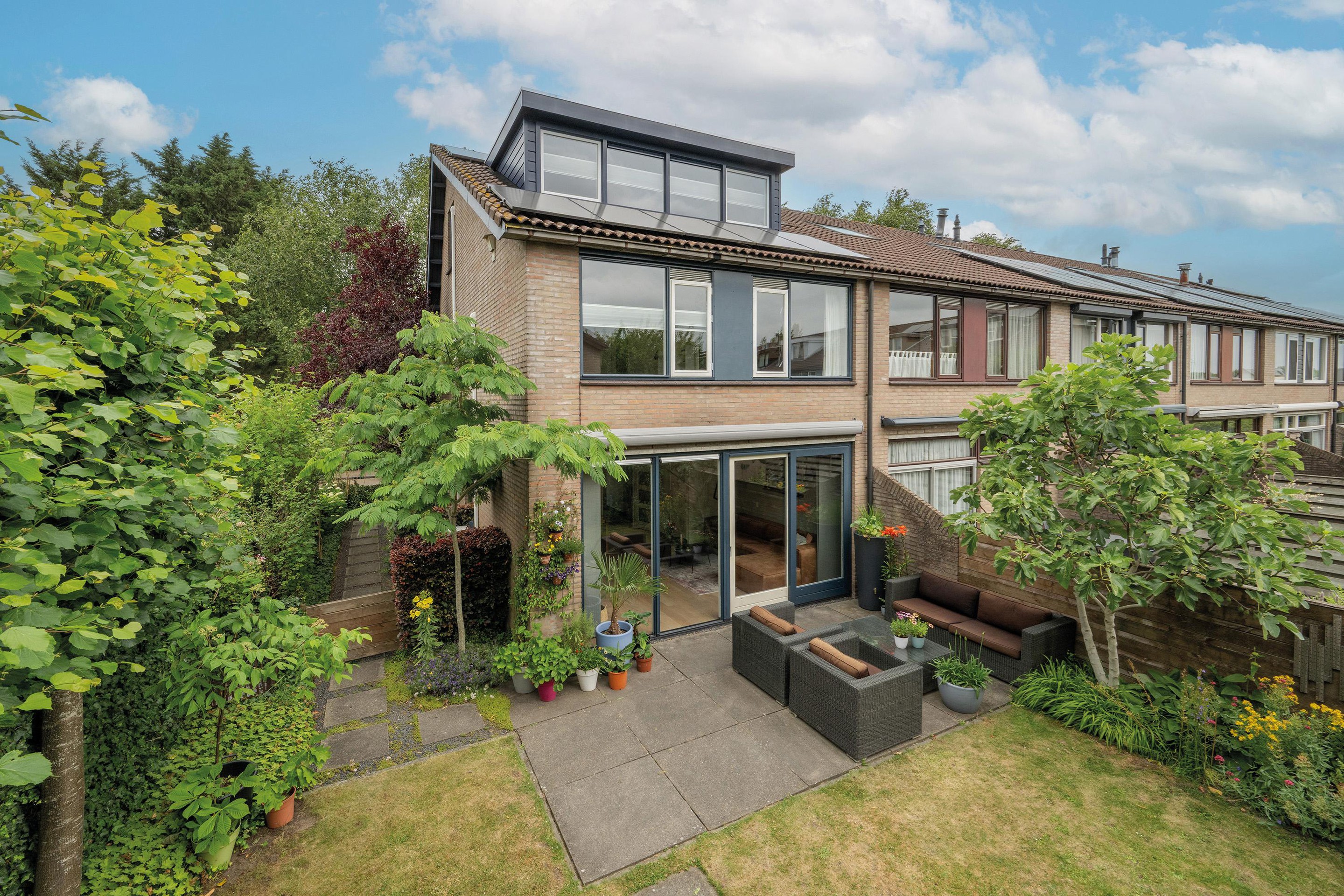Via de brede kamerhoge schuifpui bereik je de achtertuin, die ook toegang biedt tot de vrijstaande stenen berging en een achterom.
