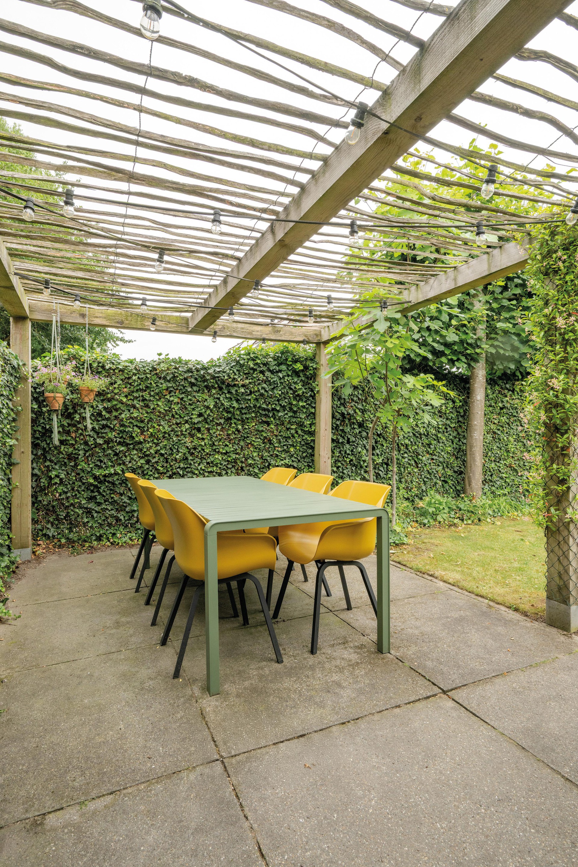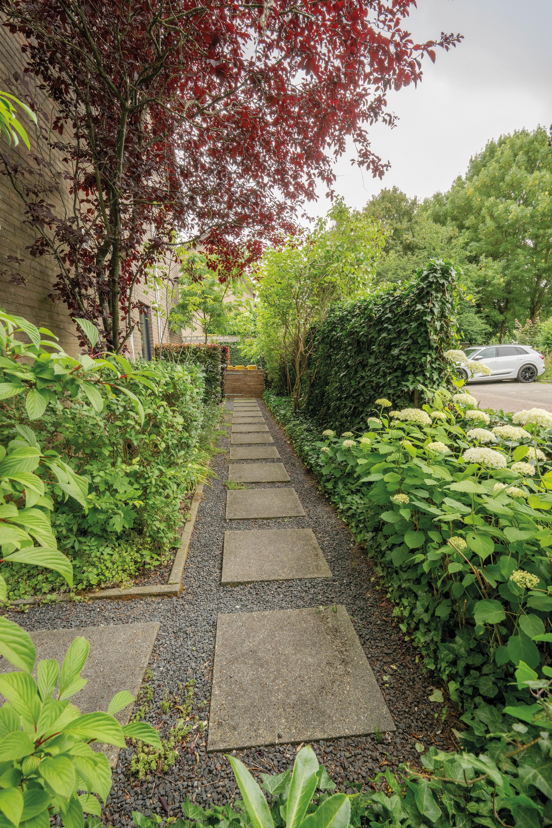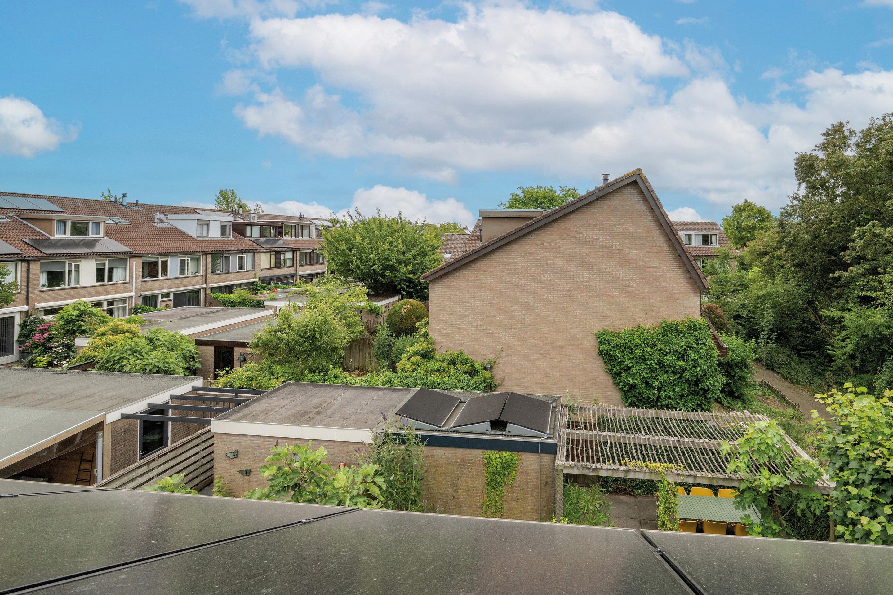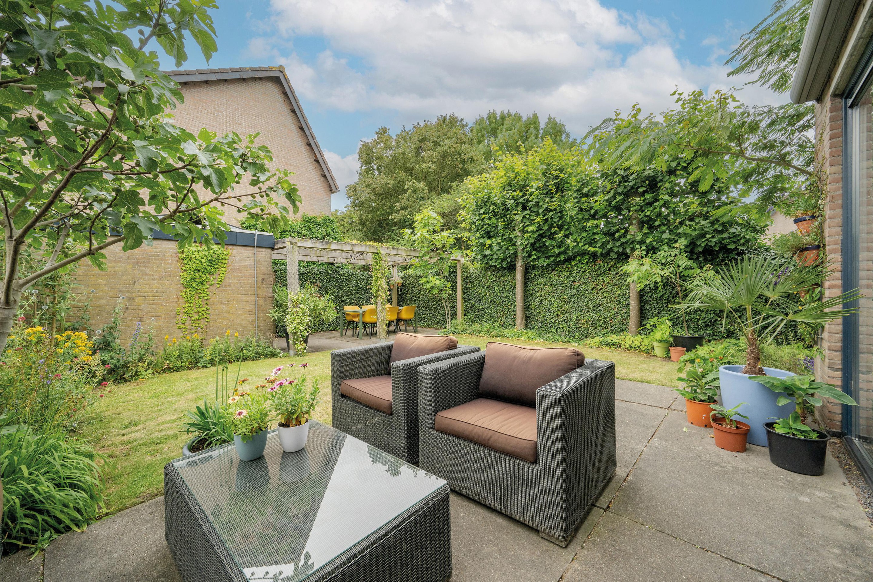 Via de brede kamerhoge schuifpui bereik je de achtertuin, die ook toegang biedt tot de vrijstaande stenen berging en een achterom.