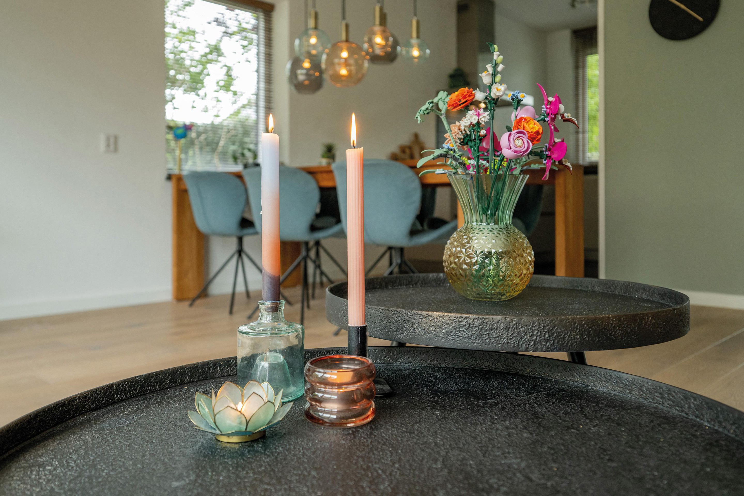 Naast wanden en plafond met sierpleister, treffen we in de keuken een antracietkleurige tegelvloer en in de woonkamer een stoere parketvloer aan.