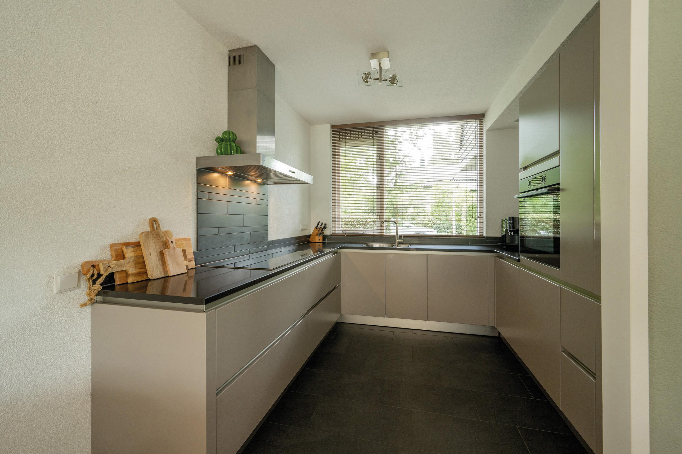 Aan de voorzijde vind je de luxe open keuken in U-opstelling welke is uitgerust met een inductiekookplaat, afzuigkap, oven, koelkast, vriezer en een vaatwasser.