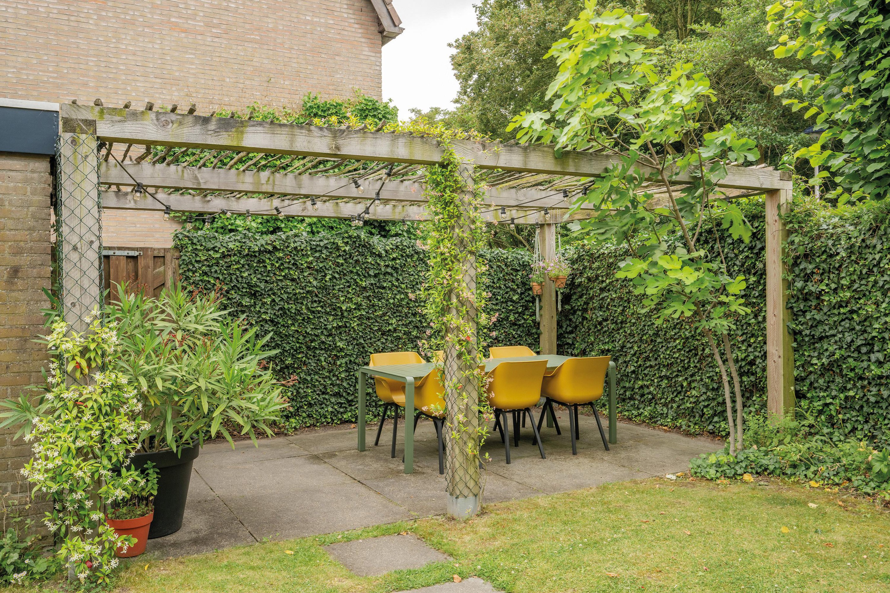 Een zonnige achtertuin met volop privacy, een stenen berging en een achterom.