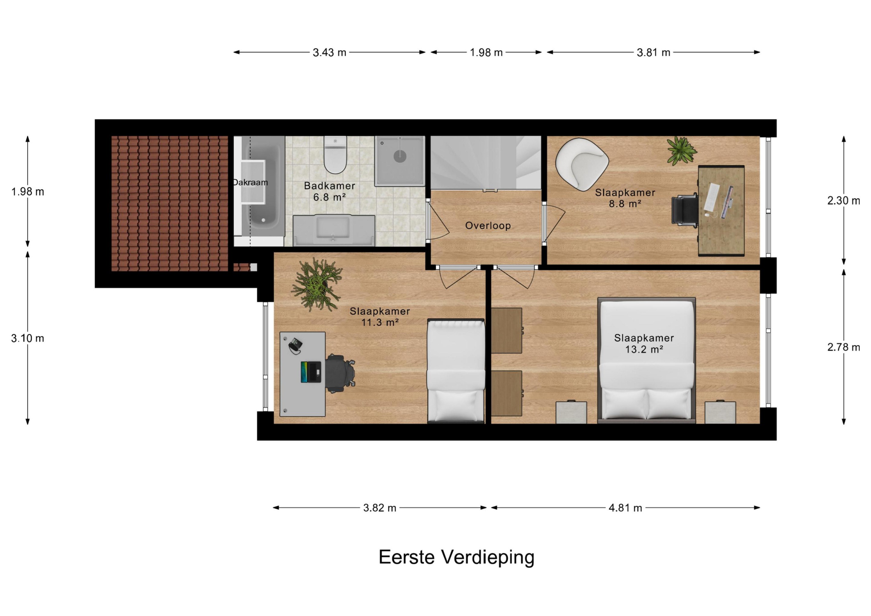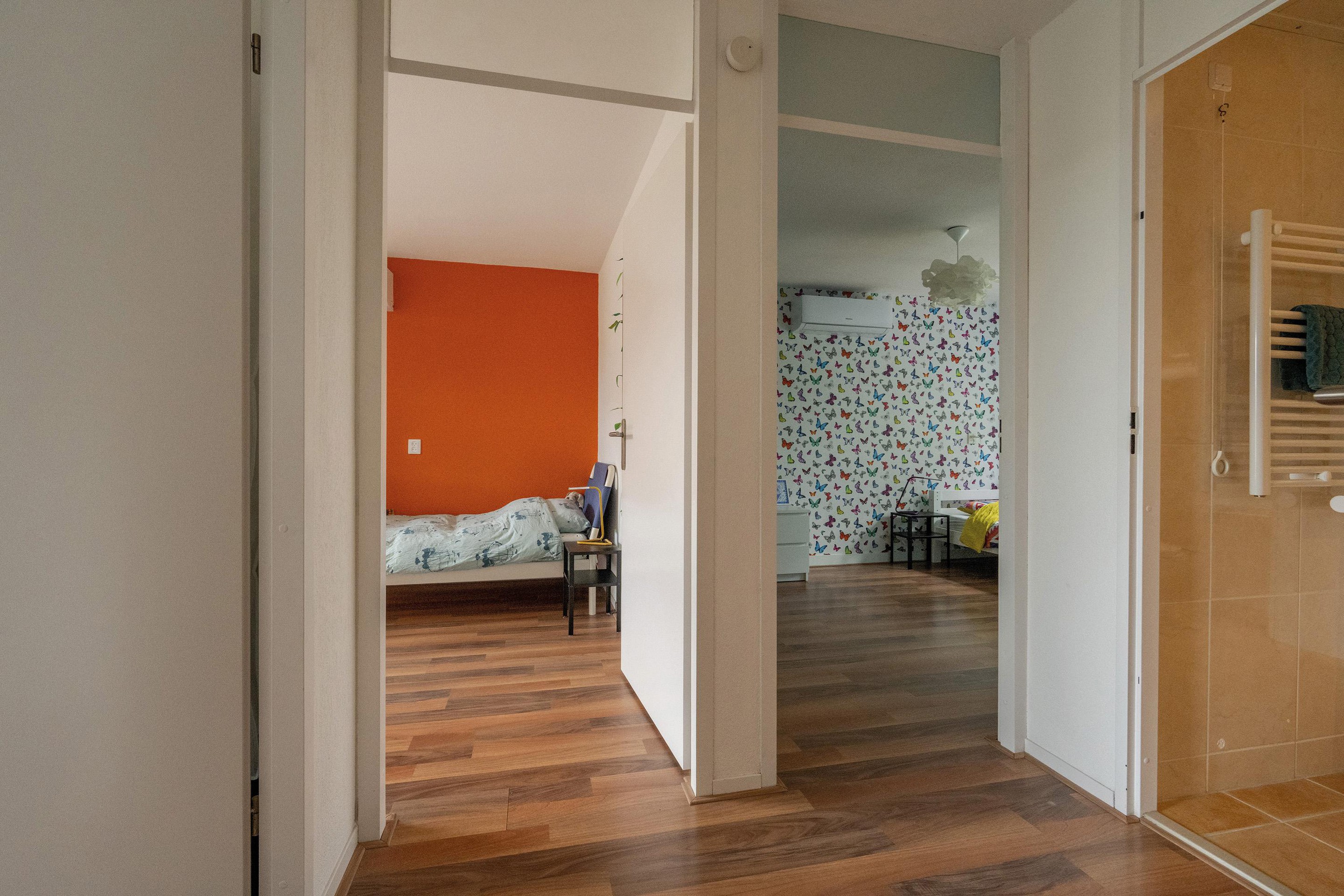 Op de eerste verdieping bevinden zich drie slaapkamers. Twee kamers van respectievelijk 13 en 11 m2 met ieder zijn eigen airconditioning voor verwarmen