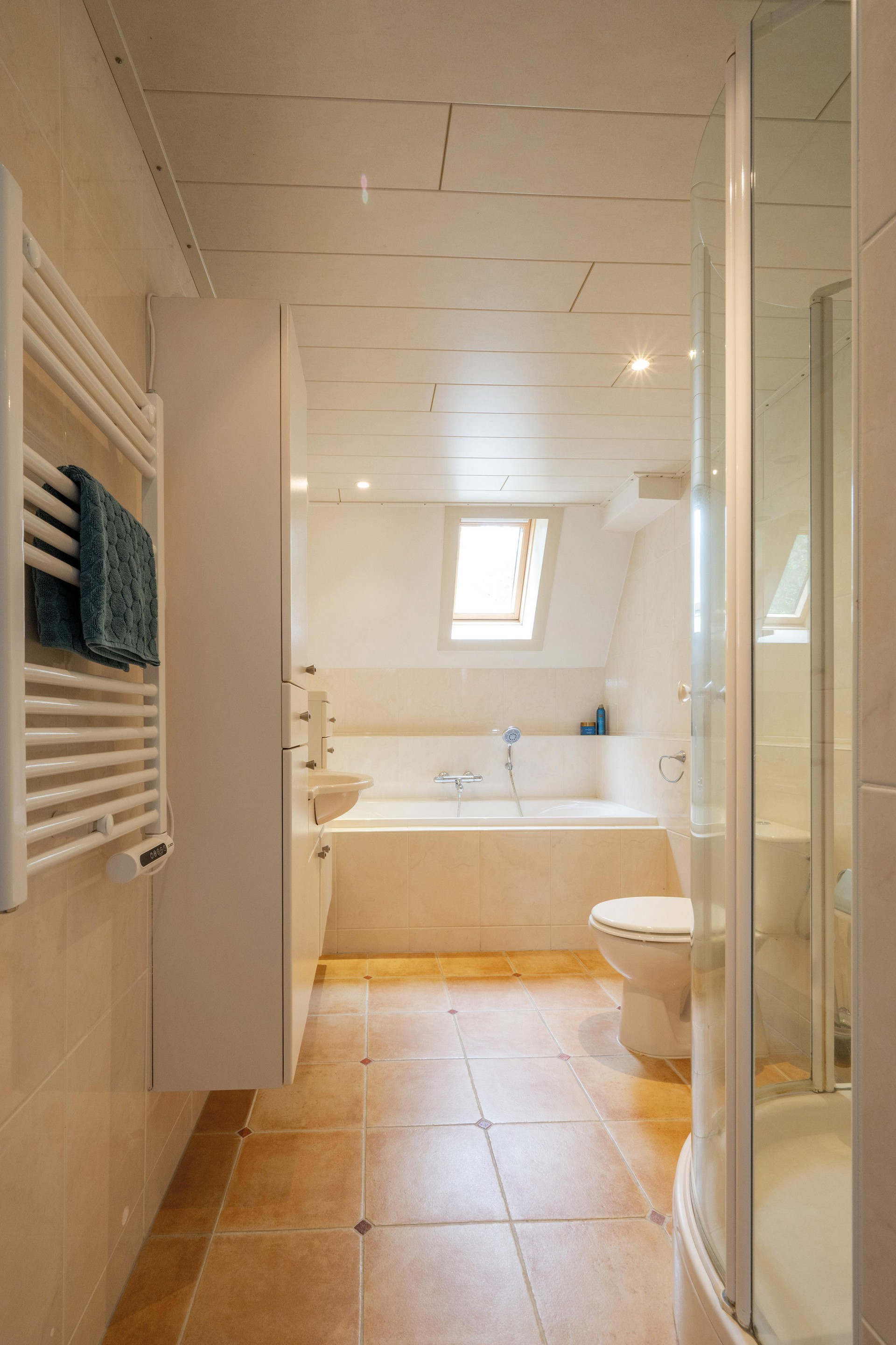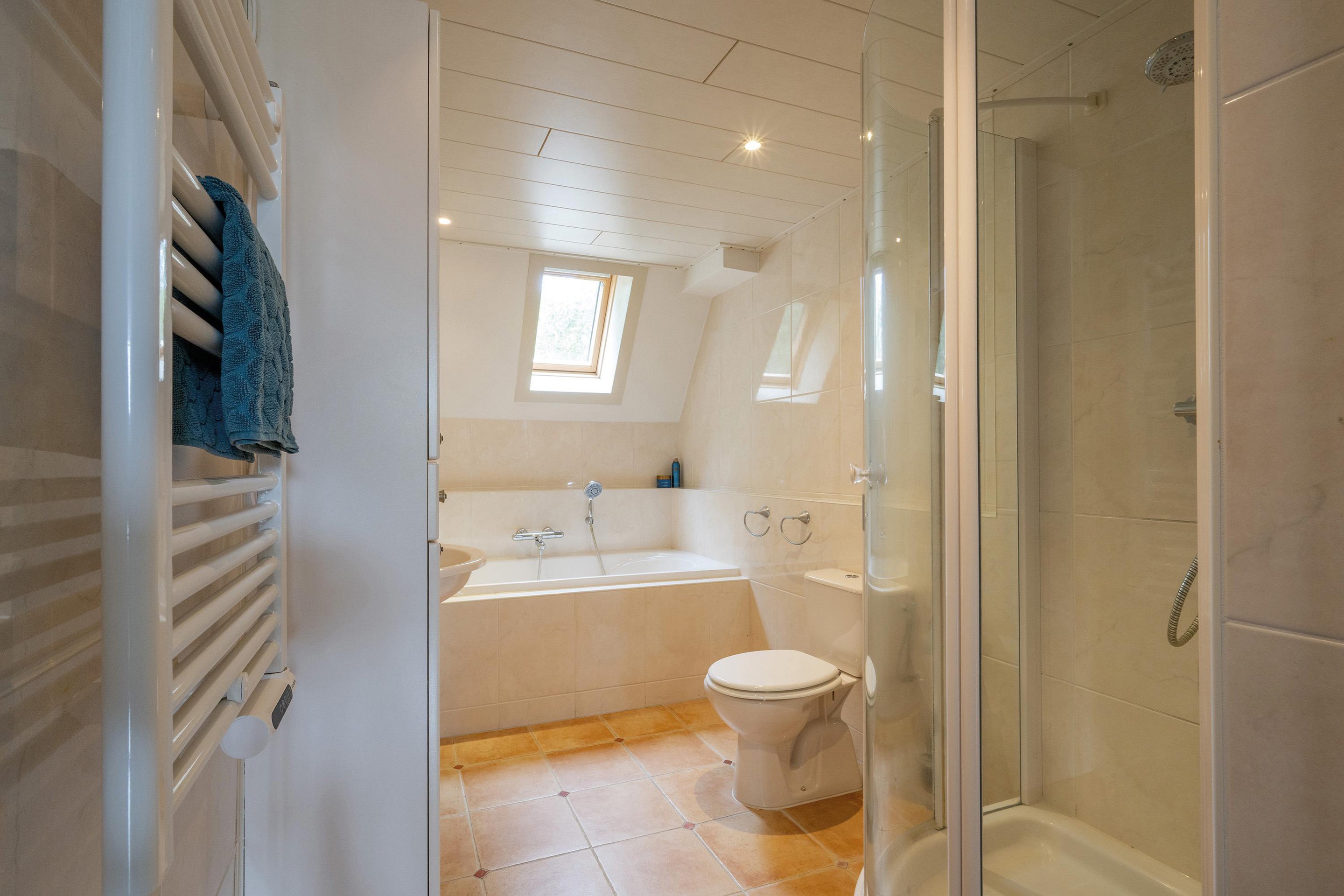 De badkamer is ruim met zo’n 7 m2 en beschikt over een douche, een wastafel, een ligbad en een toilet. Bovendien is er een dakraam dat zorgt voor daglicht. Helemaal compleet dus!