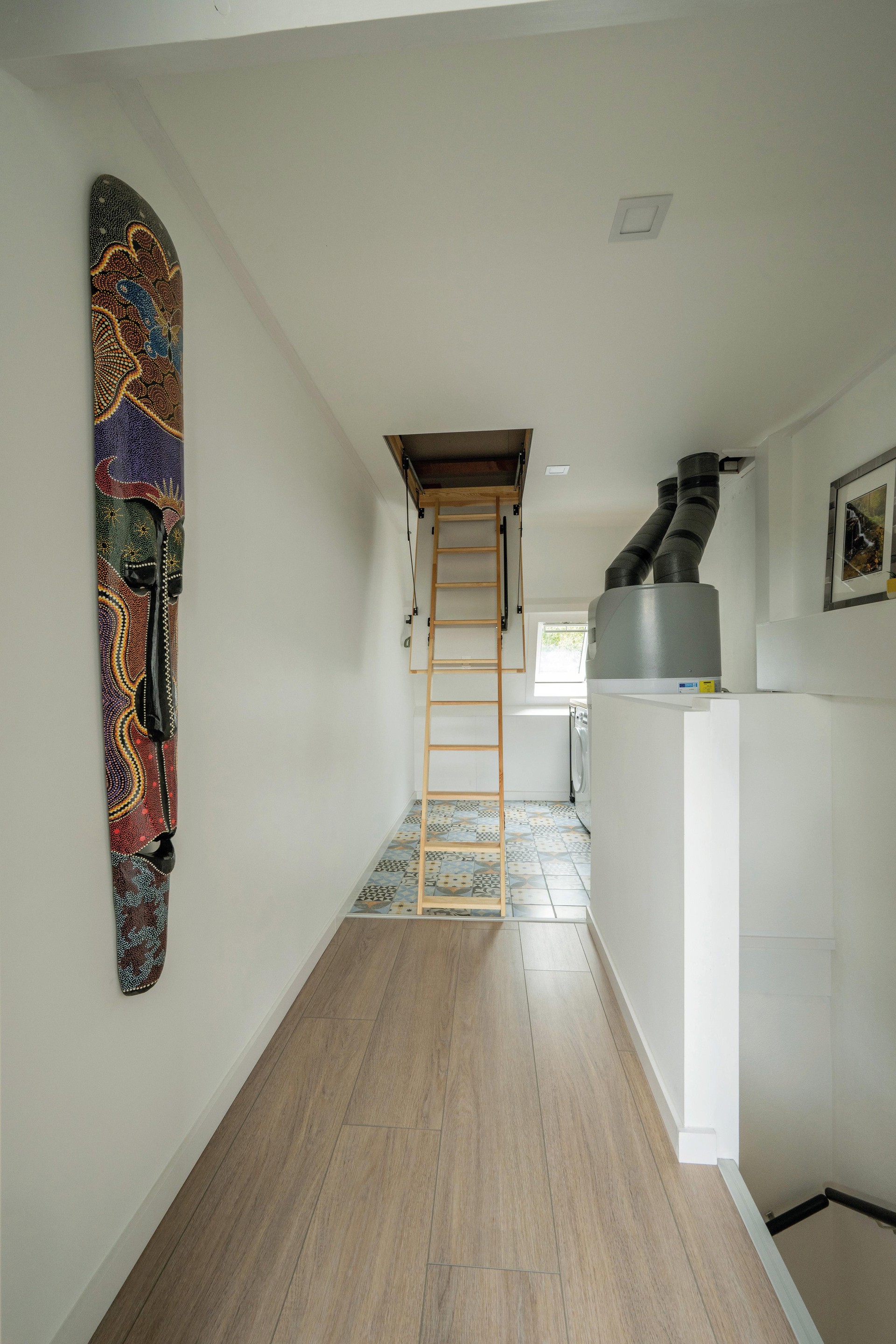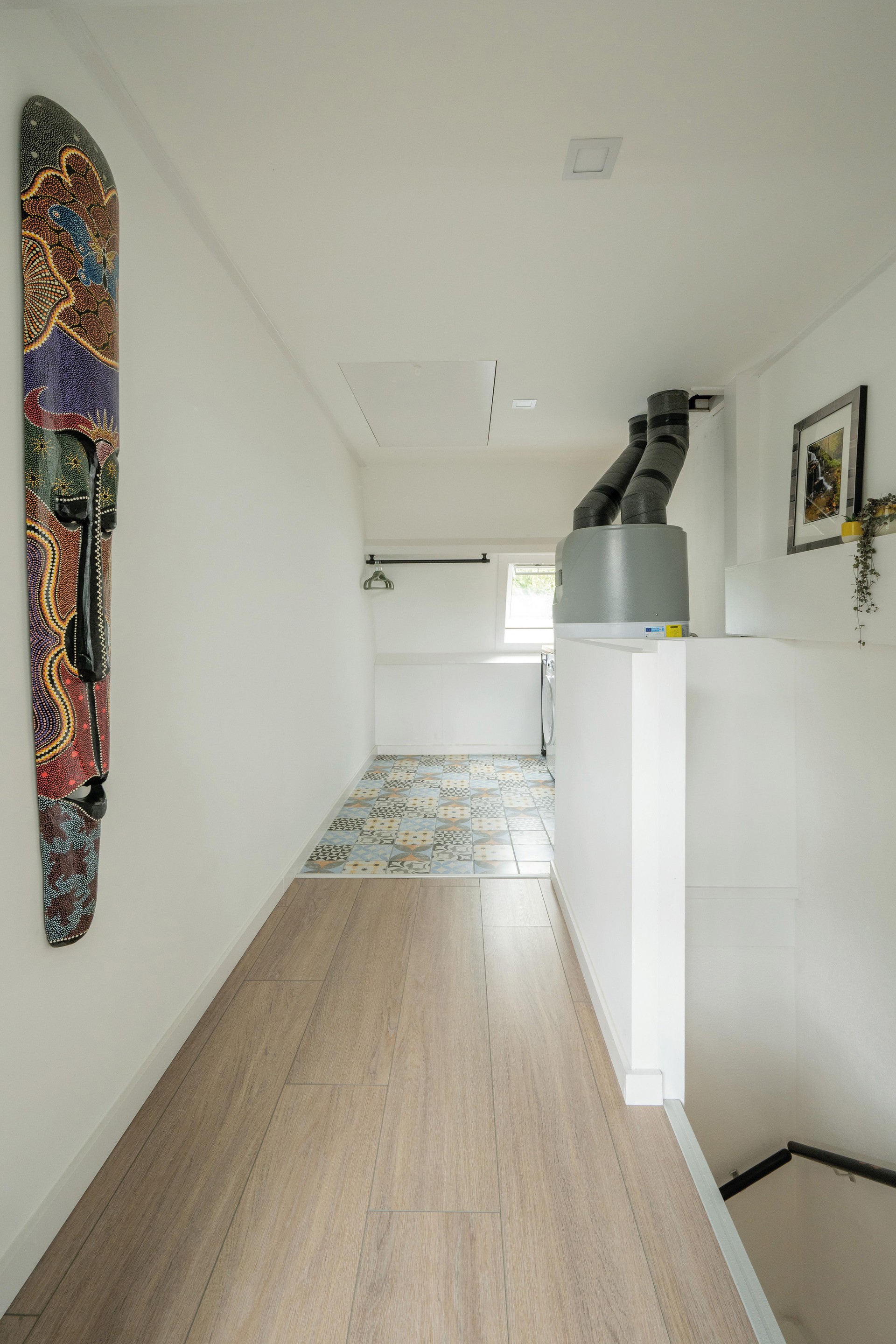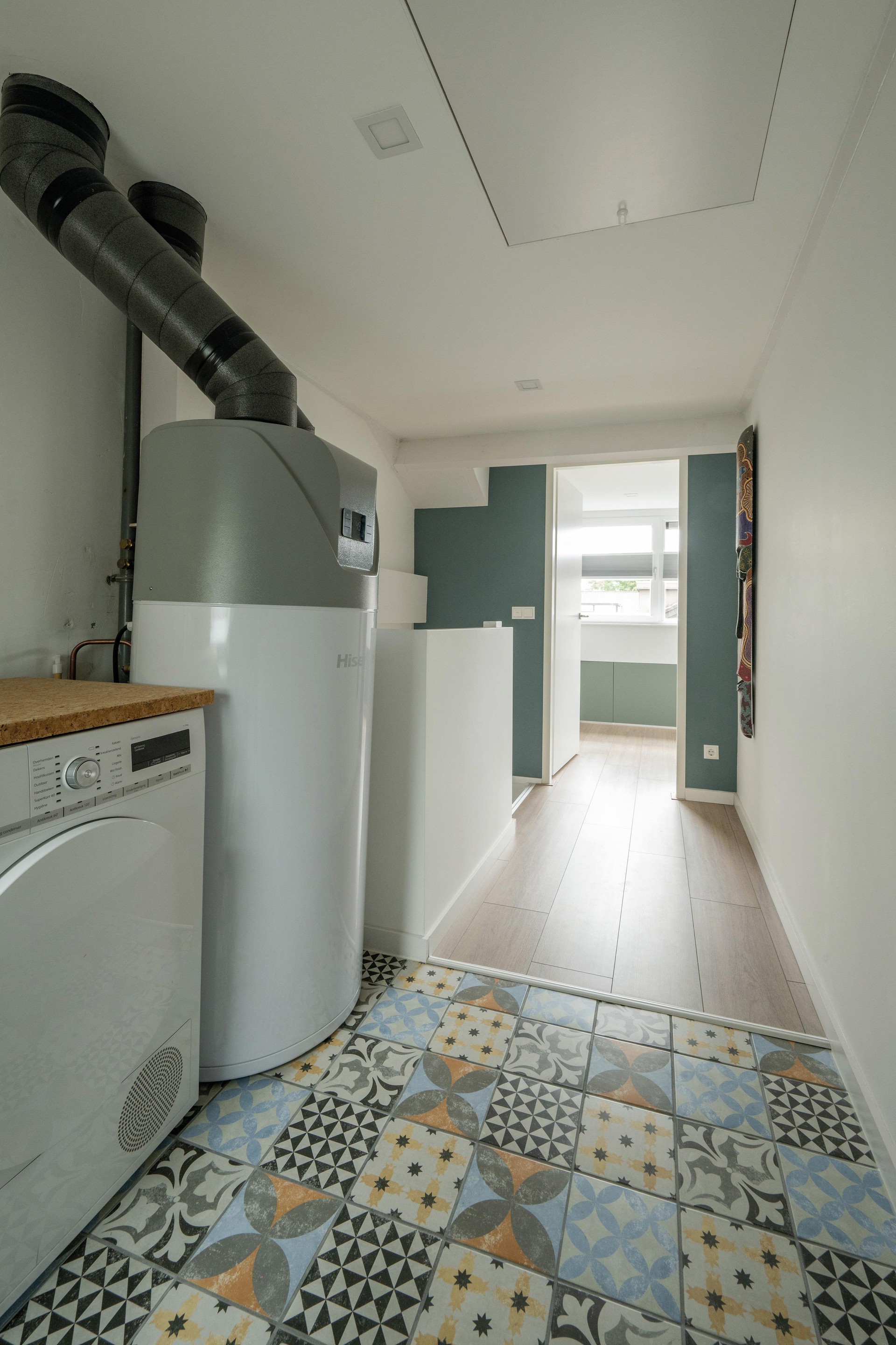 De zolderverdieping is bereikbaar via een vaste trap en bestaat uit een voorzolder met opstelling van de grote elektrische boiler (2023) en de witgoedaansluiting op een vintage-look tegelvloer.