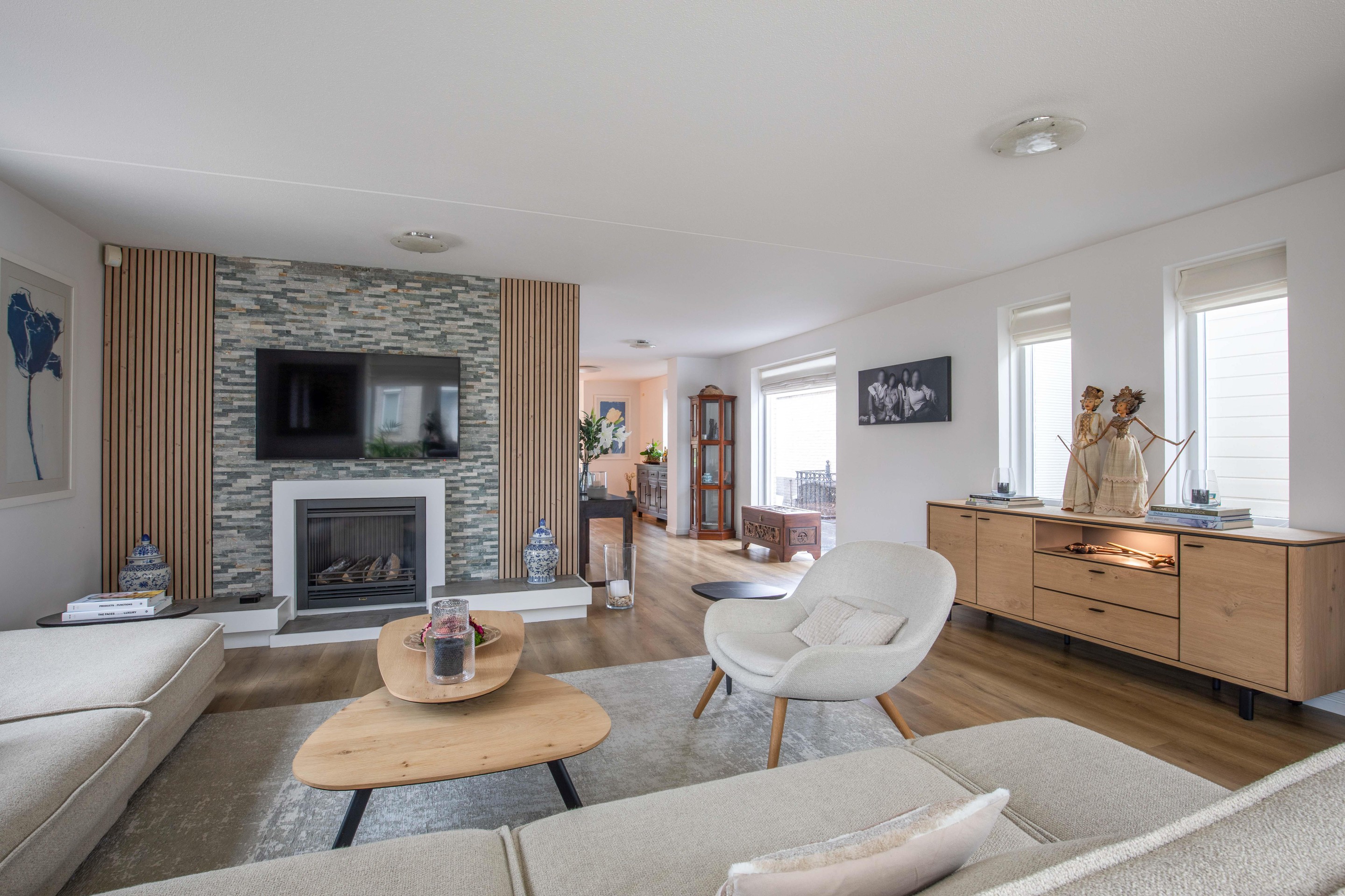 De zithoek is gesitueerd rondom een fraai ontworpen feature wall met geïntegreerde gashaard — een echte blikvanger die warmte en sfeer toevoegt. De combinatie van moderne afwerkingen, zachte kleuren en hoogwaardige materialen creëert een rustige en uitnodigende ambiance.