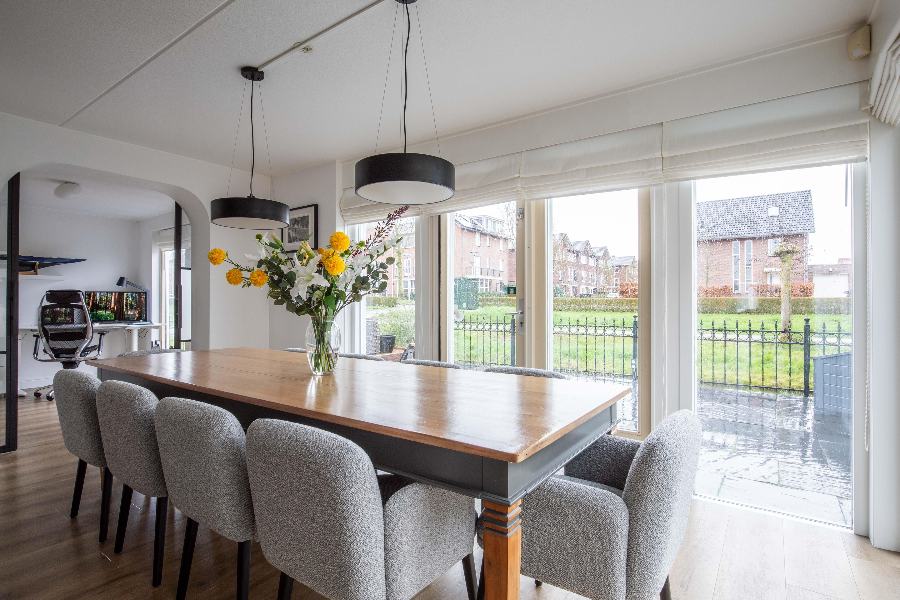 De royale eetruimte, gelegen in een charmante erker, biedt een prachtige verbinding met buiten en is ideaal voor zowel intieme diners als grotere gezelschappen.