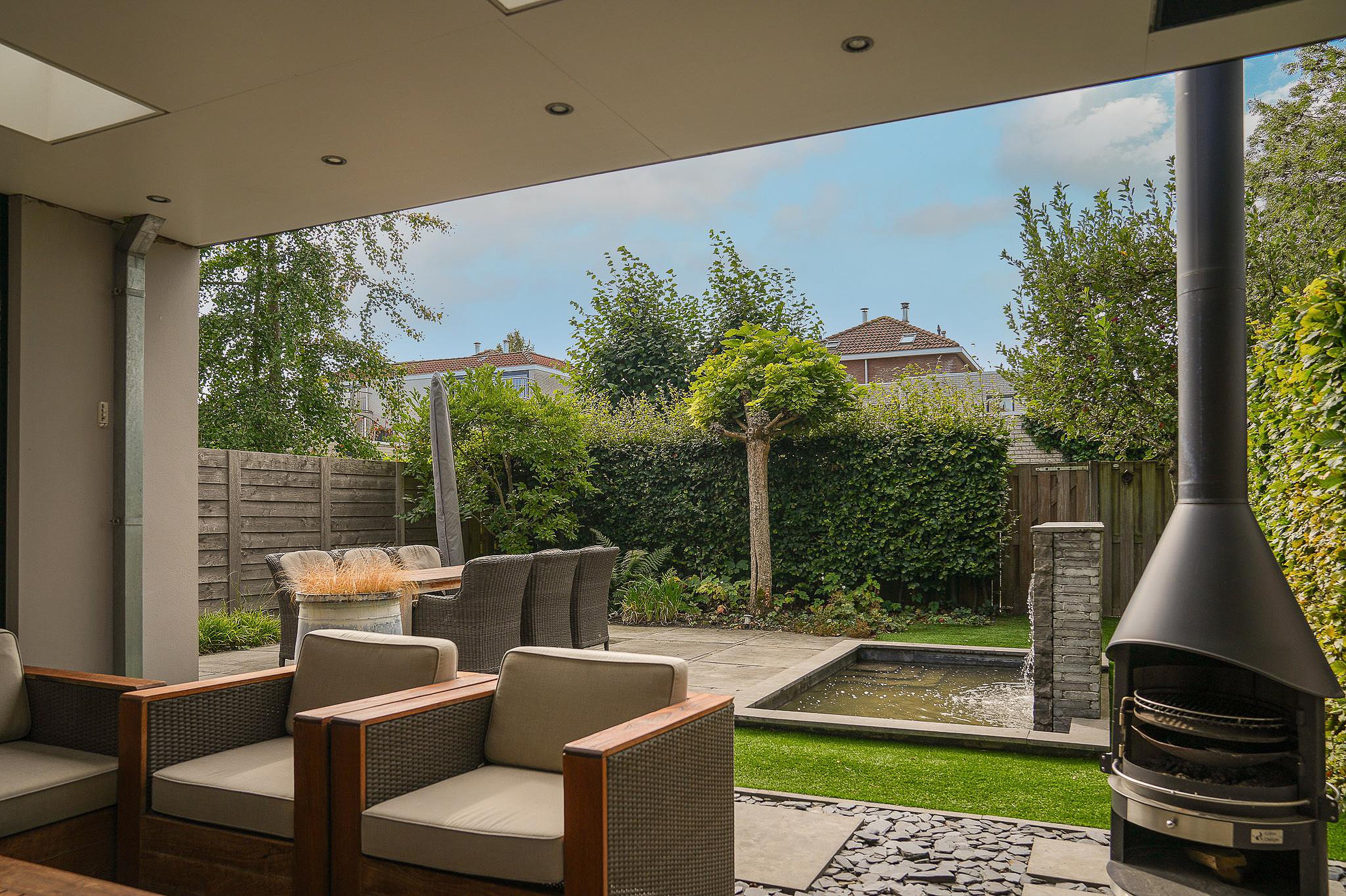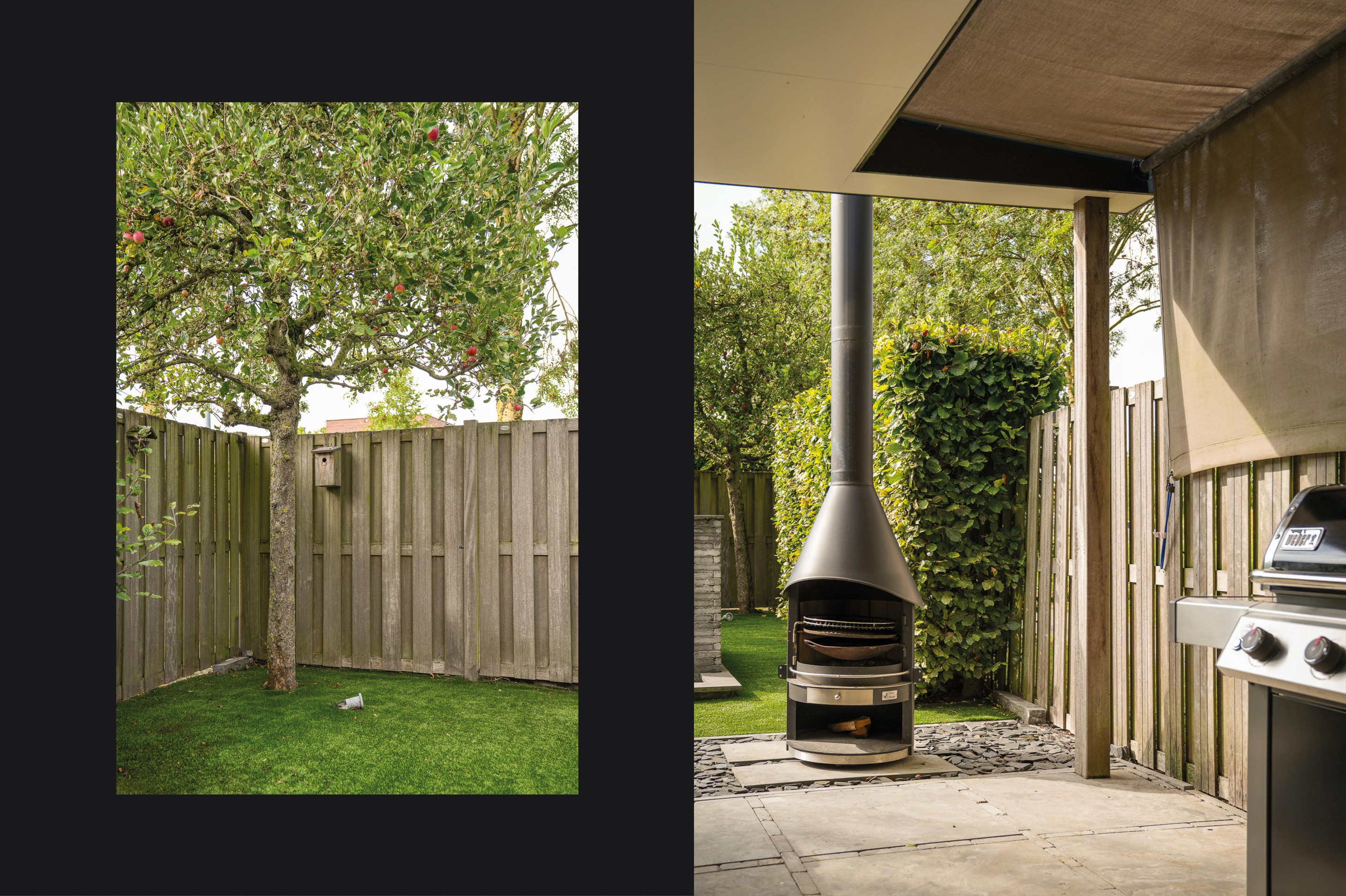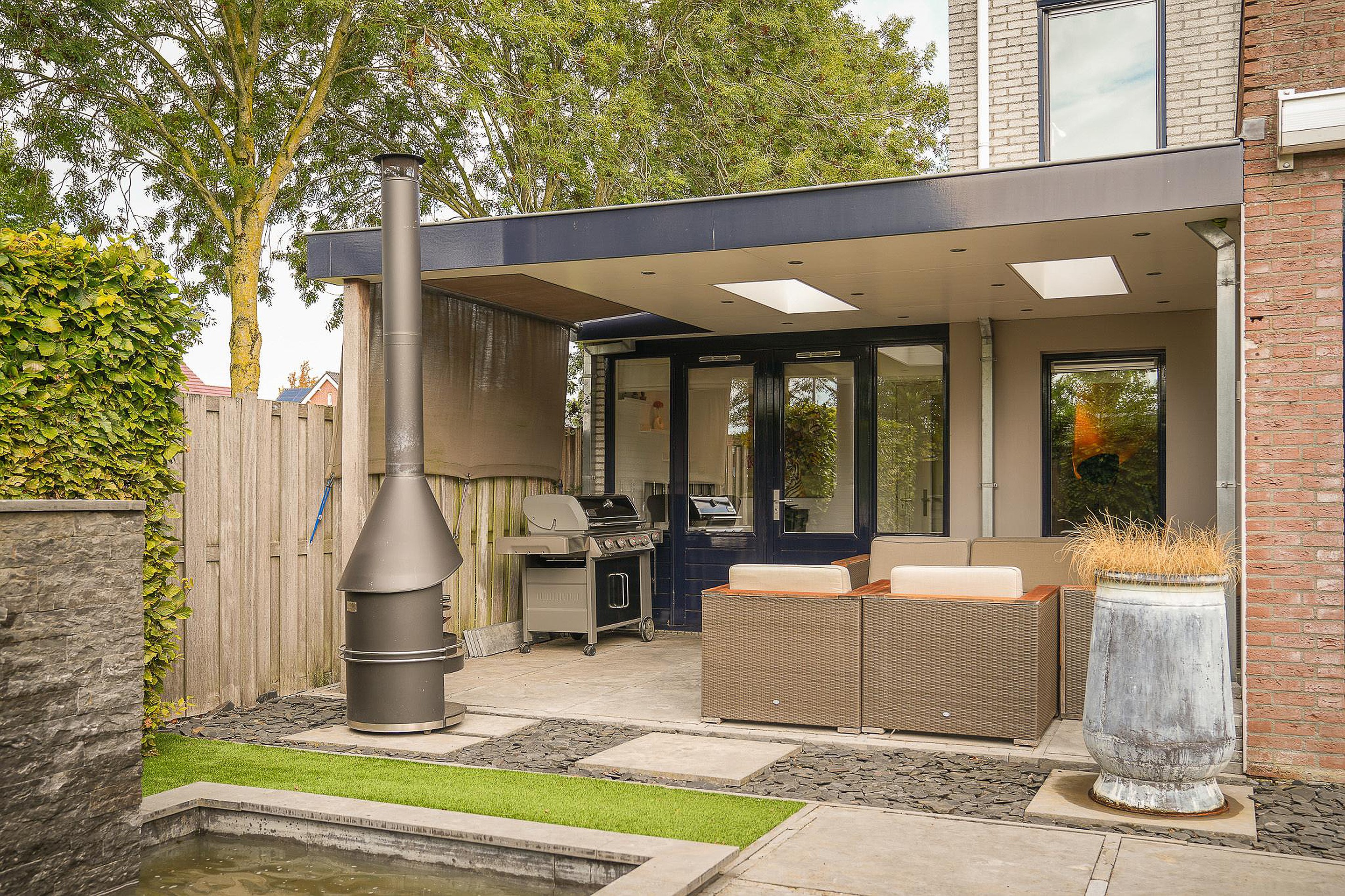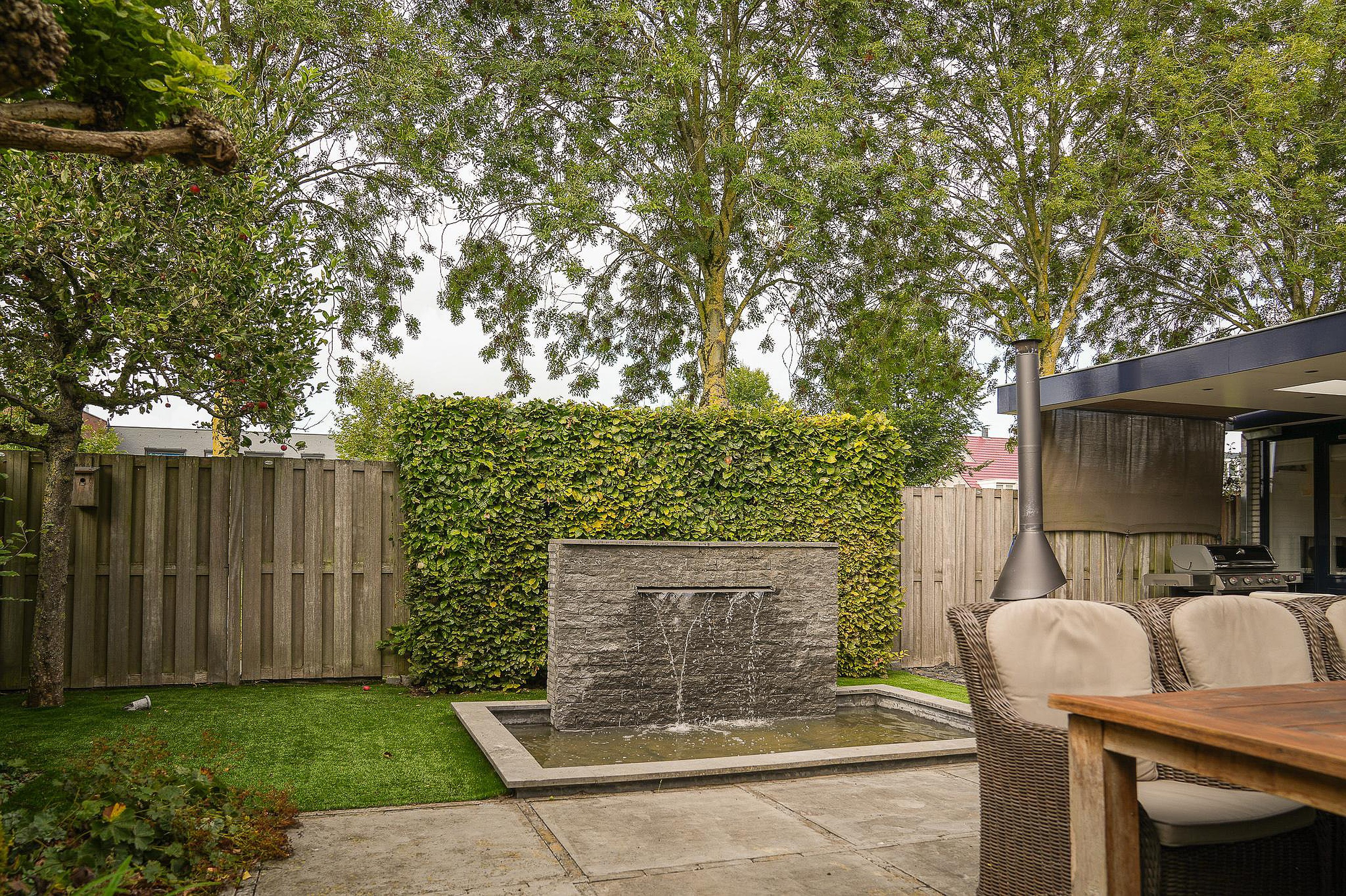 Via de schuifpui in de woonkamer en loopdeur vanuit de werkkamer bereik je de verzorgde achtertuin met zonnig terras, kunstgras, fontein, borders én een fijne overkapping. Hier geniet je tot in de late uurtjes van het buitenleven.