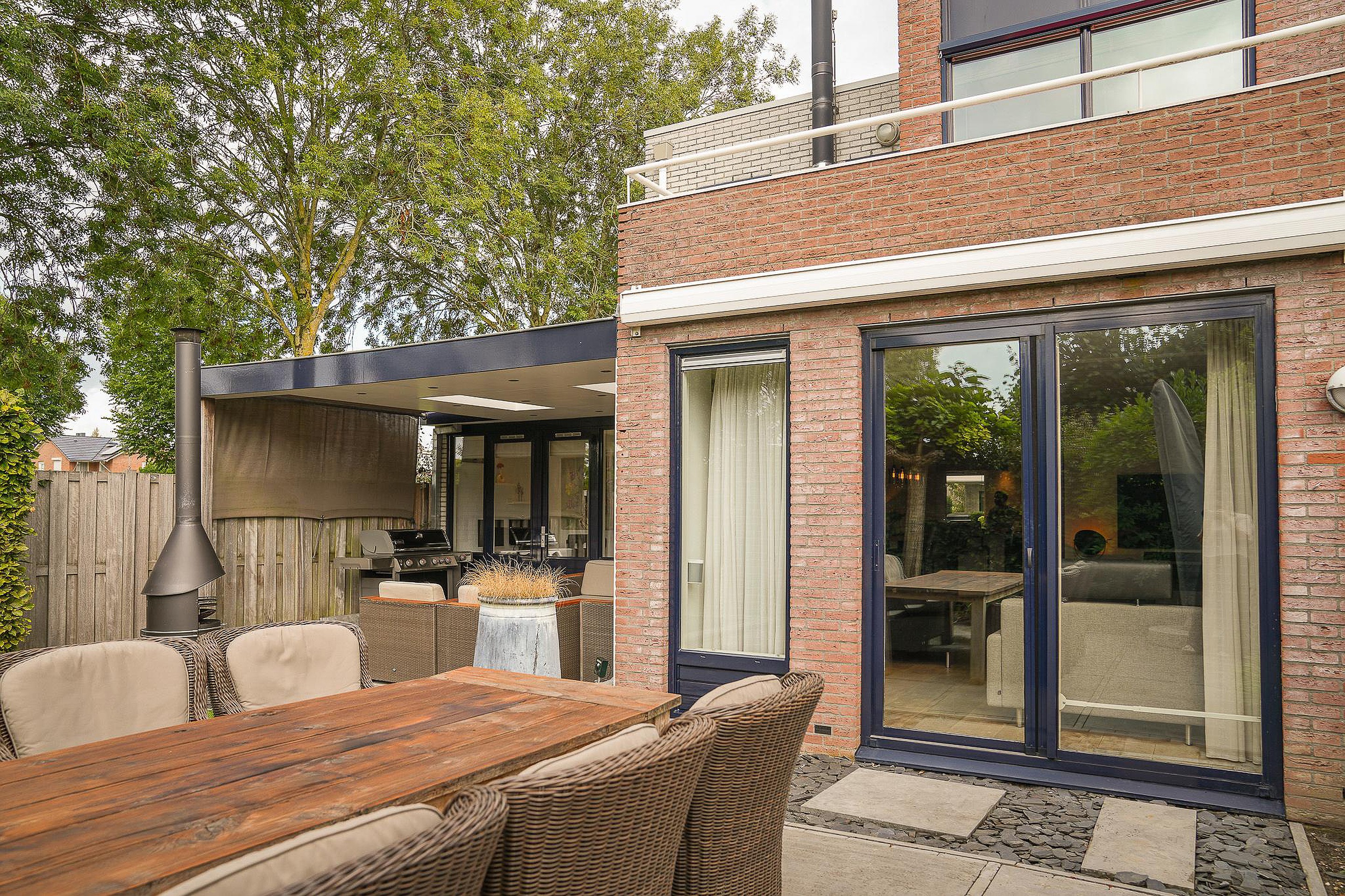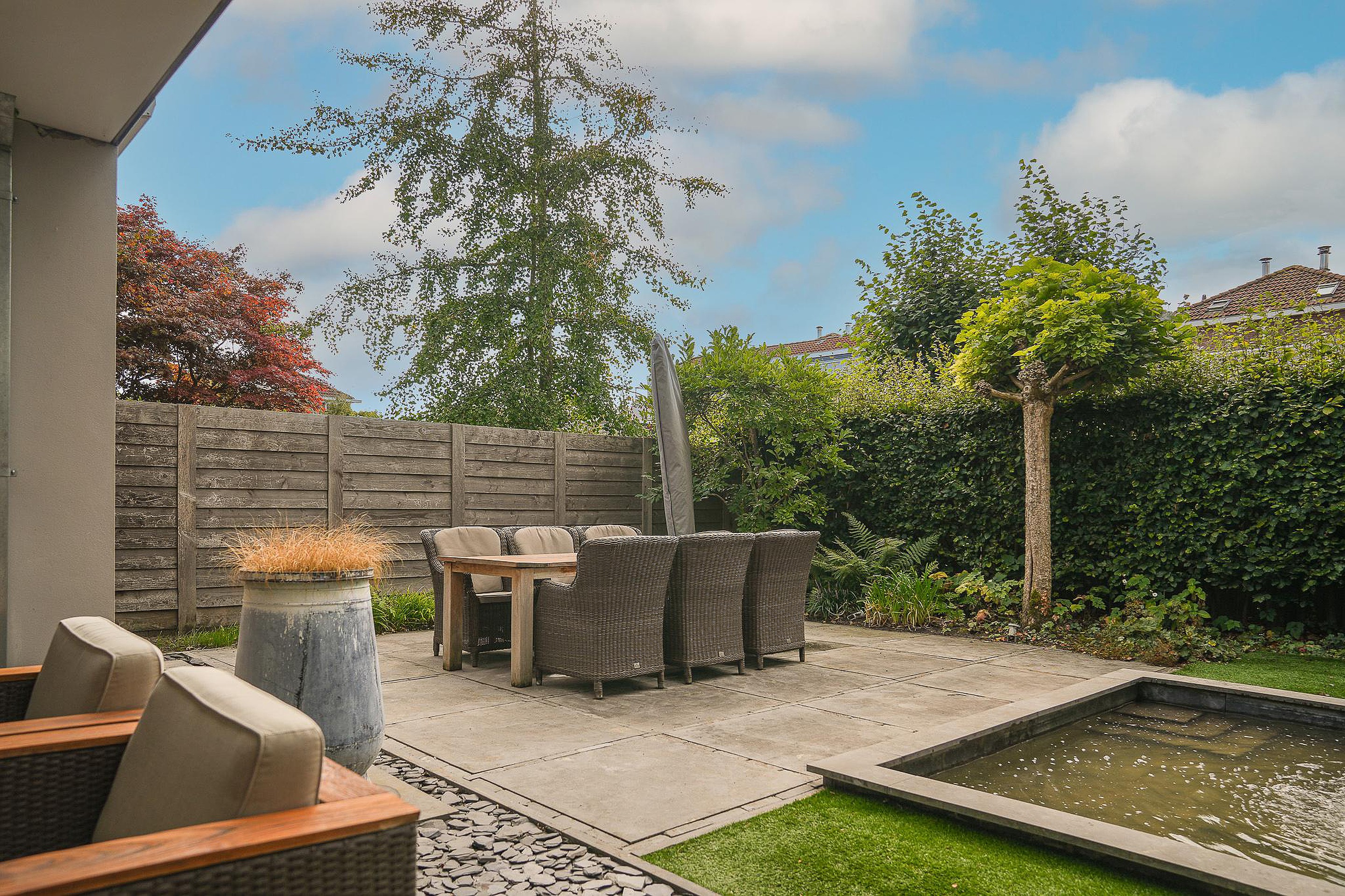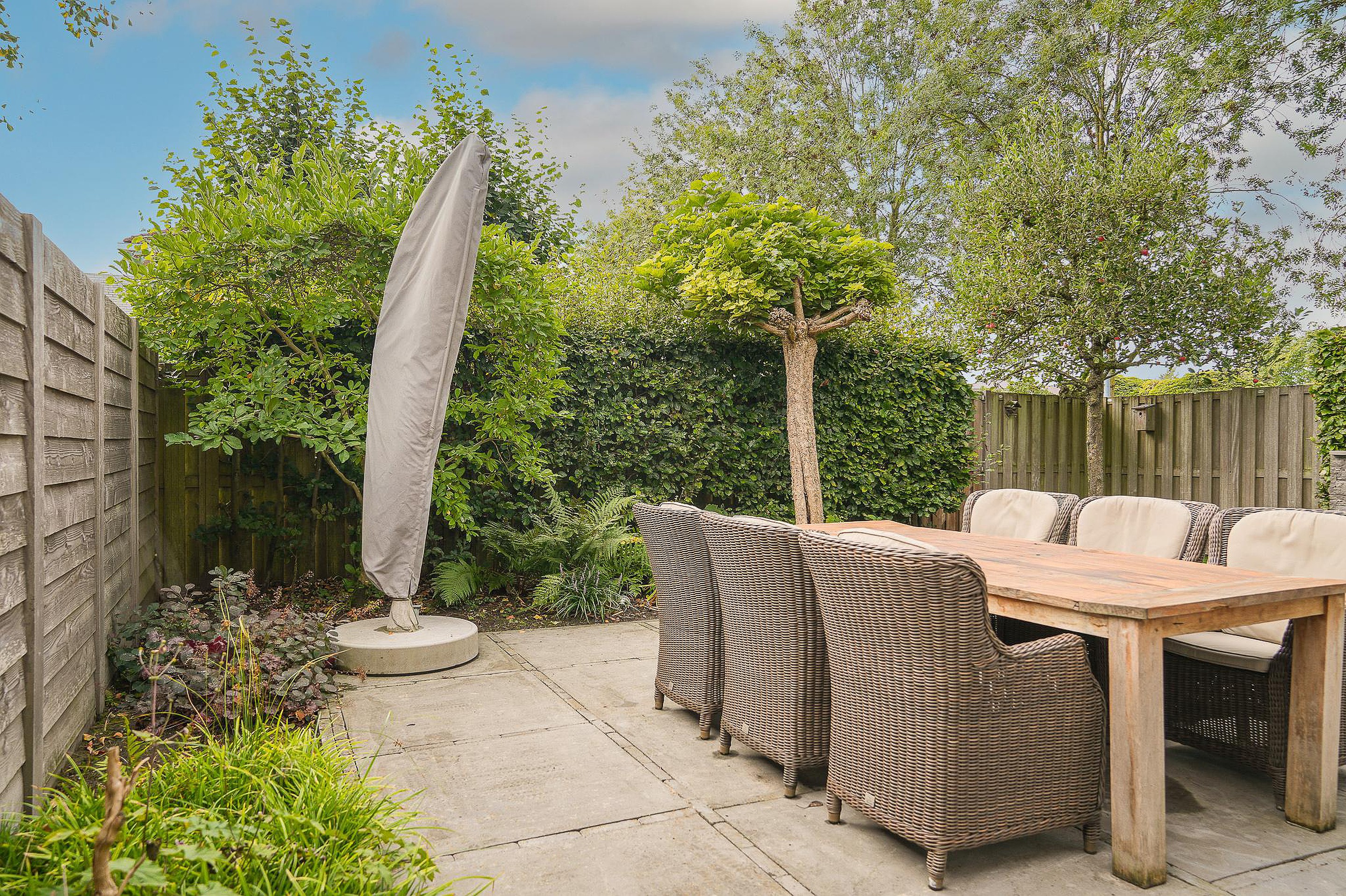 Via de schuifpui in de woonkamer en loopdeur vanuit de werkkamer bereik je de verzorgde achtertuin met zonnig terras, kunstgras, fontein, borders én een fijne overkapping. Hier geniet je tot in de late uurtjes van het buitenleven.