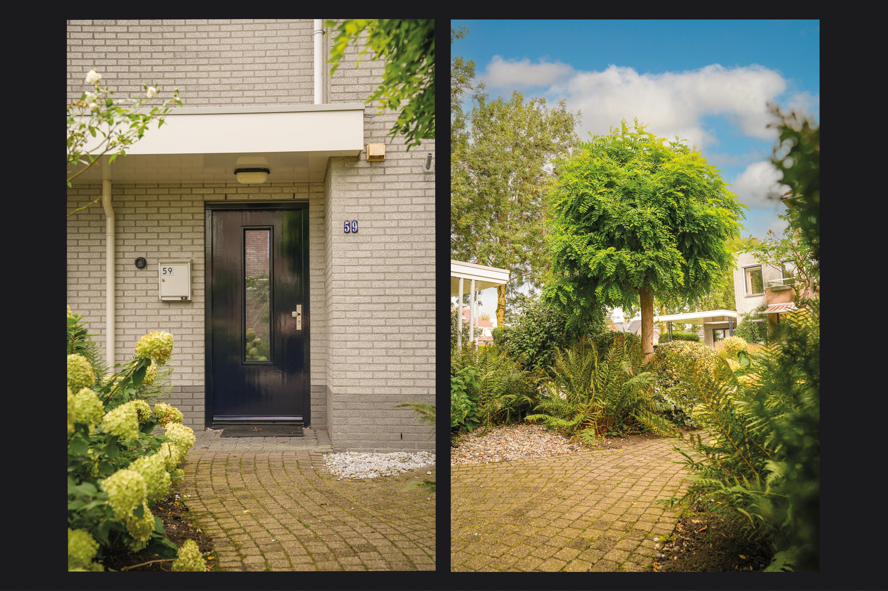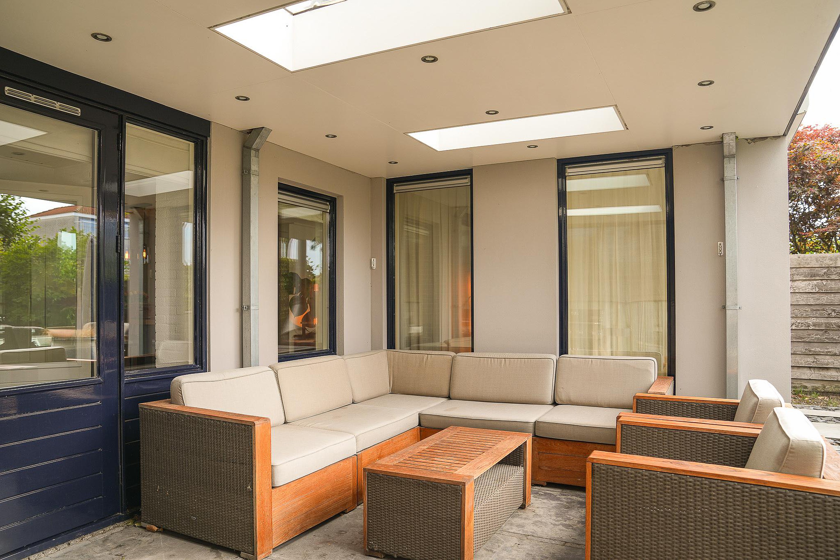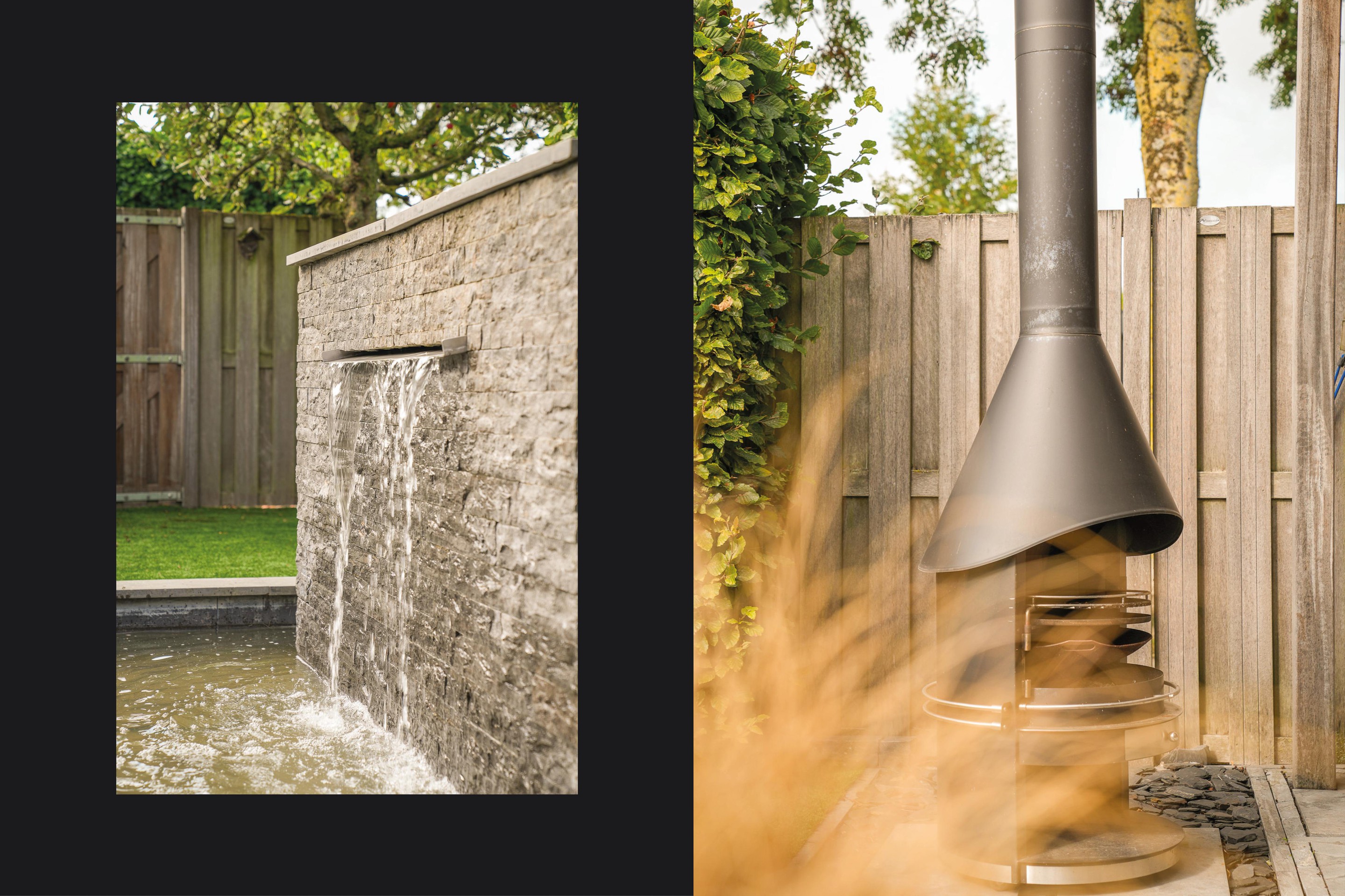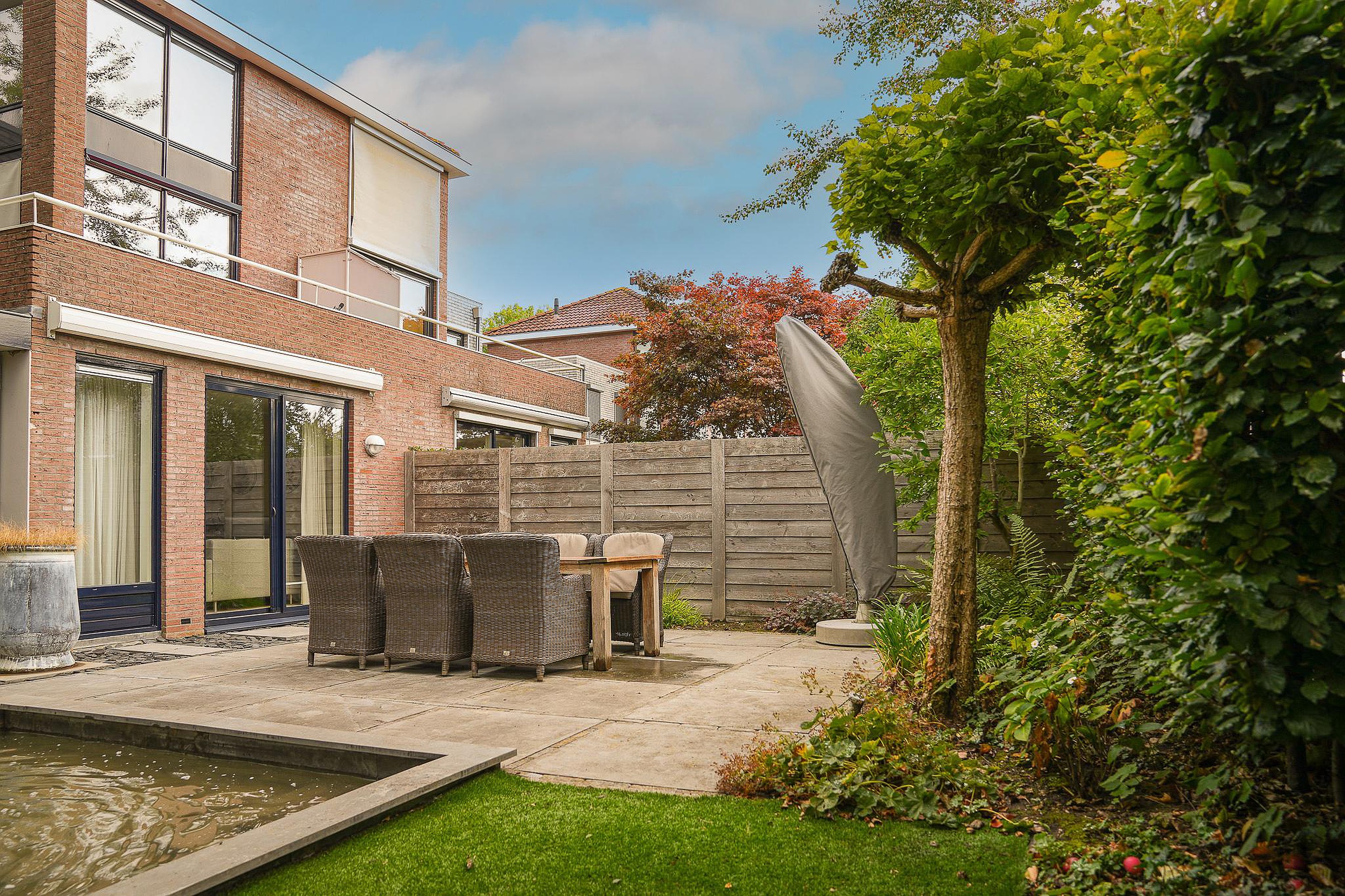 Via de schuifpui in de woonkamer en loopdeur vanuit de werkkamer bereik je de verzorgde achtertuin met zonnig terras, kunstgras, fontein, borders én een fijne overkapping. Hier geniet je tot in de late uurtjes van het buitenleven.