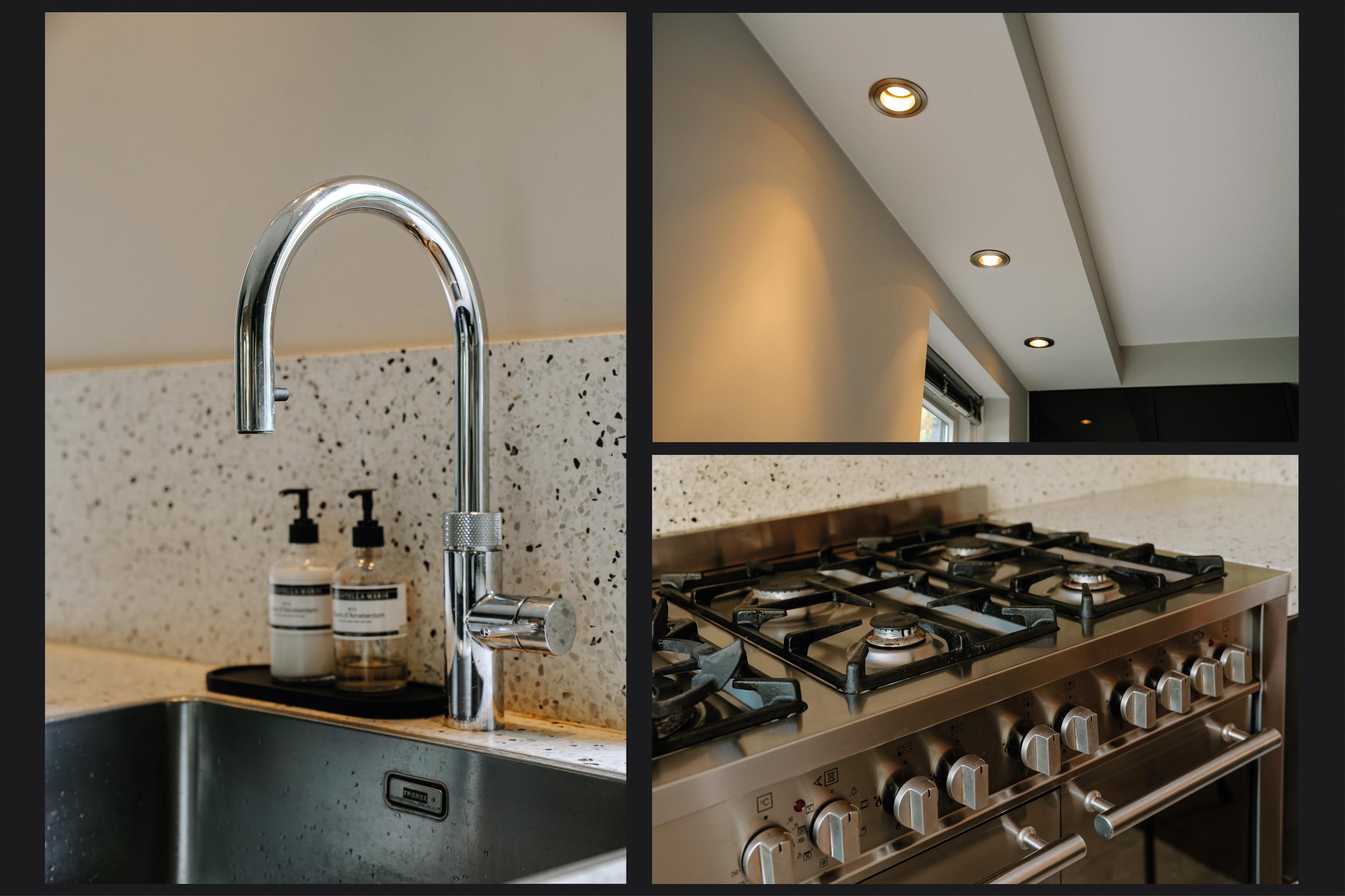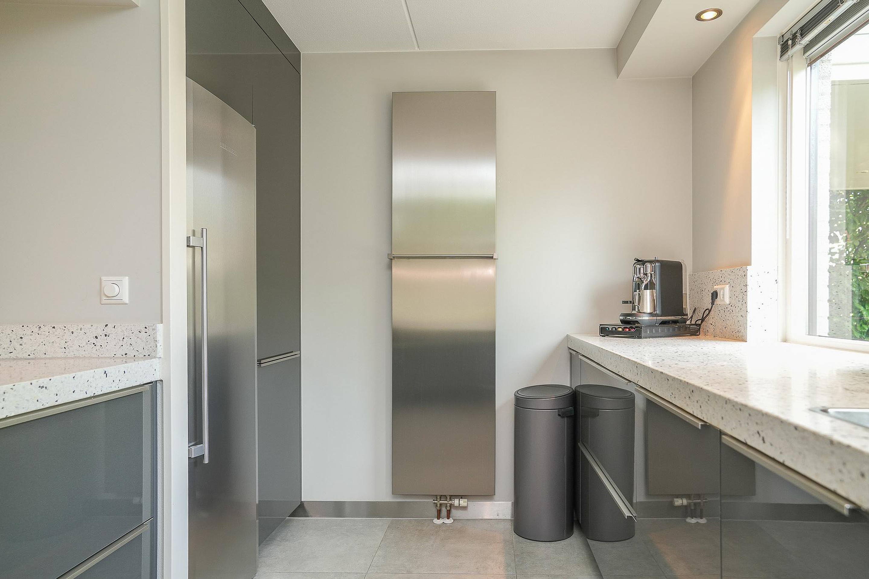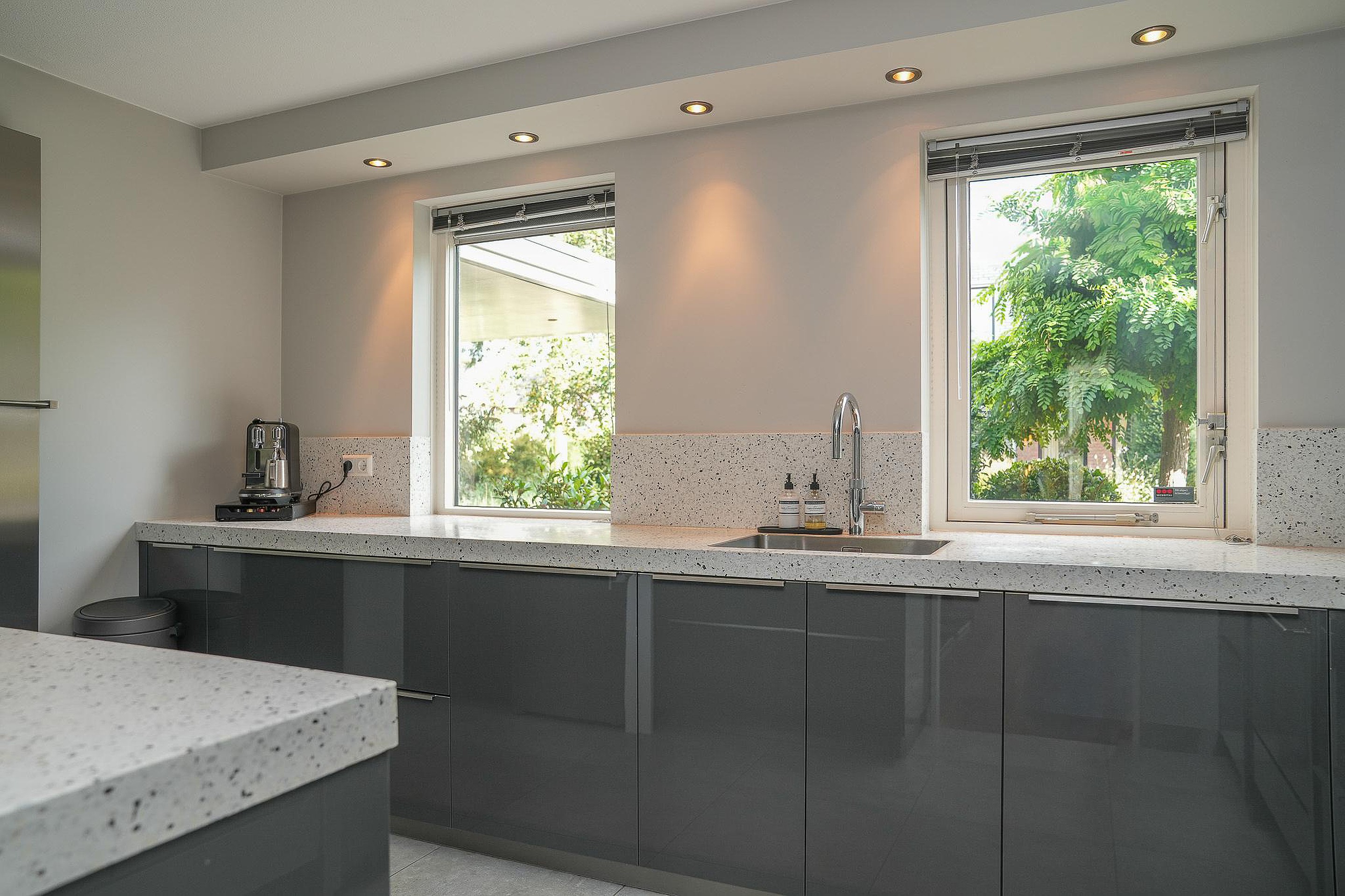 De moderne keuken in hoekopstelling is voorzien van een stijlvol granito werkblad en beschikt over hoogwaardige inbouwapparatuur zoals een Quooker, vaatwasser, koelkast en een groot 6-pits gasfornuis met dubbele oven – perfect voor de kookliefhebber.