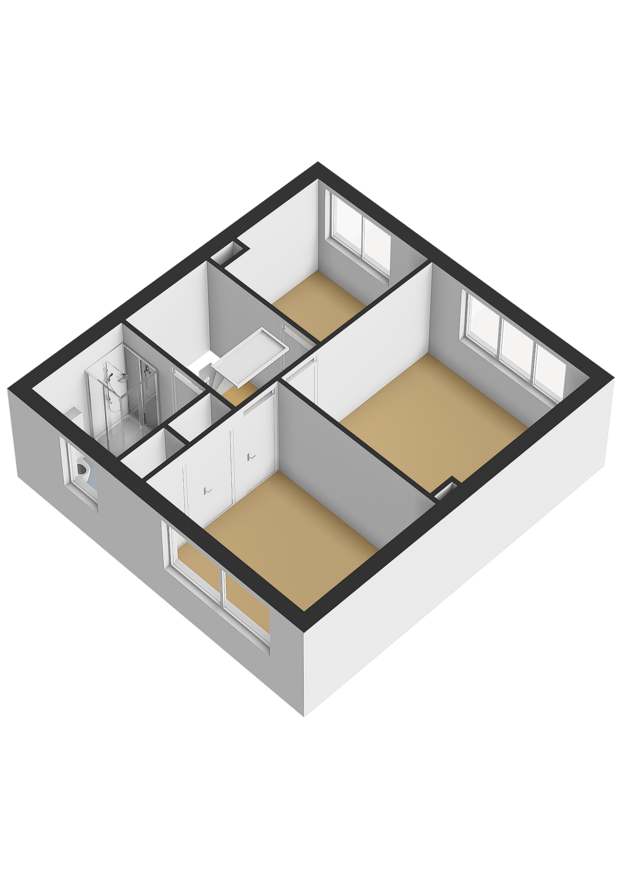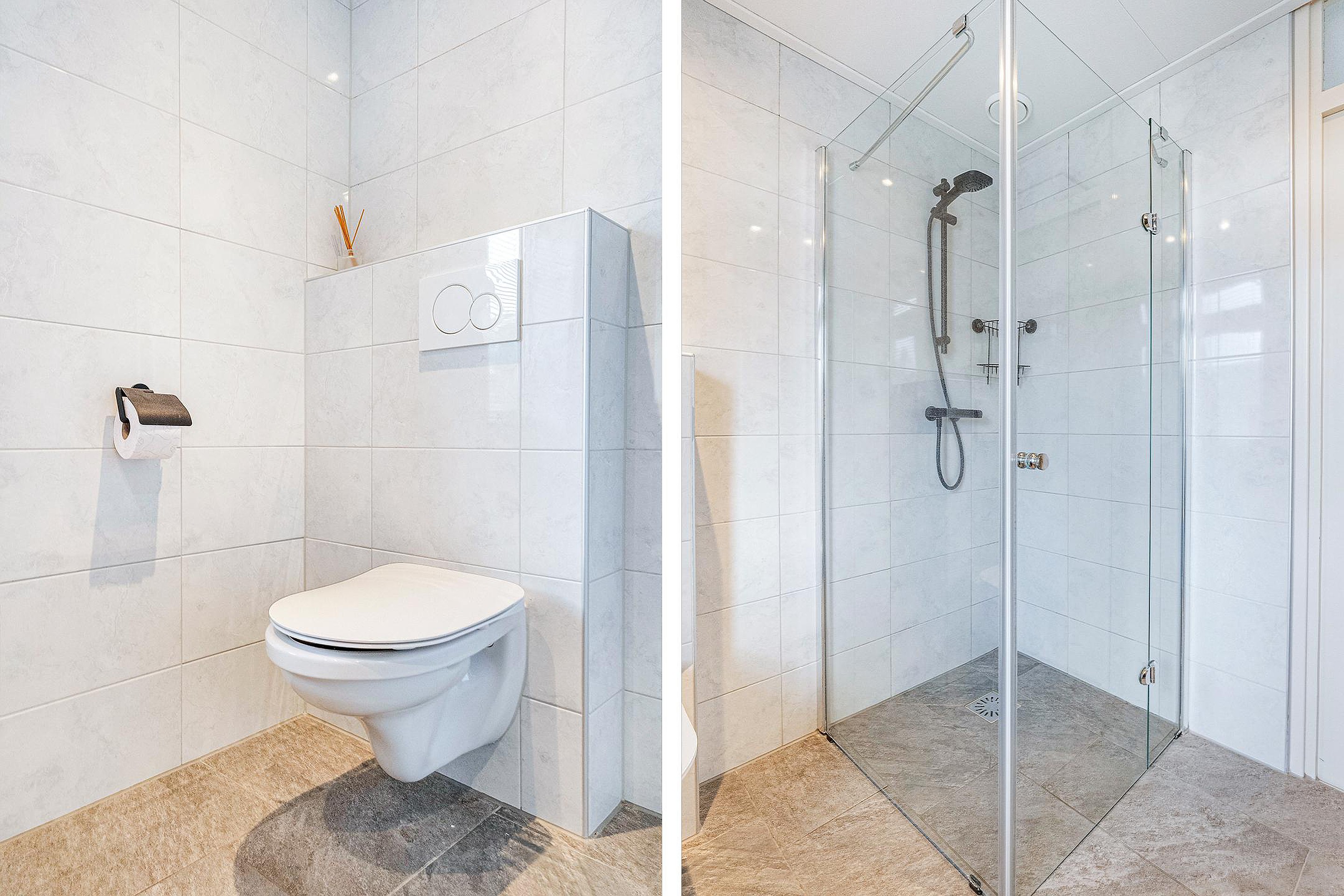 Overloop, drie slaapkamers en badkamer (2012) uitgevoerd met toilet, douche, wastafelmeubel, wandmeubel en designradiator.