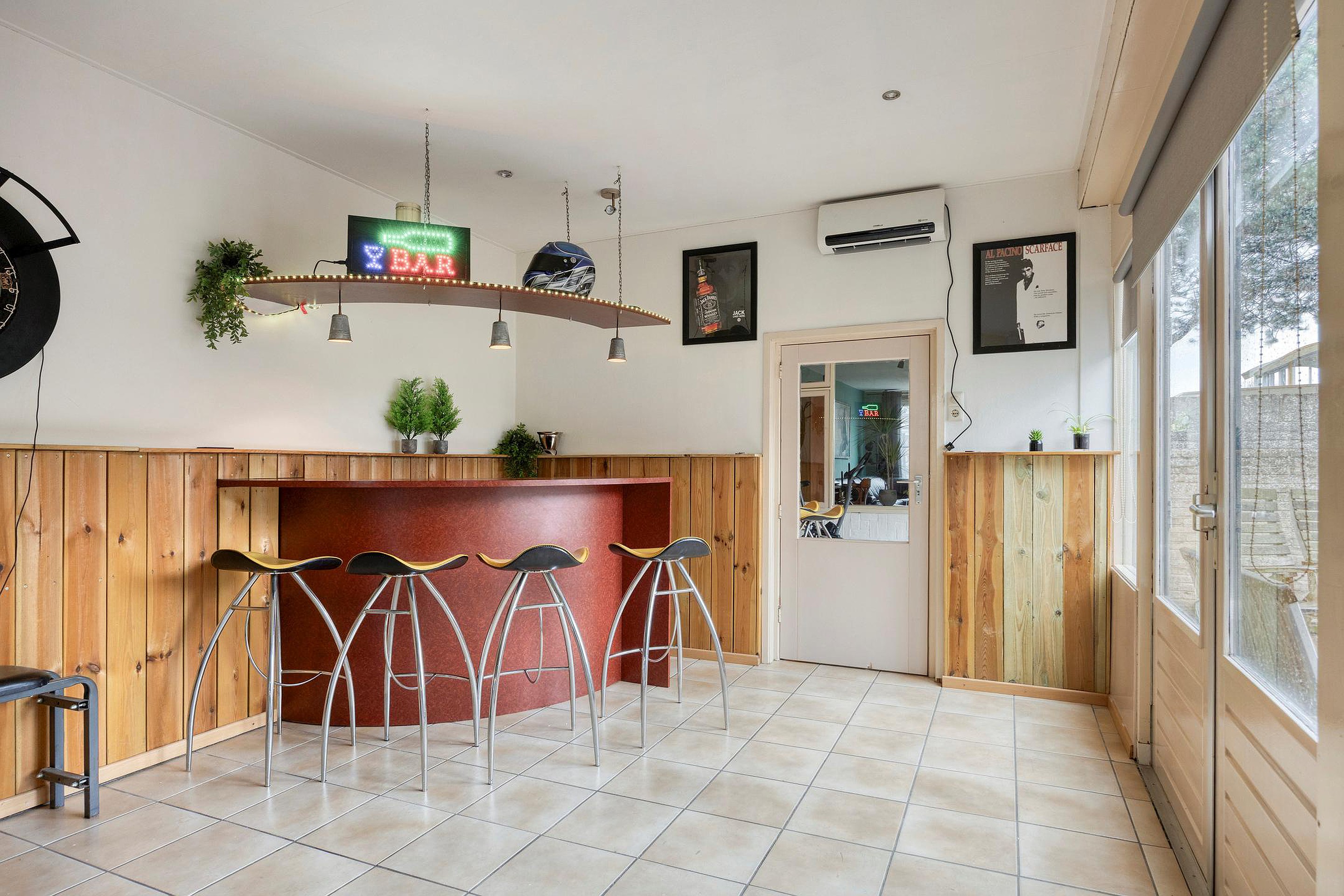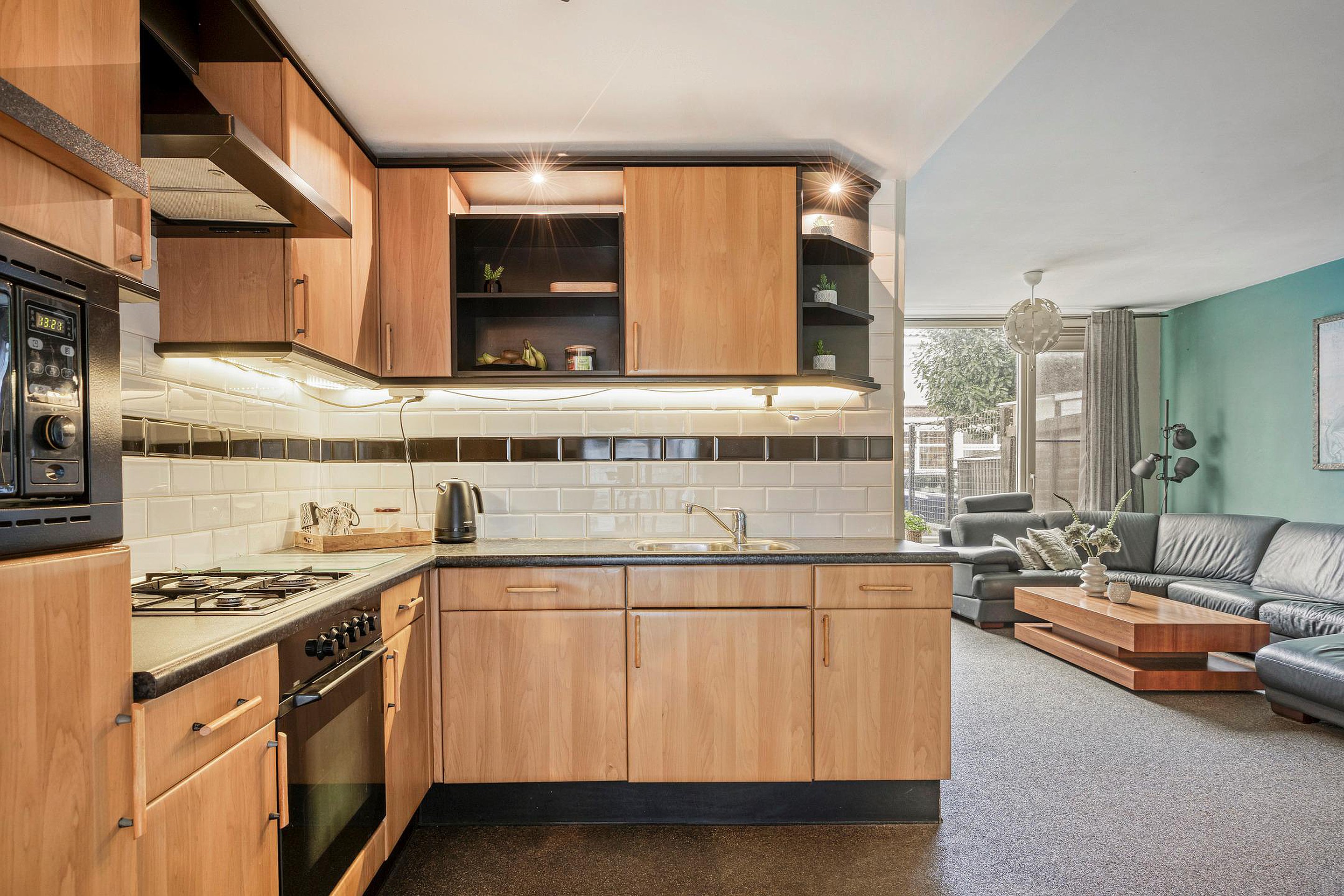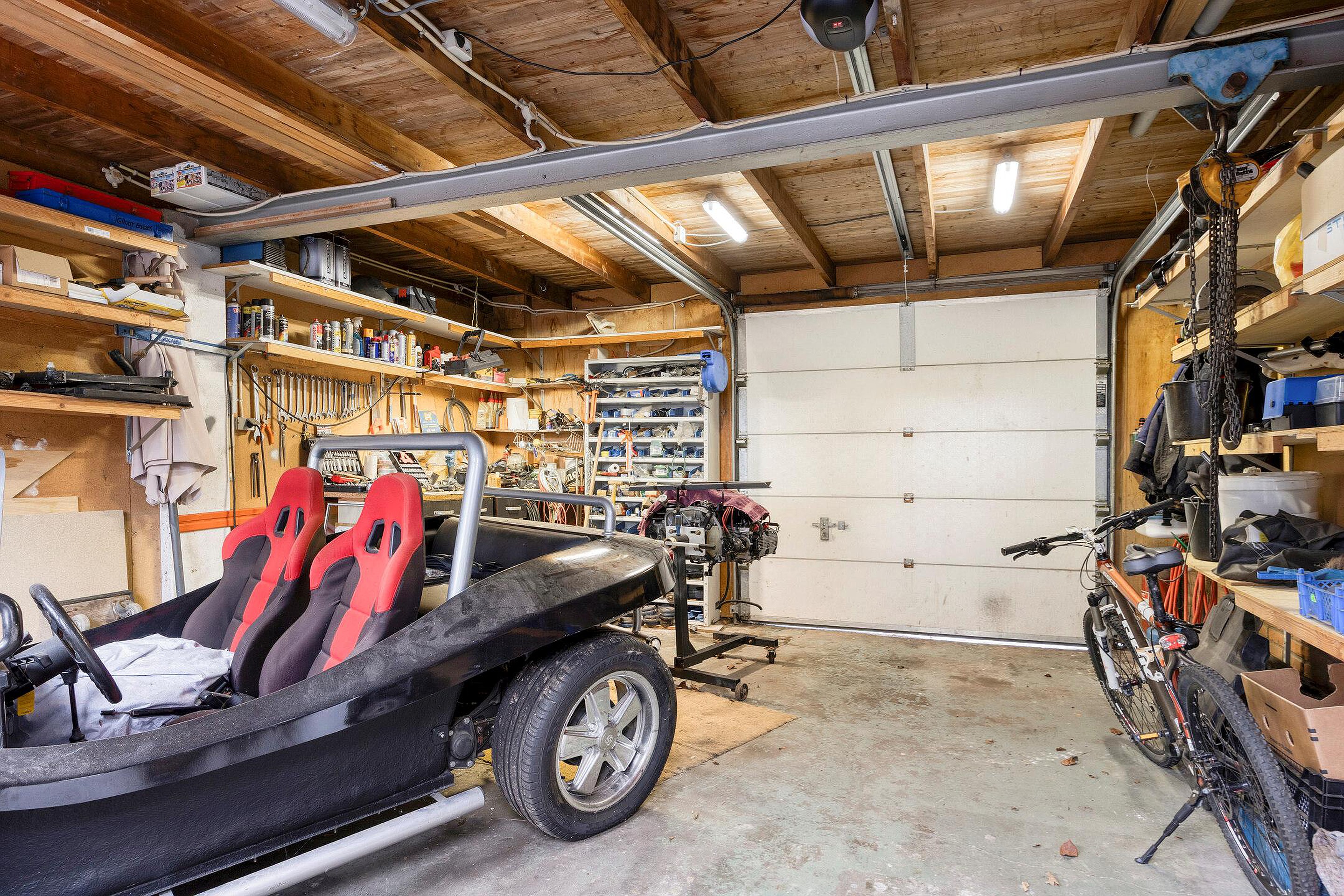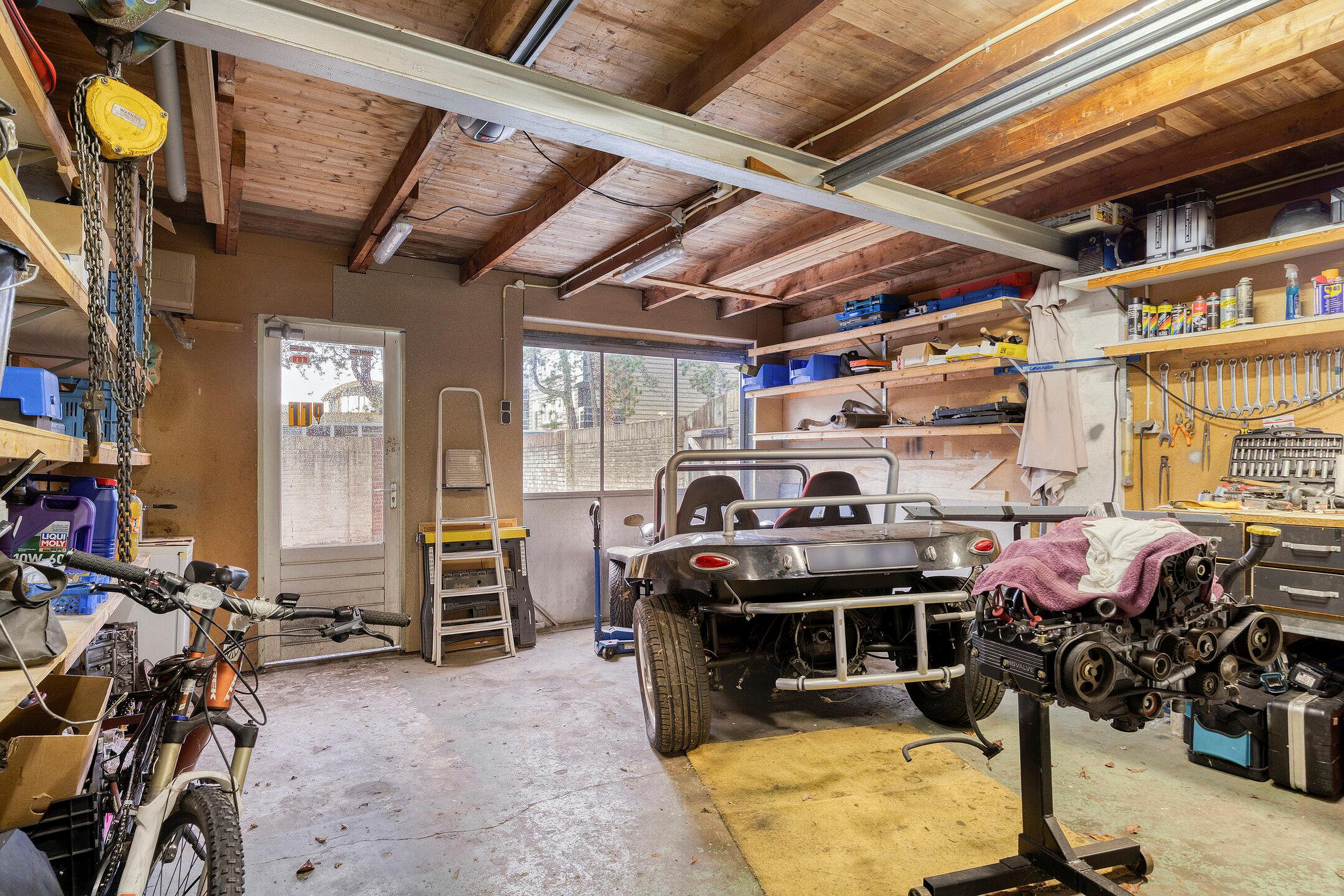 De keuken is voorzien van diverse inbouwapparatuur (4-pits gaskookplaat, afzuigkap, koelkast, oven en vaatwasser). Via de keuken is er toegang naar de aanbouw. Deze ruimte is volledig geïsoleerd en voor meerdere doeleinden te gebruiken. Openslaande deuren geven toegang tot de zonnige achtertuin op het zuidwesten. De garage is voorzien van een elektrische roldeur en biedt veel bergruimte. Via een loopdeur en schuifdeuren is er toegang tot de tuin.