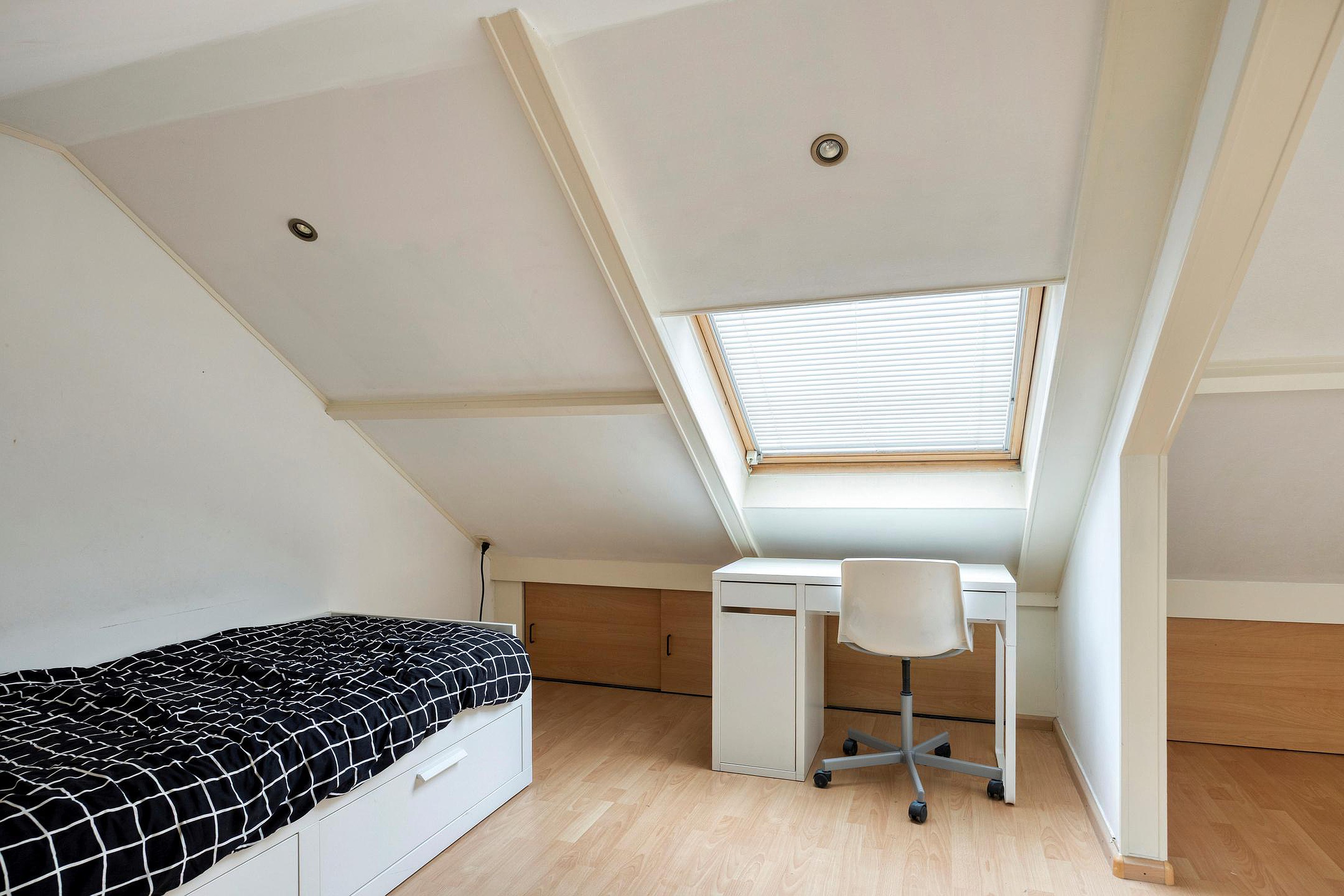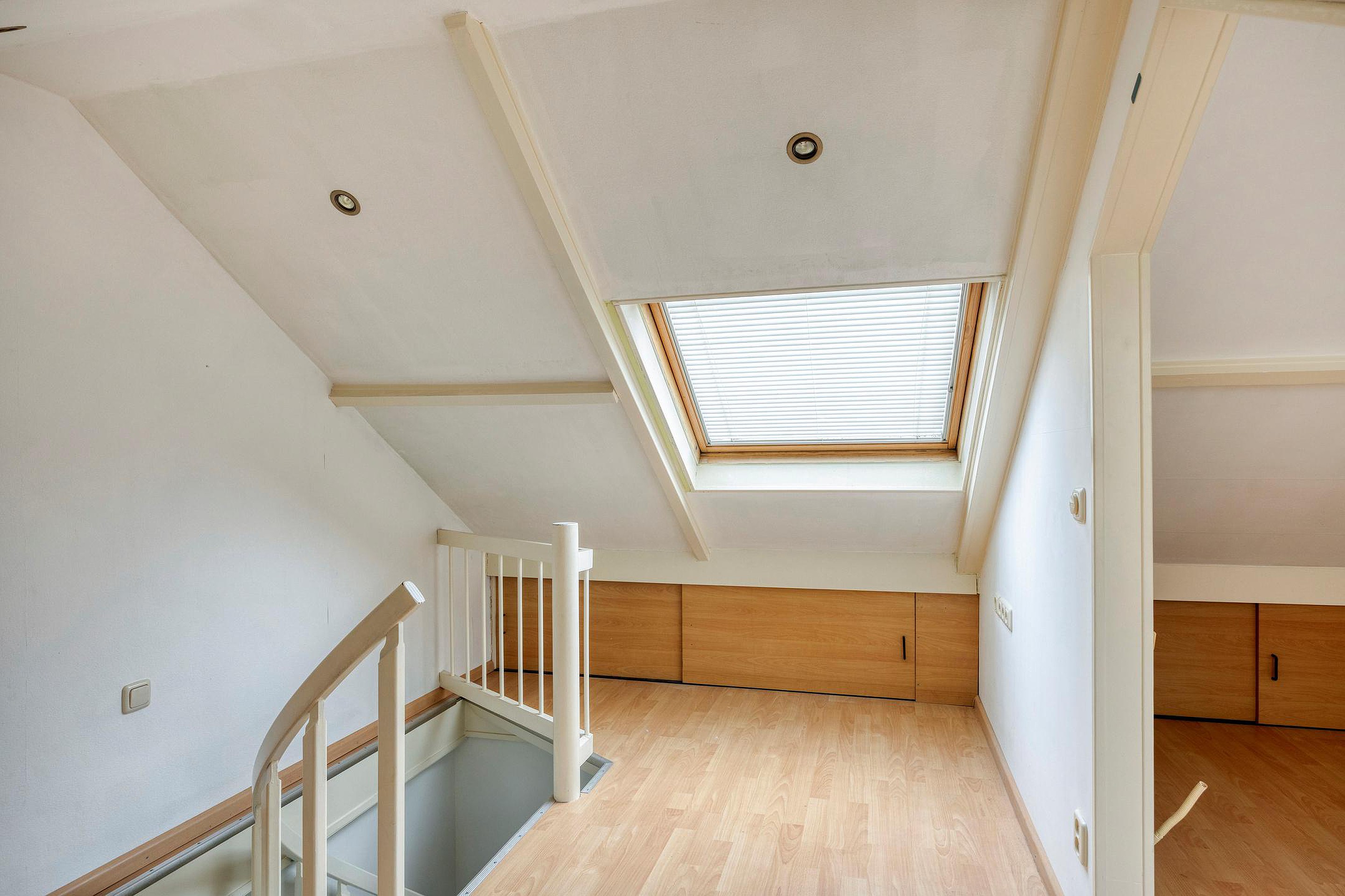 Tweede verdieping Overloop met Velux dakraam, doorgang naar slaapkamer met Velux dakraam. Deze etage is voorzien van een licht houten laminaatvloer. Er is voldoende bergruimte achter de knieschotten.