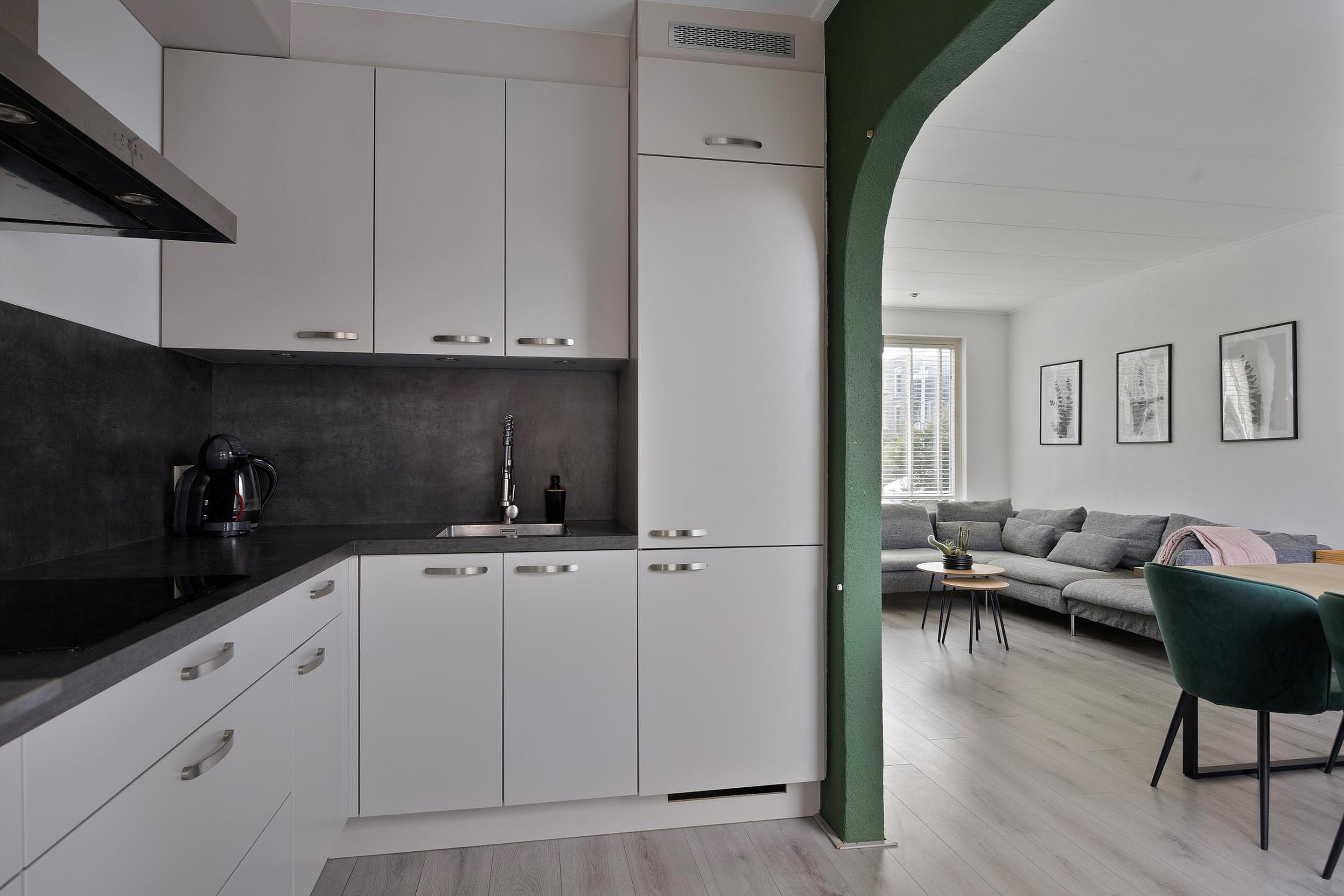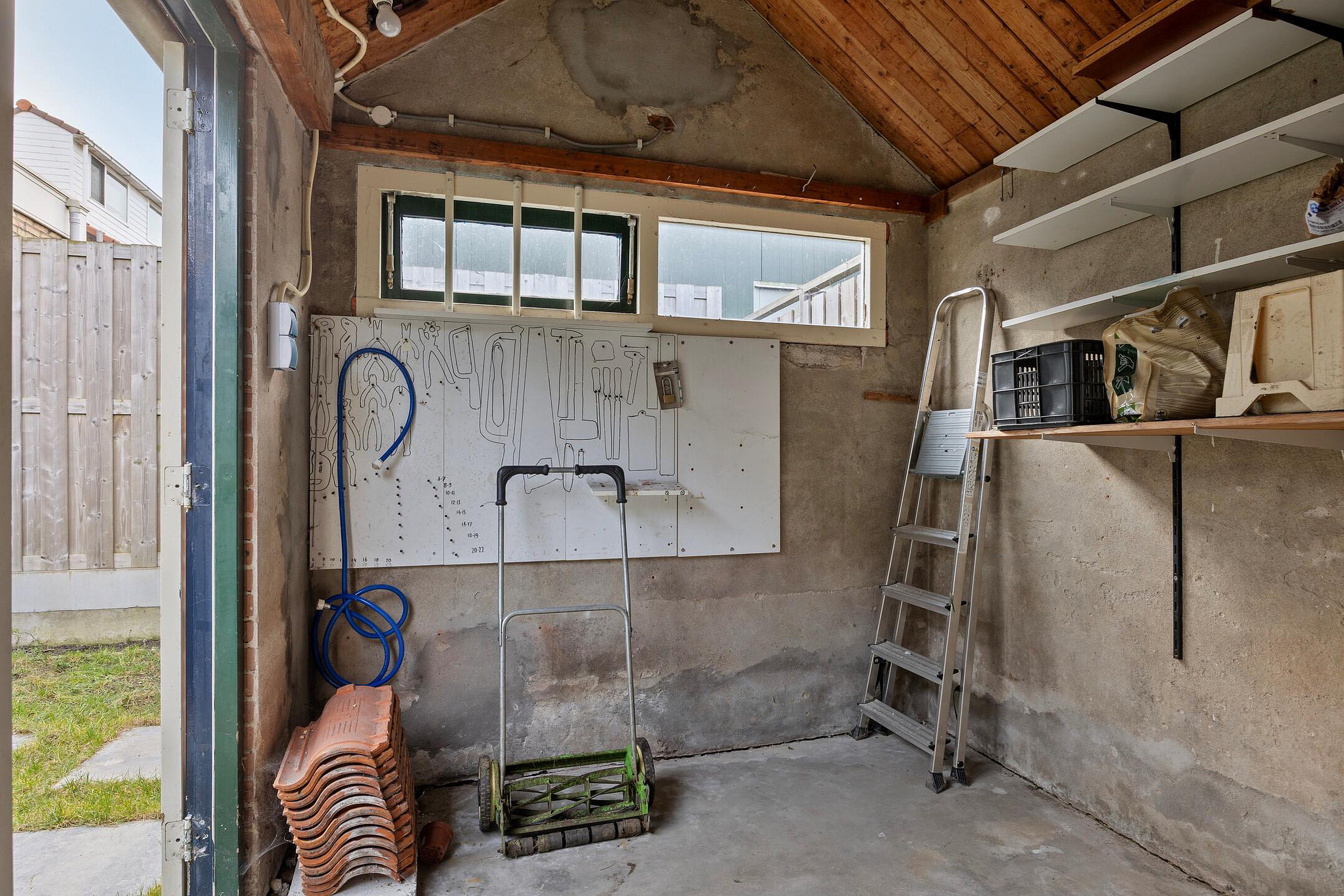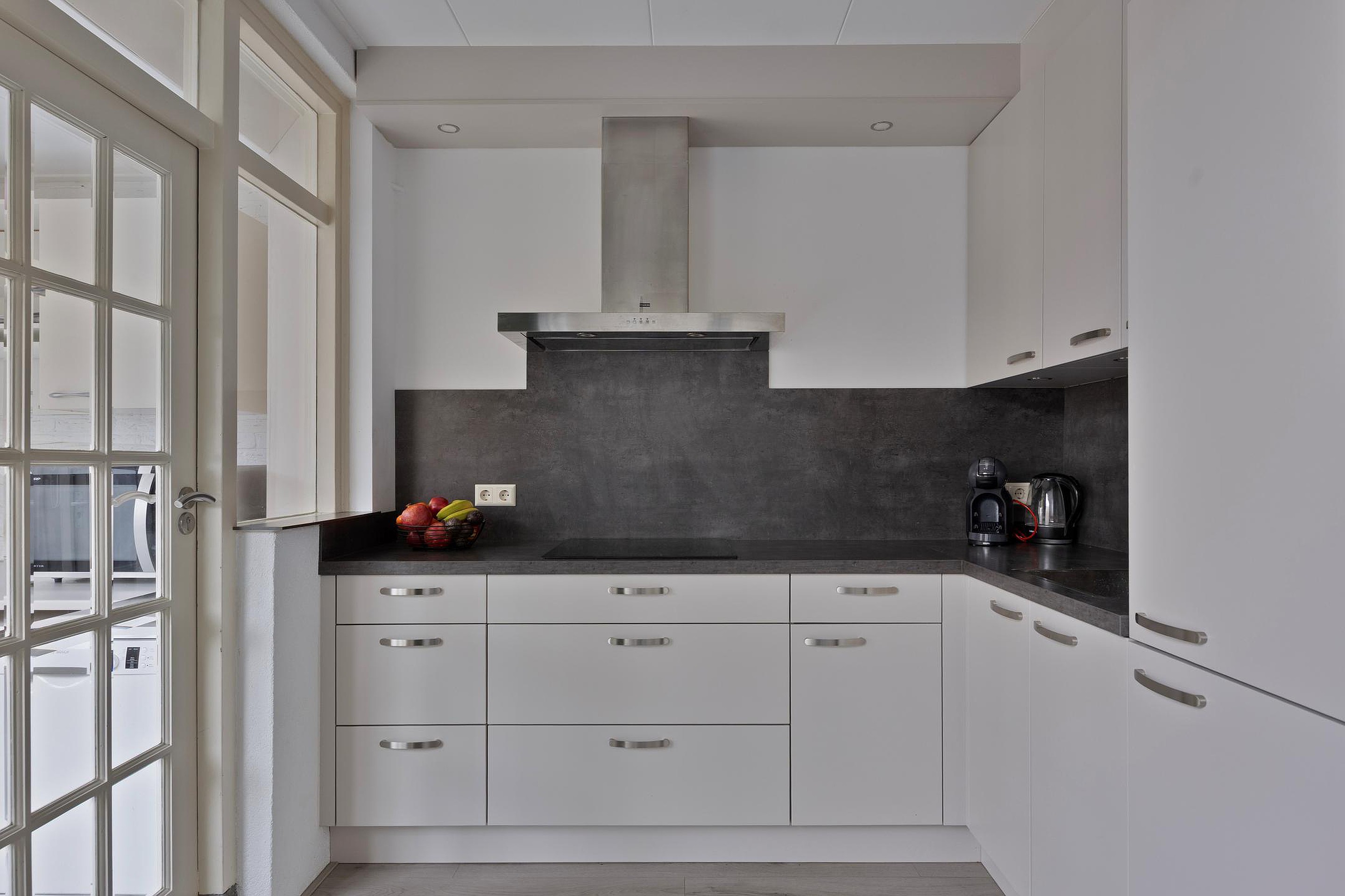 4-pits inductie kookplaat, afzuigkap, koelkast en vriezer en vaatwasser. Vanuit de keuken heeft u toegang tot de bijkeuken met opstelplaats voor de wasmachine en de vaatwasser. De HR-combiketel (Remeha 2015) is weggewerkt in een kast in de bijkeuken. De bijkeuken geeft toegang tot de zonnige tuin met achterom en vrijstaande stenen berging.