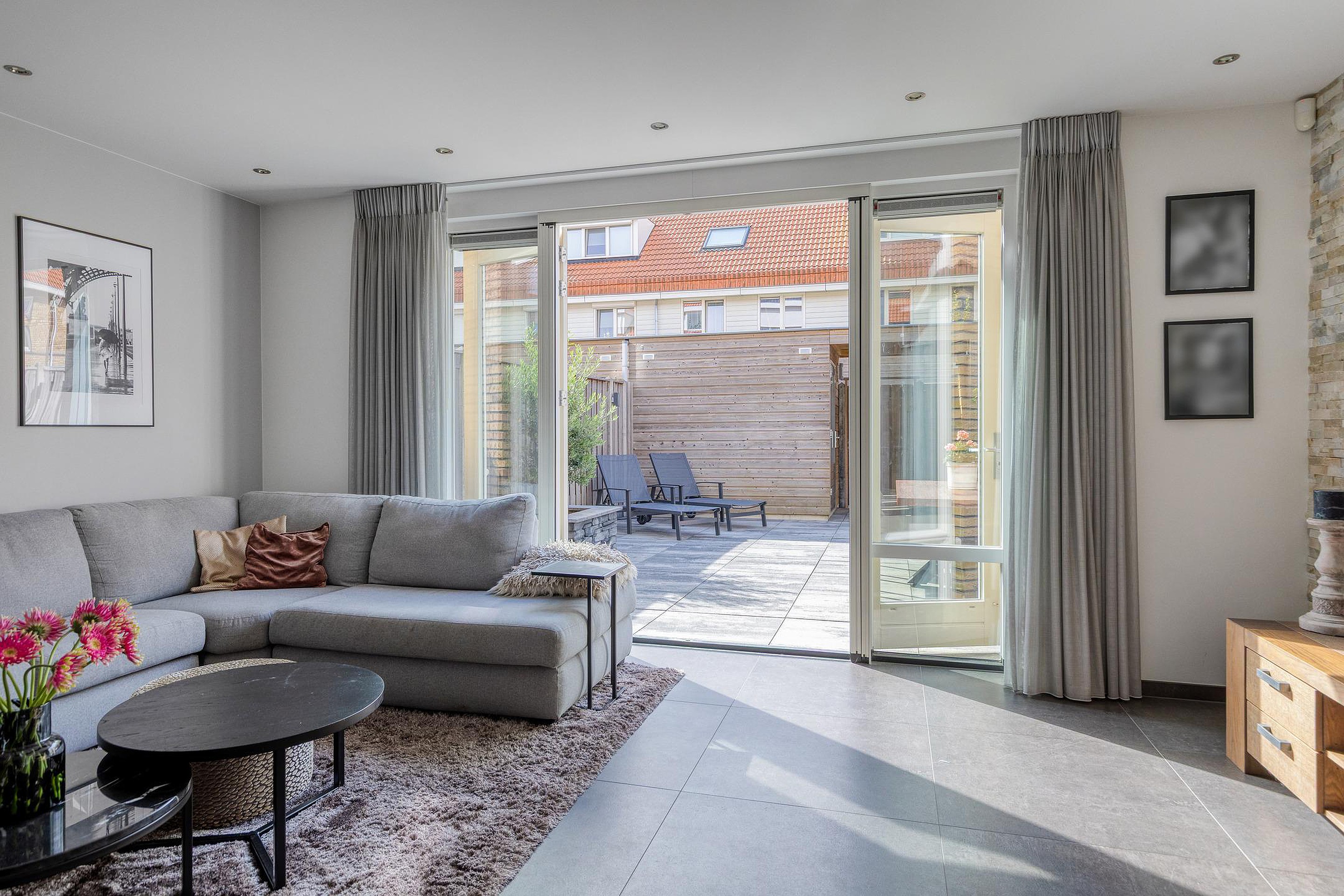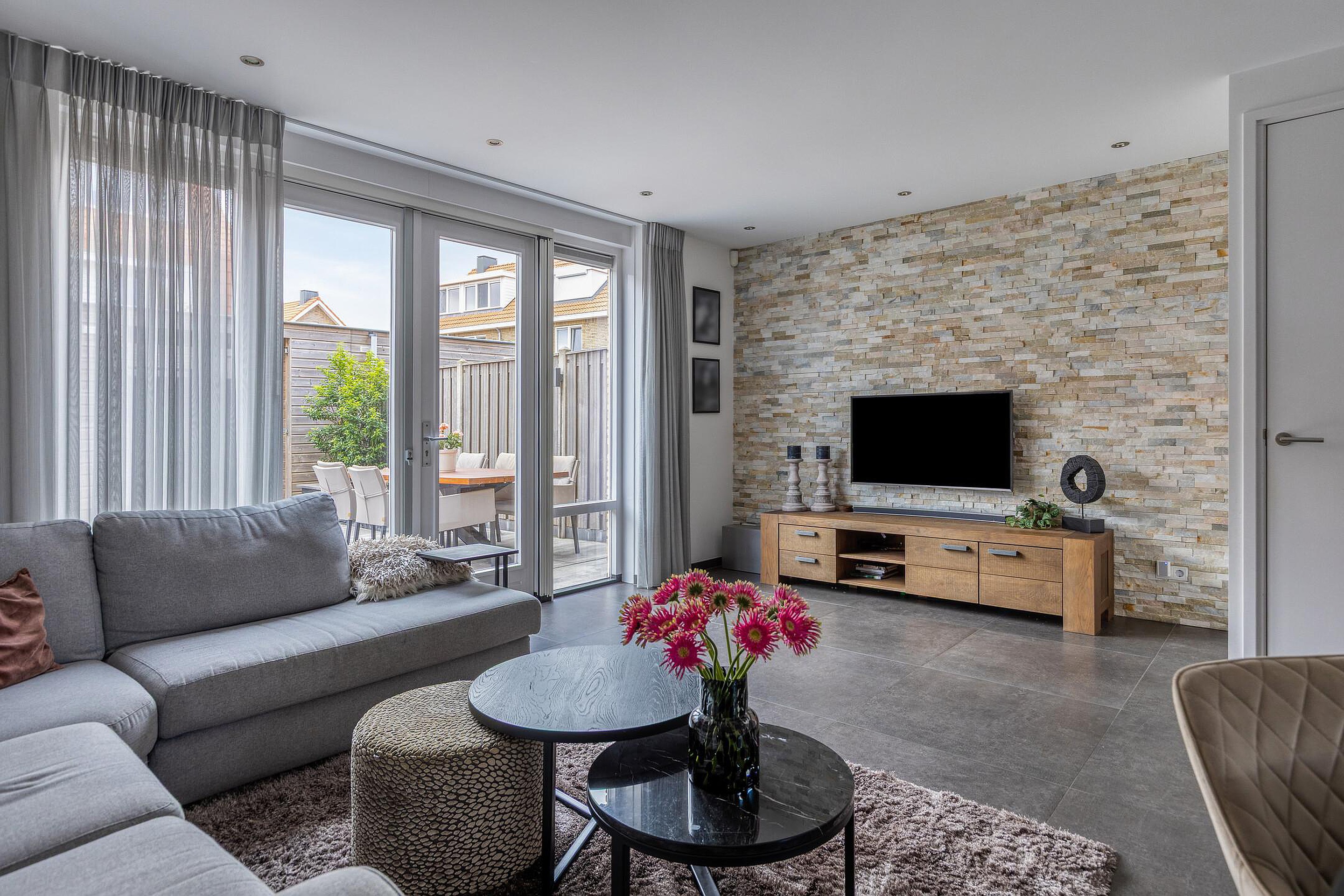 De woonkamer is voorzien van een praktische trapkast en heeft aan de achterzijde een groot raampartij met openslaande deuren naar de zonnige achtertuin.